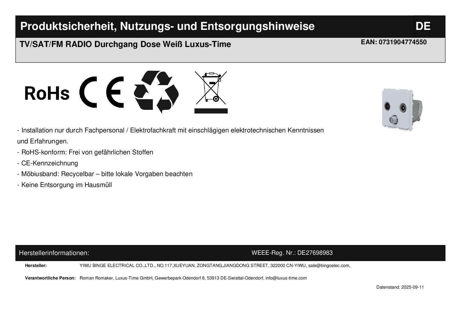 TV-SAT-FM Durchgangsmodul in Weiß Bitte beachten Sie, dass es sich bei diesem Angebot nur um das Modul OHNE Glasrahmen handelt. Bei diesem Modul handelt es sich um eine Durchgangsdose, die zur Weiterleitung geeignet ist. Dieses Modul findet Verwendung, wenn Sie eine Satellitenschüssel oder einen Kabelanschluss nutzen. Einfache und schnelle Montage, sowohl vertikal als auch horizontal . Der Austausch erfolgt wie bei anderen Wipp-Schalter-Herstellern. Ersetzen Sie einfach Ihre alten Wipp-Schalter durch ein neues, langlebiges Design. Die Lichtschalter- und Steckdosen-Module sind für Unterputzdosen mit 60 mm Durchmesser geeignet . Die Module werden mittels der den Glasblenden beiliegenden Metallrahmen durch Schrauben an den Unterputzdosen befestigt. Bei uns erhalten Sie die komplette Luxus-Time Bandbreite; von einem einfachen Wipp-Lichtschalter bis zum smarthome-fähigen Touch-Rollladenschalter. Fragen? Rufen Sie uns an oder senden Sie uns eine E-Mail. Wir beraten Sie gerne! Abmessungen:Innenleben 48 mm x 24 mm x 25 mm Herstellerangaben:YIWU BINGE ELECTRICAL CO.,LTD.
