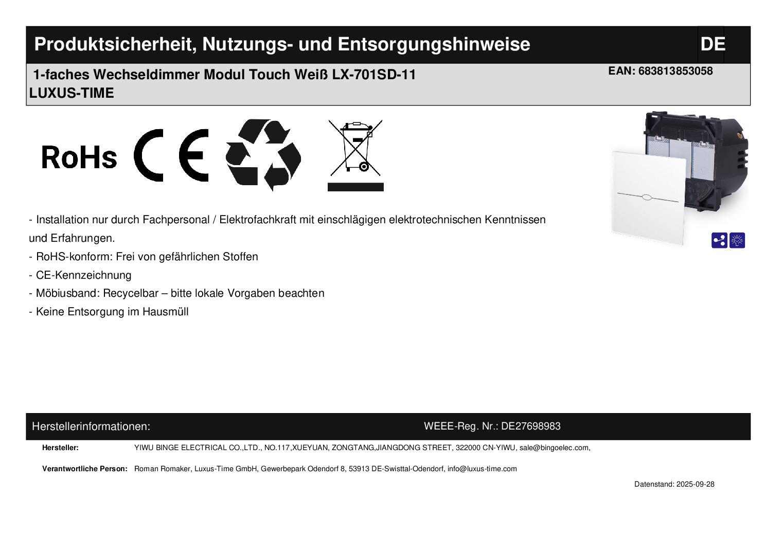 Dies ist ein einfaches Luxus-Time Wechseldimmer-Modul inkl. Touchfeld.Bitte beachten Sie, dass es sich bei diesem Angebot nur um das Touch-Wechseldimmer-Modul OHNE Glasrahmen handelt. Die Glasabdeckung des Touch-Moduls ist Bestandteil des Lieferumfangs. Dies ist ein Luxus-Time Touch-Wechseldimmer zum einfachen ein- und auszuschalten und dimmen von einer Leuchte. Zusätzlich verfügt dieser Schalter auch noch über eine Wechselschalt-Funktion, wodurch Sie die Leuchte auch von unterschiedlichen Schaltern aus bedienen können. Bitte beachten Sie, dass innerhalb der Wechselschaltung ausschließlich Luxus Time Wechseldimmer verwendet werden müssen. Einfache und schnelle Montage, sowohl vertikal als auch horizontal . Alle Touch-Schalter sind beleuchtet . Wenn die angeschlossene Leuchte ausgeschaltet ist, leuchtet der Schalter schwach blau, wenn die Leuchte eingeschaltet ist, leuchtet der Schalter in einem stärkeren Blau. Die Touch-Schalter sind mit allen Arten von Leuchten verwendbar (Halogen, LED, Energiesparlampen), außer LED-Strips . Bei LED-Strips ist die Watt-Zahl in den meisten Fällen zu gering und kann dadurch zu Problemen führen. Sollten Sie Probleme wie z. B. Flackern von Leuchten bzw. das die Leuchten nach kurzer Zeit von alleine wieder ausschalten, haben, können Sie einen Widerstand-Adapter verwenden. Der Austausch erfolgt wie bei anderen Wipp-Schalter-Herstellern. Ersetzen Sie einfach Ihre alten Wipp-Schalter durch ein neues, langlebiges Design. Die Lichtschalter- und Steckdosen-Module sind für Unterputzdosen mit 60 mm Durchmesser geeignet . Die Module werden mittels der den Glasblenden beiliegenden Metallrahmen durch Schrauben an den Unterputzdosen befestigt. Bei uns erhalten Sie die komplette Luxus-Time Bandbreite; von einem einfachen Wipp-Lichtschalter bis zum smarthome-fähigen Touch-Rollladenschalter. Hinweis zur Installation: Lichtschalter stromlos anschließen. Glasblende aufsetzen. Wichtig!!! Strom erst einschalten, wenn die Glasblende aufgesetzt wurde. Sollte dieser Hinweis nicht beachtet werden, kann es vorkommen, dass der Lichtschalter nicht reagiert. Fragen? Rufen Sie uns an oder senden Sie uns eine E-Mail. Wir beraten Sie gerne! Technische Daten Abmessungen: 48 mm x 48 mm x 25 mm Betriebsspannung: AC110 ~ 250V, 50Hz60Hz max. Stromzufuhr für jeden Gang 2.5 A max. Leistung für jeden Gang: 200W Ruhestromverbrauch: weniger als 0,1mW Lebensdauer: 100.000 Benutzungen Montage in Standard UP-Dose mit Durchmesser von 60mm mit Schraubgewinde Herstellerangaben:YIWU BINGE ELECTRICAL CO.,LTD.