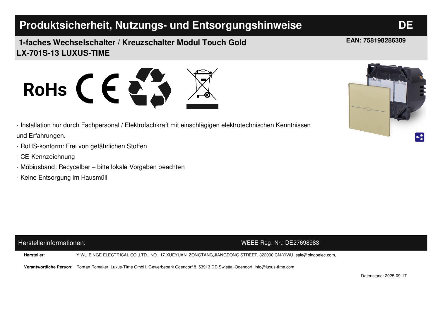 Dies ist ein einfaches Luxus-Time Wechsel-/Kreuzschalter-Modul inkl. schwarzem Touchfeld. Bitte beachten Sie, dass es sich bei diesem Angebot nur um das Touch-Wechselschalter-Modul OHNE Glasrahmen handelt. Die Glasabdeckung des Touch-Moduls ist Bestandteil des Lieferumfangs. Dies ist ein Luxus-Time Touch-Wechselschalter zum einfachen ein- und auszuschalten von einer Leuchte. Zusätzlich verfügt dieser Schalter auch noch über eine Wechselschalt-Funktion, wodurch Sie die Leuchte auch von unterschiedlichen Schaltern aus bedienen können. Bei Touch-Wechselschaltern werden keine zusätzlichen Kreuzschalter benötigt , da die Touch-Wechselschalter diese Funktion übernehmen. Wir möchten darauf hinweisen, dass innerhalb einer Wechselschaltung entweder nur Wipp- oder nur Touch-Schalter verwendet werden können. Einfache und schnelle Montage, sowohl vertikal als auch horizontal . Alle Touch-Schalter sind beleuchtet . Wenn die angeschlossene Leuchte ausgeschaltet ist, leuchtet der Schalter schwach blau, wenn die Leuchte eingeschaltet ist, leuchtet der Schalter in einem stärkeren Blau. Die Touch-Schalter sind mit allen Arten von Leuchten verwendbar (Halogen, LED, Energiesparlampen), außer LED-Strips . Bei LED-Strips ist die Watt-Zahl in den meisten Fällen zu gering und kann dadurch zu Problemen führen. Sollten Sie Probleme wie z. B. Flackern von Leuchten bzw. das die Leuchten nach kurzer Zeit von alleine wieder ausschalten, haben, sollten Sie die angeschlossene Watt-Leistung erhöhen. Der Austausch erfolgt wie bei anderen Wipp-Schalter-Herstellern. Ersetzen Sie einfach Ihre alten Wipp-Schalter durch ein neues, langlebiges Design. Die Lichtschalter- und Steckdosen-Module sind für Unterputzdosen mit 60 mm Durchmesser geeignet . Die Module werden mittels der den Glasblenden beiliegenden Metallrahmen durch Schrauben an den Unterputzdosen befestigt. Bei uns erhalten Sie die komplette Luxus-Time Bandbreite; von einem einfachen Wipp-Lichtschalter bis zum smarthome-fähigen Touch-Rollladenschalter. Hinweis zur Installation: Lichtschalter stromlos anschließen. Glasblende aufsetzen. Wichtig!!! Strom erst einschalten, wenn die Glasblende aufgesetzt wurde. Sollte dieser Hinweis nicht beachtet werden, kann es vorkommen, dass der Lichtschalter nicht reagiert. Fragen? Rufen Sie uns an oder senden Sie uns eine E-Mail. Wir beraten Sie gerne! Technische Daten :Abmessungen: 48 mm x 48 mm x 25 mm Betriebsspannung: AC110 ~ 250V, 50Hz60Hz max. Stromzufuhr für jeden Gang 2.5 A max. Leistung für jeden Gang: 600W Ruhestromverbrauch: weniger als 0,1mW Lebensdauer: 100.000 Benutzungen Montage in Standard UP-Dose mit Durchmesser von 60mm mit Schraubgewinde Herstellerangaben:YIWU BINGE ELECTRICAL CO.,LTD.