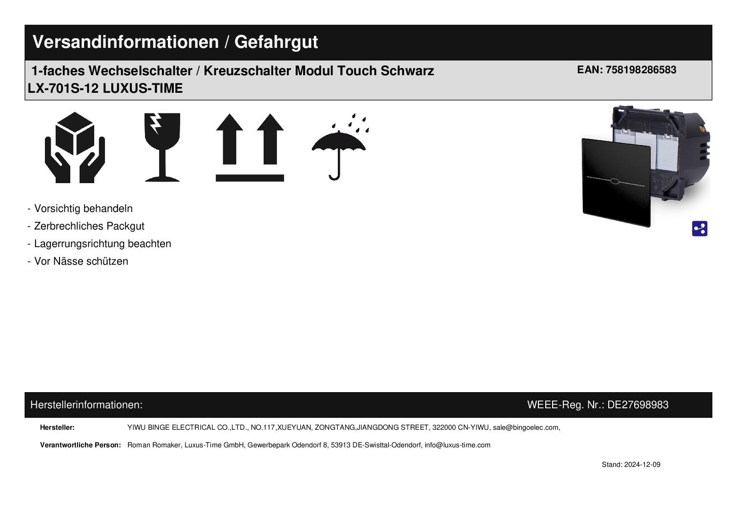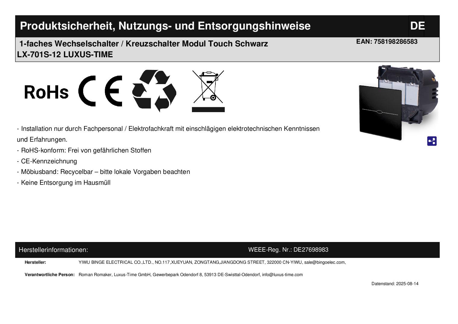 Dies ist ein einfaches Luxus-Time Wechsel-/Kreuzschalter-Modul inkl. schwarzem Touchfeld.Bitte beachten Sie, dass es sich bei diesem Angebot nur um das Touch-Wechselschalter-Modul OHNE Glasrahmen handelt. Die Glasabdeckung des Touch-Moduls ist Bestandteil des Lieferumfangs. Dies ist ein Luxus-Time Touch-Wechselschalter zum einfachen ein- und auszuschalten von einer Leuchte. Zusätzlich verfügt dieser Schalter auch noch über eine Wechselschalt-Funktion, wodurch Sie die Leuchte auch von unterschiedlichen Schaltern aus bedienen können. Bei Touch-Wechselschaltern werden keine zusätzlichen Kreuzschalter benötigt, da die Touch-Wechselschalter diese Funktion übernehmen. Wir möchten darauf hinweisen, dass innerhalb einer Wechselschaltung entweder nur Wipp- oder nur Touch-Schalter verwendet werden können. Einfache und schnelle Montage, sowohl vertikal als auch horizontal . Alle Touch-Schalter sind beleuchtet . Wenn die angeschlossene Leuchte ausgeschaltet ist, leuchtet der Schalter schwach blau, wenn die Leuchte eingeschaltet ist, leuchtet der Schalter in einem stärkeren Blau. Die Touch-Schalter sind mit allen Arten von Leuchten verwendbar (Halogen, LED, Energiesparlampen), außer LED-Strips . Bei LED-Strips ist die Watt-Zahl in den meisten Fällen zu gering und kann dadurch zu Problemen führen. Sollten Sie Probleme wie z. B. Flackern von Leuchten bzw. das die Leuchten nach kurzer Zeit von alleine wieder ausschalten, haben, sollten Sie die angeschlossene Watt-Leistung erhöhen. Der Austausch erfolgt wie bei anderen Wipp-Schalter-Herstellern. Ersetzen Sie einfach Ihre alten Wipp-Schalter durch ein neues, langlebiges Design. Die Lichtschalter- und Steckdosen-Module sind für Unterputzdosen mit 60 mm Durchmesser geeignet . Die Module werden mittels der den Glasblenden beiliegenden Metallrahmen durch Schrauben an den Unterputzdosen befestigt. Bei uns erhalten Sie die komplette Luxus-Time Bandbreite; von einem einfachen Wipp-Lichtschalter bis zum smarthome-fähigen Touch-Rollladenschalter. Hinweis zur Installation: Lichtschalter stromlos anschließen. Glasblende aufsetzen. Wichtig!!! Strom erst einschalten, wenn die Glasblende aufgesetzt wurde. Sollte dieser Hinweis nicht beachtet werden, kann es vorkommen, dass der Lichtschalter nicht reagiert. Fragen? Rufen Sie uns an oder senden Sie uns eine E-Mail. Wir beraten Sie gerne! Technische Daten :Abmessungen: 48 mm x 48 mm x 25 mm Betriebsspannung: AC110 ~ 250V, 50Hz60Hz max. Stromzufuhr für jeden Gang 2.5 A max. Leistung für jeden Gang: 600W Ruhestromverbrauch: weniger als 0,1mW Lebensdauer: 100.000 Benutzungen Montage in Standard UP-Dose mit Durchmesser von 60mm mit Schraubgewinde