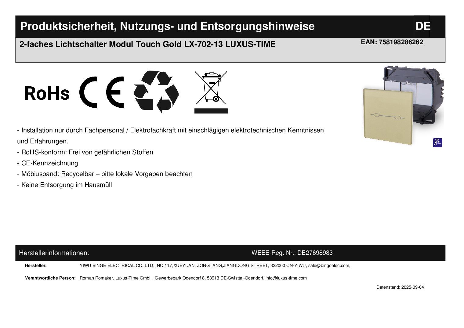 Dies ist ein zweifaches Luxus-Time Lichtschalter-Modul inkl. schwarzem Touchfeld. Bitte beachten Sie, dass es sich bei diesem Angebot nur um das Touch-Serienschalter-Modul OHNE Glasrahmen handelt. Die Glasabdeckung des Touch-Moduls ist Bestandteil des Lieferumfangs. Dies ist ein Luxus-Time Touch-Serienschalter zum einfachen ein- und auszuschalten einer Leuchte. Einfache und schnelle Montage, sowohl vertikal als auch horizontal . Alle Touch-Schalter sind beleuchtet . Wenn die angeschlossene Leuchte ausgeschaltet ist, leuchtet der Schalter schwach blau, wenn die Leuchte eingeschaltet ist, leuchtet der Schalter in einem stärkeren Blau. Die Touch-Schalter sind mit allen Arten von Leuchten verwendbar (Halogen, LED, Energiesparlampen), außer LED-Strips . Bei LED-Strips ist die Watt-Zahl in den meisten Fällen zu gering und kann dadurch zu Problemen führen. Sollten Sie Probleme wie z. B. Flackern von Leuchten bzw. das die Leuchten nach kurzer Zeit von alleine wieder ausschalten, haben, sollten Sie die angeschlossene Watt-Leistung erhöhen. Der Austausch erfolgt wie bei anderen Wipp-Schalter-Herstellern. Ersetzen Sie einfach Ihre alten Wipp-Schalter durch ein neues, langlebiges Design. Die Lichtschalter- und Steckdosen-Module sind für Unterputzdosen mit 60 mm Durchmesser geeignet . Die Module werden mittels der den Glasblenden beiliegenden Metallrahmen durch Schrauben an den Unterputzdosen befestigt. Bei uns erhalten Sie die komplette Luxus-Time Bandbreite; von einem einfachen Wipp-Lichtschalter bis zum smarthome-fähigen Touch-Rollladenschalter. Hinweis zur Installation: Lichtschalter stromlos anschließen. Glasblende aufsetzen. Wichtig!!! Strom erst einschalten, wenn die Glasblende aufgesetzt wurde. Sollte dieser Hinweis nicht beachtet werden, kann es vorkommen, dass der Lichtschalter nicht reagiert. Fragen? Rufen Sie uns an oder senden Sie uns eine E-Mail. Wir beraten Sie gerne! Technische Daten :Abmessungen: 48 mm x 48 mm x 25 mm Betriebsspannung: AC110 ~ 250V, 50Hz60Hz max. Stromzufuhr für jeden Gang 2.5 A max. Leistung für jeden Gang: 800W Ruhestromverbrauch: weniger als 0,1mW Lebensdauer: 100.000 Benutzungen Montage in Standard UP-Dose mit Durchmesser von 60mm mit Schraubgewinde Herstellerangaben:YIWU BINGE ELECTRICAL CO.,LTD.