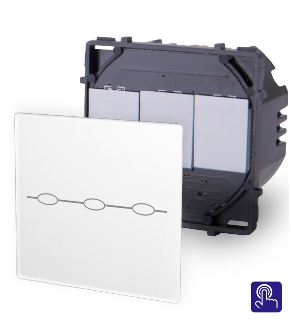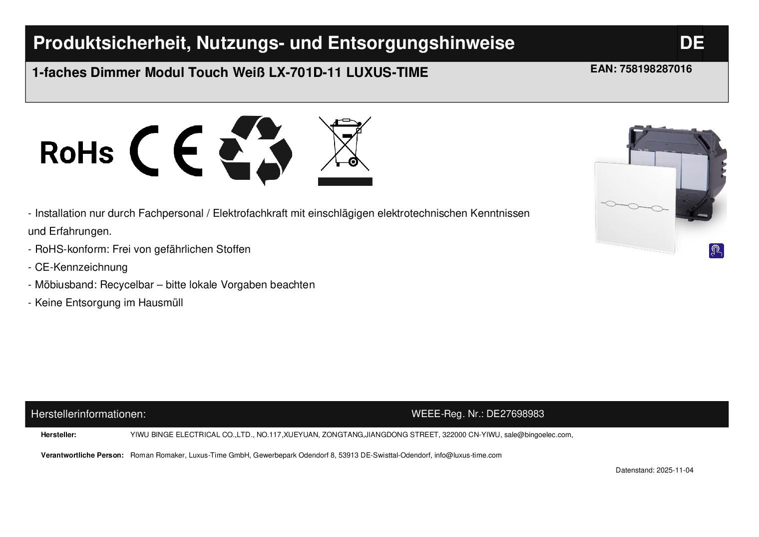 Dies ist ein einfaches Luxus-Time Touch-Dimmer-Modul inkl. weißem Touchfeld. Bitte beachten Sie, dass es sich bei diesem Angebot nur um das Touch-Dimmer-Modul OHNE Glasrahmen handelt. Die Glasabdeckung des Touch-Moduls ist Bestandteil des Lieferumfangs. Dies ist ein Luxus-Time Touch-Dimmer zum einfachen ein- und ausschalten sowie dimmen einer Leuchte. Einfache und schnelle Montage, sowohl vertikal als auch horizontal . Alle Touch-Schalter sind beleuchtet . Wenn die angeschlossene Leuchte ausgeschaltet ist, leuchtet der Schalter schwach blau, wenn die Leuchte eingeschaltet ist, leuchtet der Schalter in einem stärkeren Blau. Die Touch-Schalter sind mit allen Arten von Leuchten verwendbar (Halogen, LED, Energiesparlampen), außer LED-Strips . Bei LED-Strips ist die Watt-Zahl in den meisten Fällen zu gering und kann dadurch zu Problemen führen. Sollten Sie Probleme wie z. B. Flackern von Leuchten bzw. das die Leuchten nach kurzer Zeit von alleine wieder ausschalten, haben, können Sie einen Widerstand-Adapter verwenden. Der Austausch erfolgt wie bei anderen Wipp-Schalter-Herstellern. Ersetzen Sie einfach Ihre alten Wipp-Schalter durch ein neues, langlebiges Design. Die Lichtschalter- und Steckdosen-Module sind für Unterputzdosen mit 60 mm Durchmesser geeignet . Die Module werden mittels der den Glasblenden beiliegenden Metallrahmen durch Schrauben an den Unterputzdosen befestigt. Bei uns erhalten Sie die komplette Luxus-Time Bandbreite; von einem einfachen Wipp-Lichtschalter bis zum smarthome-fähigen Touch-Rollladenschalter. Hinweis zur Installation: Lichtschalter stromlos anschließen. Glasblende aufsetzen. Wichtig!!! Strom erst einschalten, wenn die Glasblende aufgesetzt wurde. Sollte dieser Hinweis nicht beachtet werden, kann es vorkommen, dass der Lichtschalter nicht reagiert. Fragen? Rufen Sie uns an oder senden Sie uns eine E-Mail. Wir beraten Sie gerne! Technische Daten :Abmessungen: 48 mm x 48 mm x 25 mm Betriebsspannung: AC110 ~ 250V, 50Hz60Hz max. Stromzufuhr für jeden Gang 2.5 A max. Leistung für jeden Gang: 700W Ruhestromverbrauch: weniger als 0,1mW Lebensdauer: 100.000 Benutzungen Montage in Standard UP-Dose mit Durchmesser von 60mm mit Schraubgewinde Herstellerangaben:YIWU BINGE ELECTRICAL CO.,LTD.
