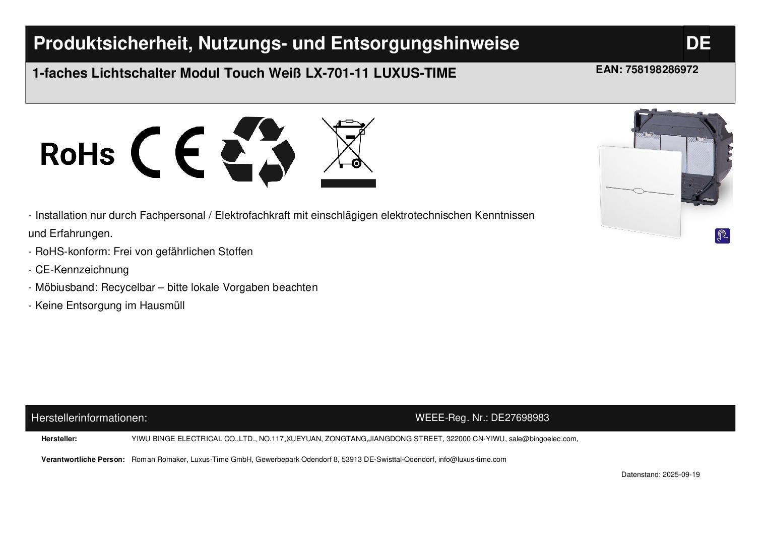 Dies ist ein einfaches Luxus-Time Lichtschalter-Modul inkl. weißem Touchfeld.Bitte beachten Sie, dass es sich bei diesem Angebot nur um das Touch-Lichtschalter-Modul OHNE Glasrahmen handelt. Die Glasabdeckung des Touch-Moduls ist Bestandteil des Lieferumfangs. Dies ist ein Luxus-Time Touch-Lichtschalter zum einfachen ein- und auszuschalten. Einfache und schnelle Montage, sowohl vertikal als auch horizontal . Alle Touch-Schalter sind beleuchtet . Wenn die angeschlossene Leuchte ausgeschaltet ist, leuchtet der Schalter schwach blau, wenn die Leuchte eingeschaltet ist, leuchtet der Schalter in einem stärkeren Blau. Die Touch-Schalter sind mit allen Arten von Leuchten verwendbar (Halogen, LED, Energiesparlampen), außer LED-Strips . Bei LED-Strips ist die Watt-Zahl in den meisten Fällen zu gering und kann dadurch zu Problemen führen. Sollten Sie Probleme wie z. B. Flackern von Leuchten bzw. das die Leuchten nach kurzer Zeit von alleine wieder ausschalten, haben, sollten Sie die angeschlossene Watt-Leistung erhöhen. Der Austausch erfolgt wie bei anderen Wipp-Schalter-Herstellern. Ersetzen Sie einfach Ihre alten Wipp-Schalter durch ein neues, langlebiges Design. Die Lichtschalter- und Steckdosen-Module sind für Unterputzdosen mit 60 mm Durchmesser geeignet . Die Module werden mittels der den Glasblenden beiliegenden Metallrahmen durch Schrauben an den Unterputzdosen befestigt. Bei uns erhalten Sie die komplette Luxus-Time Bandbreite; von einem einfachen Wipp-Lichtschalter bis zum smarthome-fähigen Touch-Rollladenschalter. Hinweis zur Installation: Lichtschalter stromlos anschließen. Glasblende aufsetzen. Wichtig!!! Strom erst einschalten, wenn die Glasblende aufgesetzt wurde. Sollte dieser Hinweis nicht beachtet werden, kann es vorkommen, dass der Lichtschalter nicht reagiert. Fragen? Rufen Sie uns an oder senden Sie uns eine E-Mail. Wir beraten Sie gerne! Technische Daten : Abmessungen: Innenleben 48 mm x 48 mm x 25 mm Betriebsspannung: AC110 ~ 250V, 50Hz60Hz max. Stromzufuhr für jeden Gang 2.5 A max. Leistung für jeden Gang: 800W Ruhestromverbrauch: weniger als 0,1mW Lebensdauer: 100.000 Benutzungen Montage in Standard UP-Dose mit Durchmesser von 60mm mit Schraubgewinde Herstellerangaben:YIWU BINGE ELECTRICAL CO.,LTD.