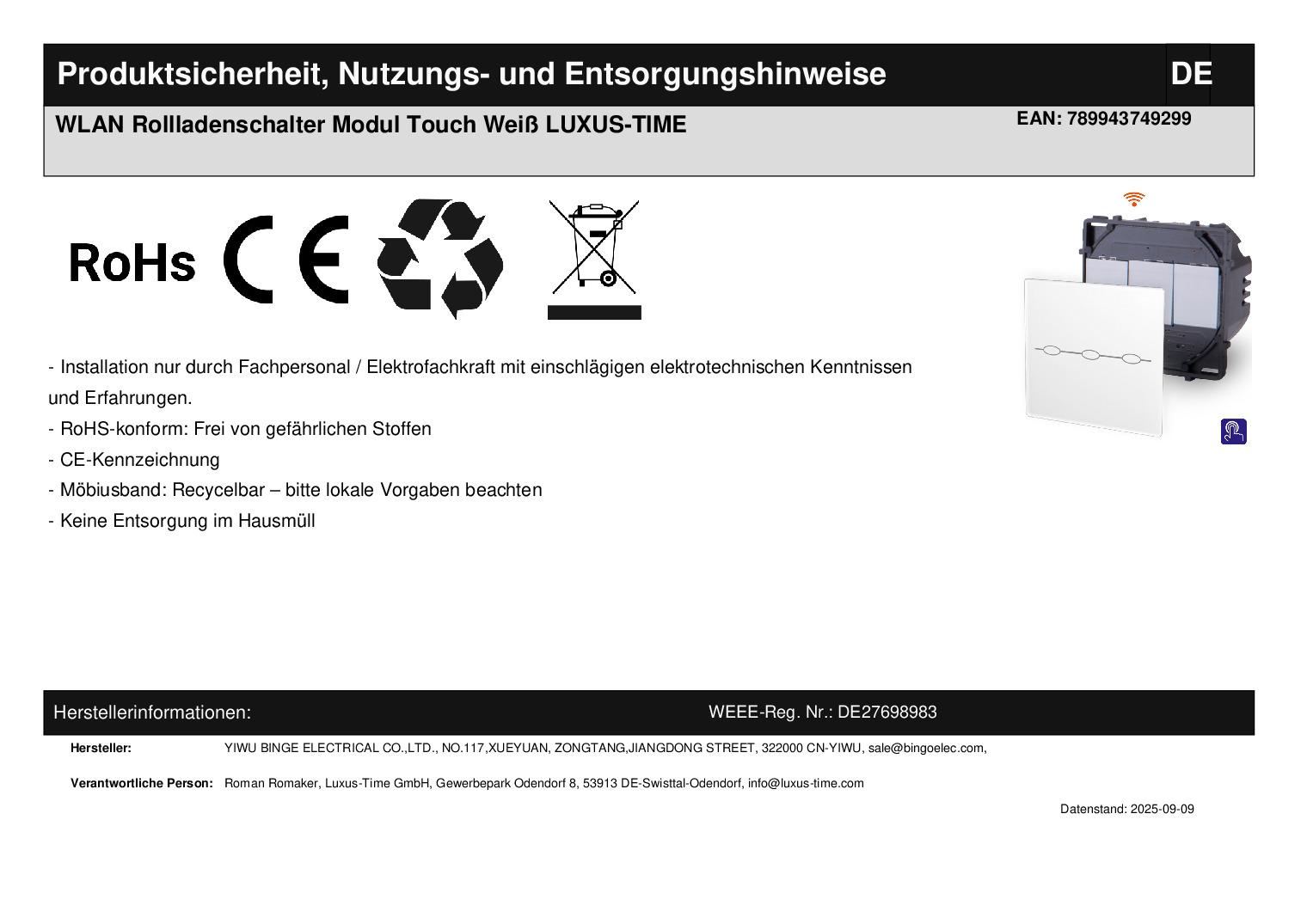 LUXUS TIME WLAN Rollladenschalter in WeißBitte beachten Sie, dass es sich bei diesem Angebot nur um das Touch-WLAN-Rollladenschalter-Modul OHNE Glasrahmen handelt. Die Glasabdeckung des Touch-Moduls ist Bestandteil des Lieferumfangs. Dies ist ein Luxus-Time Touch-WLAN-Rollladenschalter, mit dem Sie Ihre Rollladen, Jalousien oder Raffstores hoch- bzw. herunterfahren können. Zusätzlich verfügt dieser Schalter auch noch über eine WLAN-Funktion, sodass Sie den Schalter über Ihr Smartphone steuern bzw. Routinen hinterlegen können. Der WLAN-Schalter kann über die Tuya App, Amazon Alexa, Google Home oder IFTT gesteuert werden.Dieser Schalter benötigt einen Neutral- bzw. Null-Leiter . Einfache und schnelle Montage, sowohl vertikal als auch horizontal . Alle Touch-Schalter sind beleuchtet . Wenn die angeschlossene Leuchte ausgeschaltet ist, leuchtet der Schalter schwach blau, wenn die Leuchte eingeschaltet ist, leuchtet der Schalter in einem stärkeren Blau. Die Touch-Schalter sind mit allen Arten von Leuchten verwendbar (Halogen, LED, Energiesparlampen), außer LED-Strips . Bei LED-Strips ist die Watt-Zahl in den meisten Fällen zu gering und kann dadurch zu Problemen führen. Steuern Sie Ihre Tuya fähigen Produkte wie z. B. Lichtschalter, Kameras, Raumthermostate, etc. über unseren Smarten Touch Monitor. Sie können über den Monitor Szenen hinterlegen, Ihre Schalter steuern, Ihn als Tür Videotürsprechanlage nutzen oder als Schnittstelle für Zigbee und Amazon Alexa verwenden, wodurch die Nutzung eines Amazon Echos entfallen kann. Der Austausch erfolgt wie bei anderen Wipp-Schalter-Herstellern. Ersetzen Sie einfach Ihre alten Wipp-Schalter durch ein neues, langlebiges Design. Die Lichtschalter- und Steckdosen-Module sind für Unterputzdosen mit 60 mm Durchmesser geeignet . Die Module werden mittels der den Glasblenden beiliegenden Metallrahmen durch Schrauben an den Unterputzdosen befestigt. Hinweis zur Installation: Lichtschalter stromlos anschließen. Glasblende aufsetzen. Wichtig!!! Strom erst einschalten, wenn die Glasblende aufgesetzt wurde. Sollte dieser Hinweis nicht beachtet werden, kann es vorkommen, dass der Lichtschalter nicht reagiert. Fragen? Rufen Sie uns an oder senden Sie uns eine E-Mail. Wir beraten Sie gerne! Technische Daten:Abmessungen: 48 mm x 48 mm x 25 mm Betriebsspannung: 10A/AC110 ~ 250V, 50Hz60Hz max. Stromzufuhr für jeden Gang 2.5 A max. Leistung für jeden Gang: 1000W Ruhestromverbrauch: weniger als 0,1mW Lebensdauer: 100.000 Benutzungen Montage in Standard UP-Dose mit Durchmesser von 60mm mit Schraubgewinde Herstellerangaben:YIWU BINGE ELECTRICAL CO.,LTD.