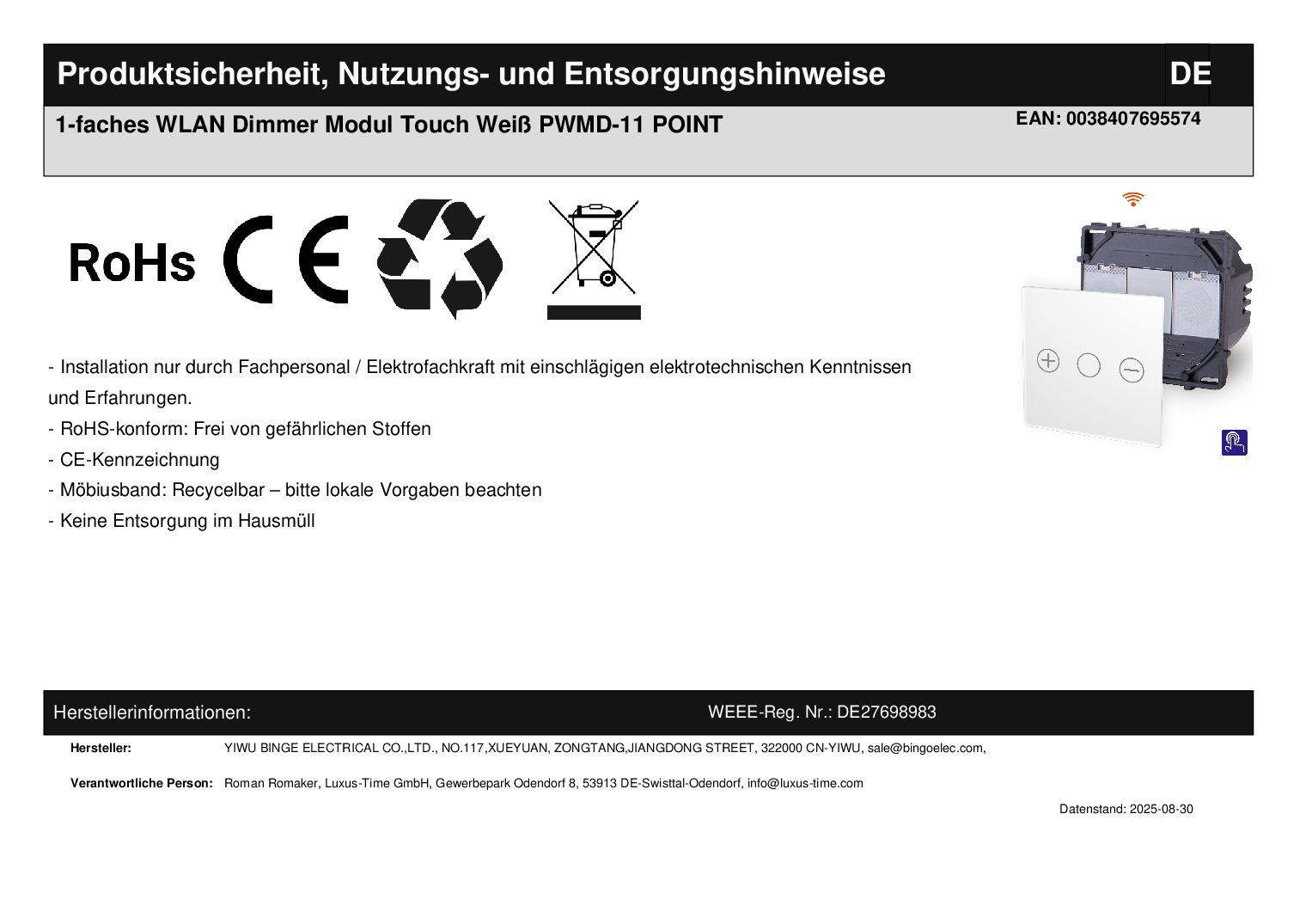 Bitte beachten Sie, dass es sich bei diesem Angebot nur um das Touch-WLAN-Dimmer-Modul OHNE Glasrahmen handelt. Die Glasabdeckung des Touch-Moduls ist Bestandteil des Lieferumfangs. Dies ist ein Point Touch-WLAN-Lichtschalter zum einfachen ein- und auszuschalten, sowie dimmen einer Leuchte. Zusätzlich verfügt dieser Schalter auch über eine WLAN-Funktion, sodass Sie den Schalter auch mit Ihrem Smartphone steuern können. Dazu können Sie die Tuya App, Amazon Alexa, Google Home oder IFTT verwenden. Zusätzlich kann der Schalter über die Tuya App als Wechselschalter definiert werden. Für die Verwendung der WLAN-Schalter ist ein Neutral- bzw. Null-Leiter notwendig . Einfache und schnelle Montage, sowohl vertikal als auch horizontal . Technische Daten: