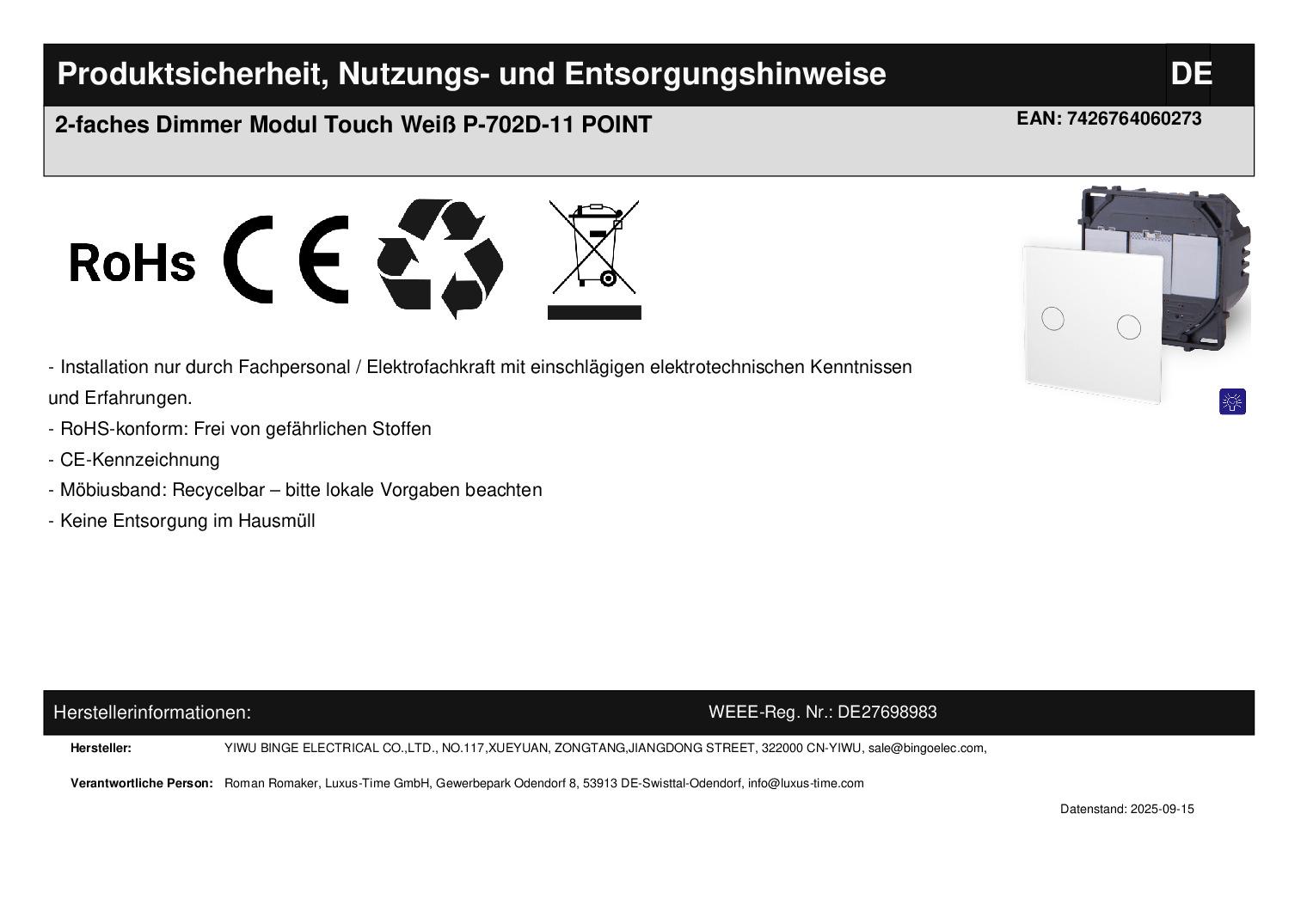 Point Seriendimmer-Modul inkl. weißem Touchfeld.Bitte beachten Sie, dass es sich bei diesem Angebot nur um das Touch-Seriendimmer-Modul OHNE Glasrahmen handelt. Die Glasabdeckung des Touch-Moduls ist Bestandteil des Lieferumfangs.Dies ist ein Point Touch-Seriendimmer zum einfachen ein- und ausschalten sowie dimmen zweier Leuchten unabhängig voneinander. Einfache und schnelle Montage, sowohl vertikal als auch horizontal . Alle Touch-Schalter sind beleuchtet . Wenn die angeschlossene Leuchte ausgeschaltet ist, leuchtet der Schalter schwach blau, wenn die Leuchte eingeschaltet ist, leuchtet der Schalter in einem stärkeren Blau. Die Touch-Schalter sind mit allen Arten von Leuchten verwendbar (Halogen, LED, Energiesparlampen), außer LED-Strips . Bei LED-Strips ist die Watt-Zahl in den meisten Fällen zu gering und kann dadurch zu Problemen führen. Sollten Sie Probleme wie z. B. Flackern von Leuchten bzw. das die Leuchten nach kurzer Zeit von alleine wieder ausschalten, haben, sollte die Watt-Leistung erhöht werden. Der Austausch erfolgt wie bei anderen Wipp-Schalter-Herstellern. Ersetzen Sie einfach Ihre alten Wipp-Schalter durch ein neues, langlebiges Design. Die Lichtschalter- und Steckdosen-Module sind für Unterputzdosen mit 60 mm Durchmesser geeignet . Die Module werden mittels der den Glasblenden beiliegenden Metallrahmen durch Schrauben an den Unterputzdosen befestigt. Bei uns erhalten Sie die komplette Point Bandbreite; von einem einfachen Wipp-Lichtschalter bis zum smarthome-fähigen Touch-Rollladenschalter. Hinweis zur Installation: Lichtschalter stromlos anschließen. Glasblende aufsetzen. Wichtig!!! Strom erst einschalten, wenn die Glasblende aufgesetzt wurde. Sollte dieser Hinweis nicht beachtet werden, kann es vorkommen, dass der Lichtschalter nicht reagiert. Fragen? Rufen Sie uns an oder senden Sie uns eine E-Mail. Wir beraten Sie gerne! Technische Daten : Abmessungen: 48 mm x 48 mm x 25 mm Betriebsspannung: AC110 ~ 250V, 50Hz60Hz max. Stromzufuhr für jeden Gang 2.5 A max. Leistung für jeden Gang: 700W Ruhestromverbrauch: weniger als 0,1mW Lebensdauer: 100.000 Benutzungen Montage in Standard UP-Dose mit Durchmesser von 60mm mit Schraubgewinde Herstellerangaben:YIWU BINGE ELECTRICAL CO.,LTD.