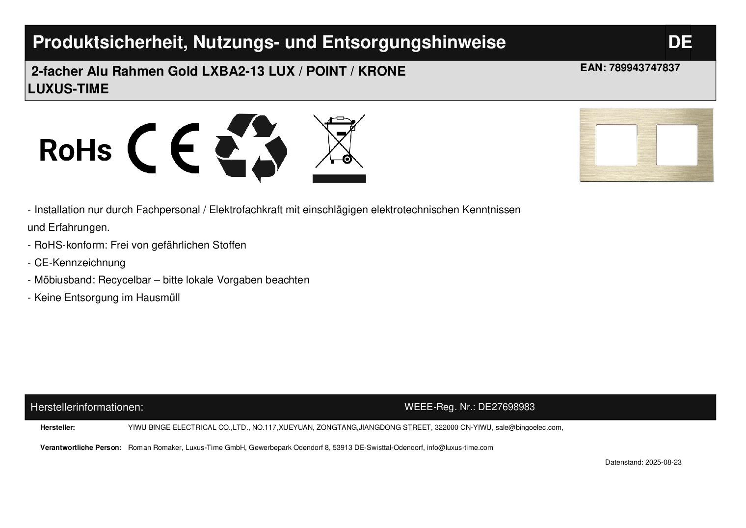 LUXUS TIME zweifacher Alu-Rahmen in Gold Bitte beachten Sie, dass es sich bei diesem Angebot nur um einen Alurahmen OHNE Modul handelt. Dies ist ein zweifacher Luxus-Time Aluminiumrahmen und kann nur für Luxus-Time bzw. Point Schalter und Steckdose verwendet werden. Das moderne Design, sowie die gebürstete Aluoberfläche in Gold machen diesen Rahmen zu etwas Besonderem. Einfache und schnelle Montage, sowohl vertikal als auch horizontal . Die Module werden mittels der den Aluminiumblenden beiliegenden Metallrahmen durch Schrauben an den Unterputzdosen befestigt. Der Austausch erfolgt wie bei anderen Wipp-Schalter-Herstellern. Ersetzen Sie einfach Ihre alten Wipp-Schalter durch ein neues, langlebiges Design. Die Lichtschalter- und Steckdosen-Module sind für Unterputzdosen mit 60 mm Durchmesser geeignet . Bei uns erhalten Sie die komplette Luxus-Time bzw. Point Bandbreite; von einem einfachen Wipp-Lichtschalter bis zum smarthome-fähigen Touch-Rollladenschalter. Fragen? Rufen Sie uns an oder senden Sie uns eine E-Mail. Wir beraten Sie gerne! Abmessungen :157 x 86 x 8 mm Herstellerangaben:YIWU BINGE ELECTRICAL CO.,LTD.