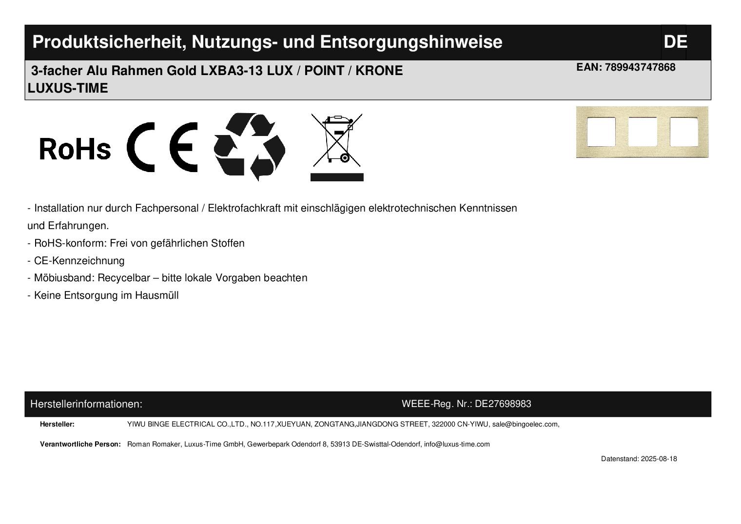 LUXUS TIME dreifacher Alu-Rahmen in GoldBitte beachten Sie, dass es sich bei diesem Angebot nur um einen Alurahmen OHNE Modul handelt. Dies ist ein dreifacher Luxus-Time Aluminiumrahmen und kann nur für Luxus-Time bzw. Point Schalter und Steckdose verwendet werden. Das moderne Design, sowie die gebürstete Aluoberfläche in Gold machen diesen Rahmen zu etwas Besonderem.Einfache und schnelle Montage, sowohl vertikal als auch horizontal . Die Module werden mittels der den Aluminiumblenden beiliegenden Metallrahmen durch Schrauben an den Unterputzdosen befestigt. Der Austausch erfolgt wie bei anderen Wipp-Schalter-Herstellern. Ersetzen Sie einfach Ihre alten Wipp-Schalter durch ein neues, langlebiges Design. Die Lichtschalter- und Steckdosen-Module sind für Unterputzdosen mit 60 mm Durchmesser geeignet . Bei uns erhalten Sie die komplette Luxus-Time bzw. Point Bandbreite; von einem einfachen Wipp-Lichtschalter bis zum smarthome-fähigen Touch-Rollladenschalter. Fragen? Rufen Sie uns an oder senden Sie uns eine E-Mail. Wir beraten Sie gerne! Abmessungen :229 x 86 x 8 mm Herstellerangaben:YIWU BINGE ELECTRICAL CO.,LTD.