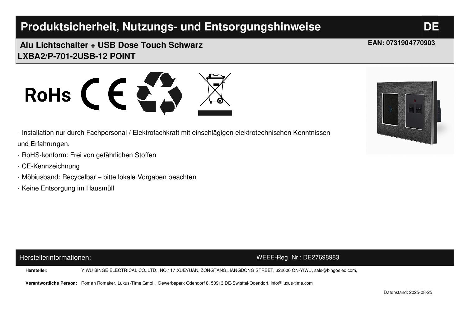 Dieser Artikel besteht aus einem schwarzen, zweifachen Aluminiumrahmen, sowie einem schwarzen Touch-Lichtschalter-Modul und einem zweifachen USB-Modul.