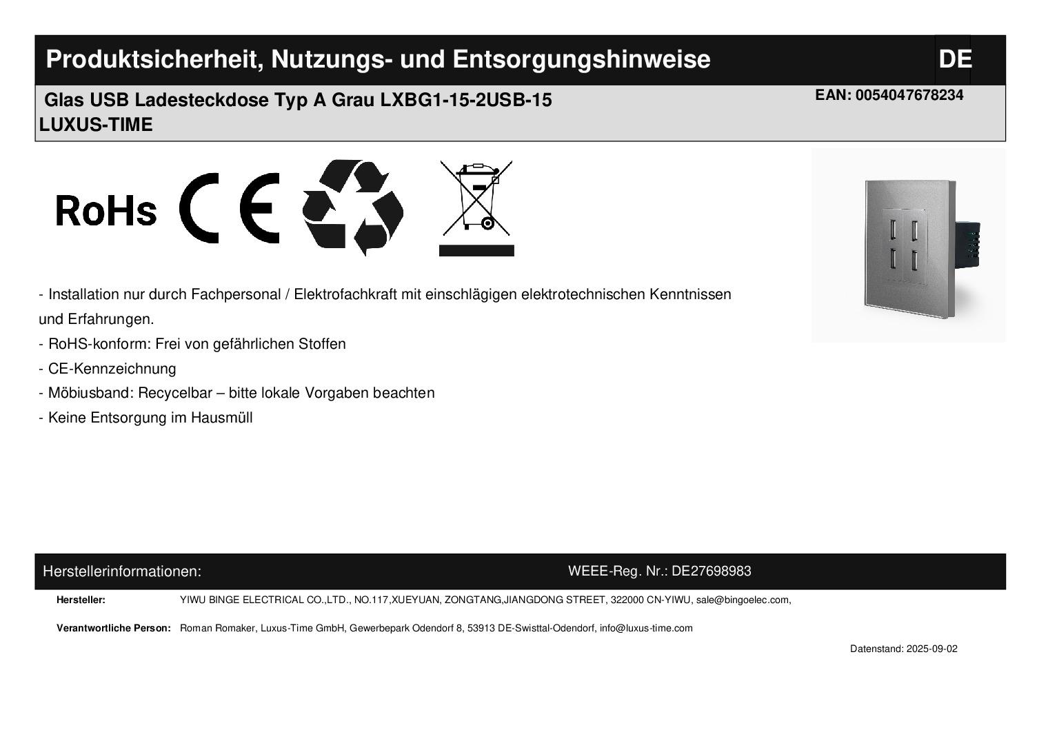 Grauer Glasrahmen mit 4 USB-A AnschlüssenDieser Artikel besteht aus einem grauen, einfachen Glasrahmen, sowie zwei halben USB-A Modulen mit jeweils 2 Anschlüssen. Bei diesem Modul handelt es sich um eine Auflade-Dose. Einfache und schnelle Montage, sowohl vertikal als auch horizontal . Der Austausch erfolgt wie bei anderen Wipp-Schalter-Herstellern. Ersetzen Sie einfach Ihre alten Wipp-Schalter durch ein neues, langlebiges Design. Die Lichtschalter- und Steckdosen-Module sind für Unterputzdosen mit 60 mm Durchmesser geeignet . Die Module werden mittels der den Glasblenden beiliegenden Metallrahmen durch Schrauben an den Unterputzdosen befestigt. Bei uns erhalten Sie die komplette Luxus-Time Bandbreite; von einem einfachen Wipp-Lichtschalter bis zum smarthome-fähigen Touch-Rollladenschalter. Fragen? Rufen Sie uns an oder senden Sie uns eine E-Mail. Wir beraten Sie gerne! Abmessungen:Innenleben 48 mm x 24 mm x 25 mm Herstellerangaben:YIWU BINGE ELECTRICAL CO.,LTD.