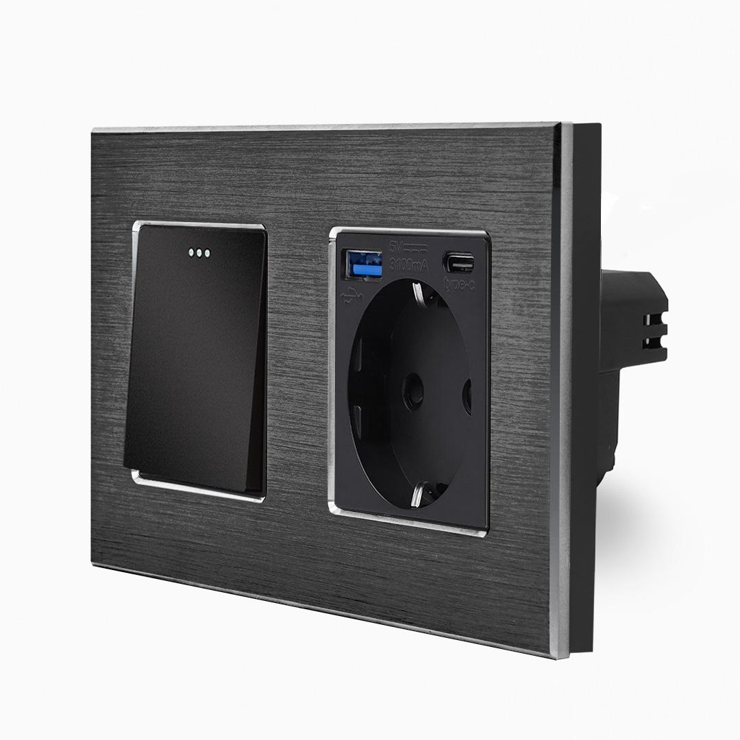 Dieser Artikel besteht aus einem schwarzen, zweifachen Aluminiumrahmen, sowie einem schwarzen Lichtschalter-Modul und einem schwarzen Steckdosen-Modul mit USB-A/C.Dies ist ein Luxus-Time Lichtschalter zum einfachen ein- und ausschalten einer Leuchte. Die Steckdose hat Schraubkontakte. Einfache und schnelle Montage, sowohl vertikal als auch horizontal . Bei uns erhalten Sie die komplette Luxus-Time Bandbreite; von einem einfachen Wipp-Lichtschalter bis zum SmartHome-fähigen Touch-Rollladenschalter. Fragen? Rufen Sie uns an oder senden Sie uns eine E-Mail. Wir beraten Sie gerne! Abmessungen: Lichtschalter Glasrahmen Technische Daten: Lichtschalter: Steckdose: Montage in Standard UP-Dose mit Durchmesser von 60mm mit Schraubgewinde Lieferumfang: Im Lieferumfang enthalten ist: Herstellerangaben:YIWU BINGE ELECTRICAL CO.,LTD.