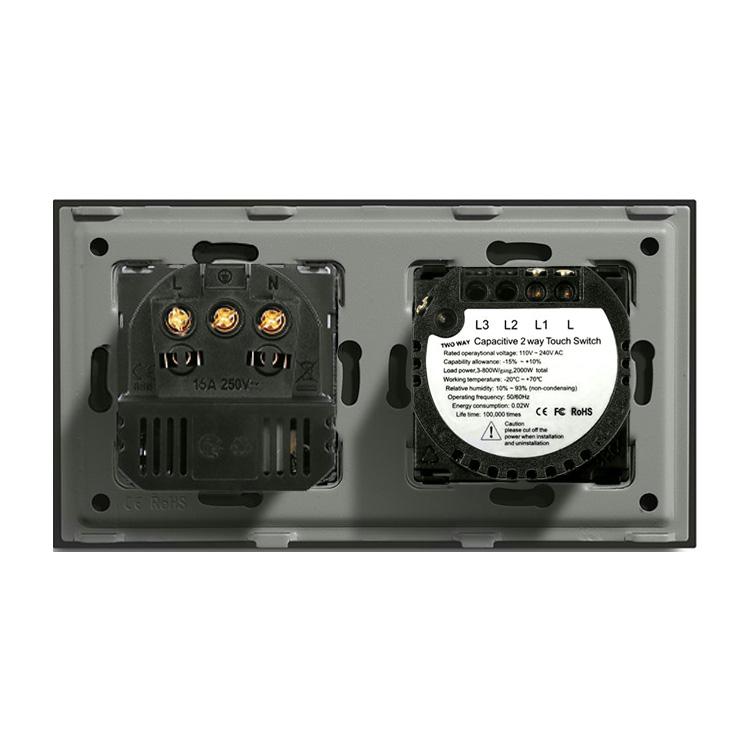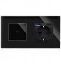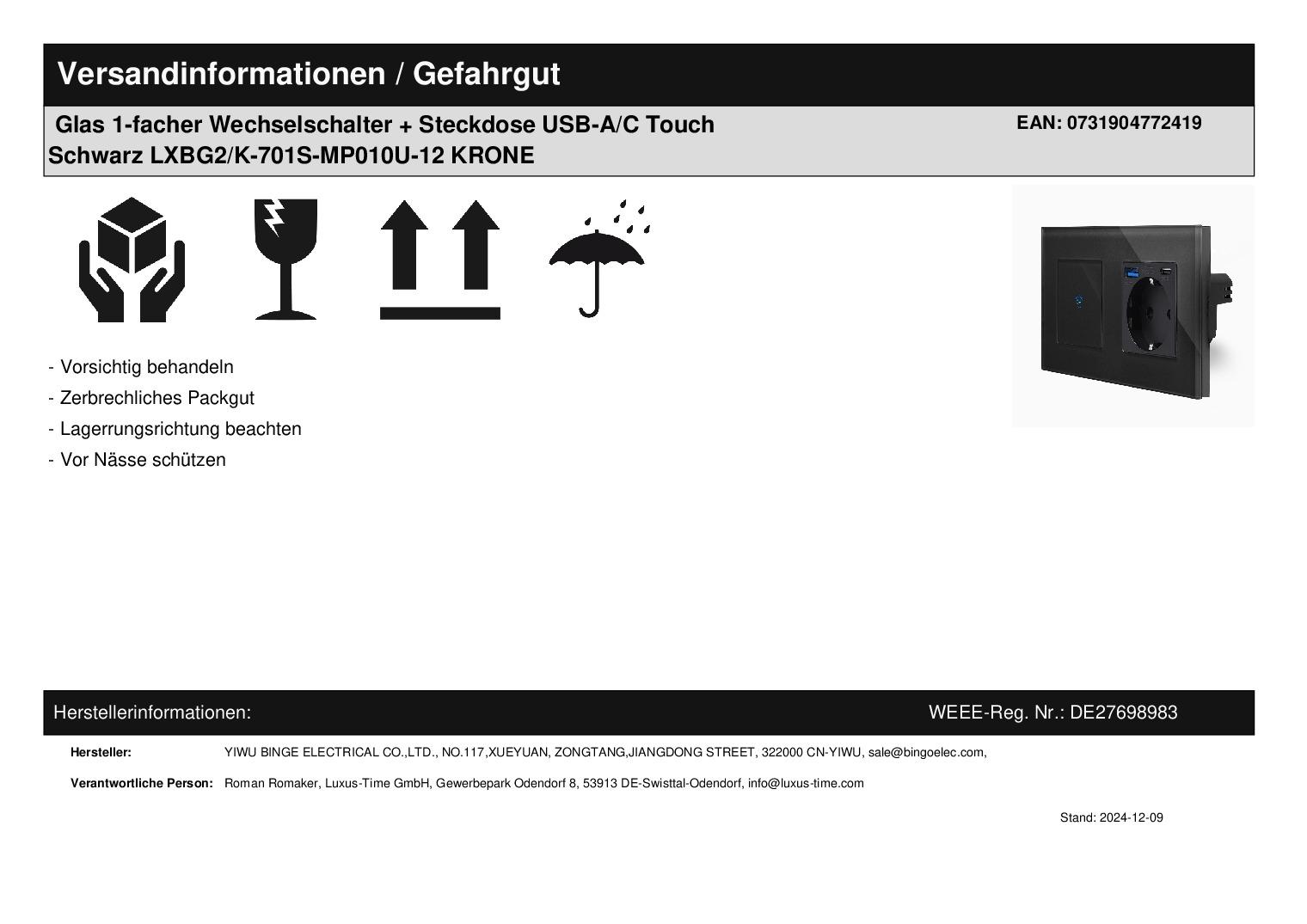 KRONE einfaches Touch-Lichtschalter-Modul und Steckdose USB-A/C mit zweifachem Glasrahmen in SchwarzDer Wechselschalter ist zum ein- und ausschalten einer Leuchte bzw. einer Lichtgruppe geeignet. Zusätzlich verfügt er noch über eine Wechselschaltungsfunktion, wodurch Sie von bis zu 4 Schaltstellen eine Leuchte bzw. Lichtgruppe ein- und ausschalten können.Diese Steckdose hat Schraubkontakte. Die eingebauten Ladepunkte für USB-C bzw. USB-A 3.0 können mit maximal 20 Watt (5V / 3100mA) Geräte aufladen. Bei Nutzung beider Ladepunkte gleichzeitig verringert sich die Leistung entsprechend. Einfache und schnelle Montage, sowohl vertikal als auch horizontal . Alle Touch-Schalter sind beleuchtet . Wenn die angeschlossene Leuchte ausgeschaltet ist, leuchtet der Schalter schwach blau, wenn die Leuchte eingeschaltet ist, leuchtet der Schalter in einem stärkeren Blau. Die Touch-Schalter sind mit allen Arten von Leuchten verwendbar (Halogen, LED, Energiesparlampen), außer LED-Strips . Bei LED-Strips ist die Watt-Zahl in den meisten Fällen zu gering und kann dadurch zu Problemen führen. Sollten Sie Probleme wie z. B. Flackern von Leuchten bzw. das die Leuchten nach kurzer Zeit von alleine wieder ausschalten, haben, sollten Sie die angeschlossene Watt-Leistung erhöhen. Der Austausch erfolgt wie bei anderen Wipp-Schalter-Herstellern. Ersetzen Sie einfach Ihre alten Wipp-Schalter durch ein neues, langlebiges Design. Die Lichtschalter- und Steckdosen-Module sind für Unterputzdosen mit 60 mm Durchmesser geeignet . Die Module werden mittels der den Glasblenden beiliegenden Metallrahmen durch Schrauben an den Unterputzdosen befestigt. Bei uns erhalten Sie die komplette KRONE Bandbreite; von einem einfachen Wipp-Lichtschalter bis zum smarthome-fähigen Touch-Rollladenschalter. Hinweis zur Installation: Lichtschalter stromlos anschließen. Glasblende aufsetzen. Wichtig!!! Strom erst einschalten, wenn die Glasblende aufgesetzt wurde. Sollte dieser Hinweis nicht beachtet werden, kann es vorkommen, dass der Lichtschalter nicht reagiert. Fragen? Rufen Sie uns an oder senden Sie uns eine E-Mail. Wir beraten Sie gerne! Technische Daten:Abmessungen: 157 x 86 x 35 mm Betriebsspannung: AC110 ~ 250V, 50Hz60Hz USB-Ladeleistung gesamt: 20W / 5V / 3100mA max. Stromzufuhr für jeden Gang 2.5 A max. Leistung für jeden Gang: 800W Ruhestromverbrauch: weniger als 0,1mW Lebensdauer: 100.000 Benutzungen Montage in Standard UP-Dose mit Durchmesser von 60mm mit Schraubgewinde Herstellerangaben:YIWU BINGE ELECTRICAL CO.,LTD.