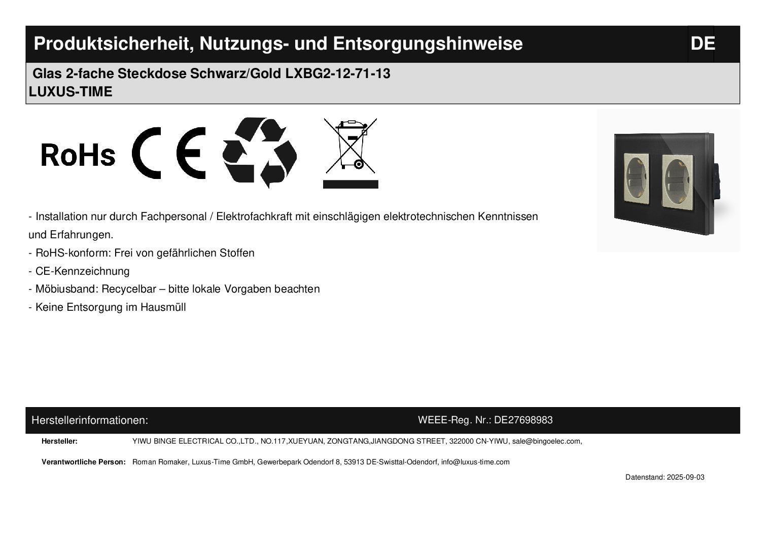 LUXUS TIME zwei goldene Steckdosen-Module mit Glasrahmen in Schwarz Dieser Artikel besteht aus einem schwarzen, zweifachen Glasrahmen, sowie zwei goldenen Steckdosen-Modulen. Diese Steckdosen-Module haben Schraubkontakte. Einfache und schnelle Montage, sowohl vertikal als auch horizontal . Der Austausch erfolgt wie bei anderen Wipp-Schalter-Herstellern. Ersetzen Sie einfach Ihre alten Wipp-Schalter durch ein neues, langlebiges Design. Die Lichtschalter- und Steckdosen-Module sind für Unterputzdosen mit 60 mm Durchmesser geeignet . Die Module werden mittels der den Glasblenden beiliegenden Metallrahmen durch Schrauben an den Unterputzdosen befestigt. Bei uns erhalten Sie die komplette Lux Bandbreite; von einem einfachen Wipp-Lichtschalter bis zum smarthome-fähigen Touch-Rollladenschalter. Fragen? Rufen Sie uns an oder senden Sie uns eine E-Mail. Wir beraten Sie gerne! Technische Daten :Betriebsspannung: 16A/250VAbmessungen: 157 x 86 x 37 mm Herstellerangaben:YIWU BINGE ELECTRICAL CO.,LTD.