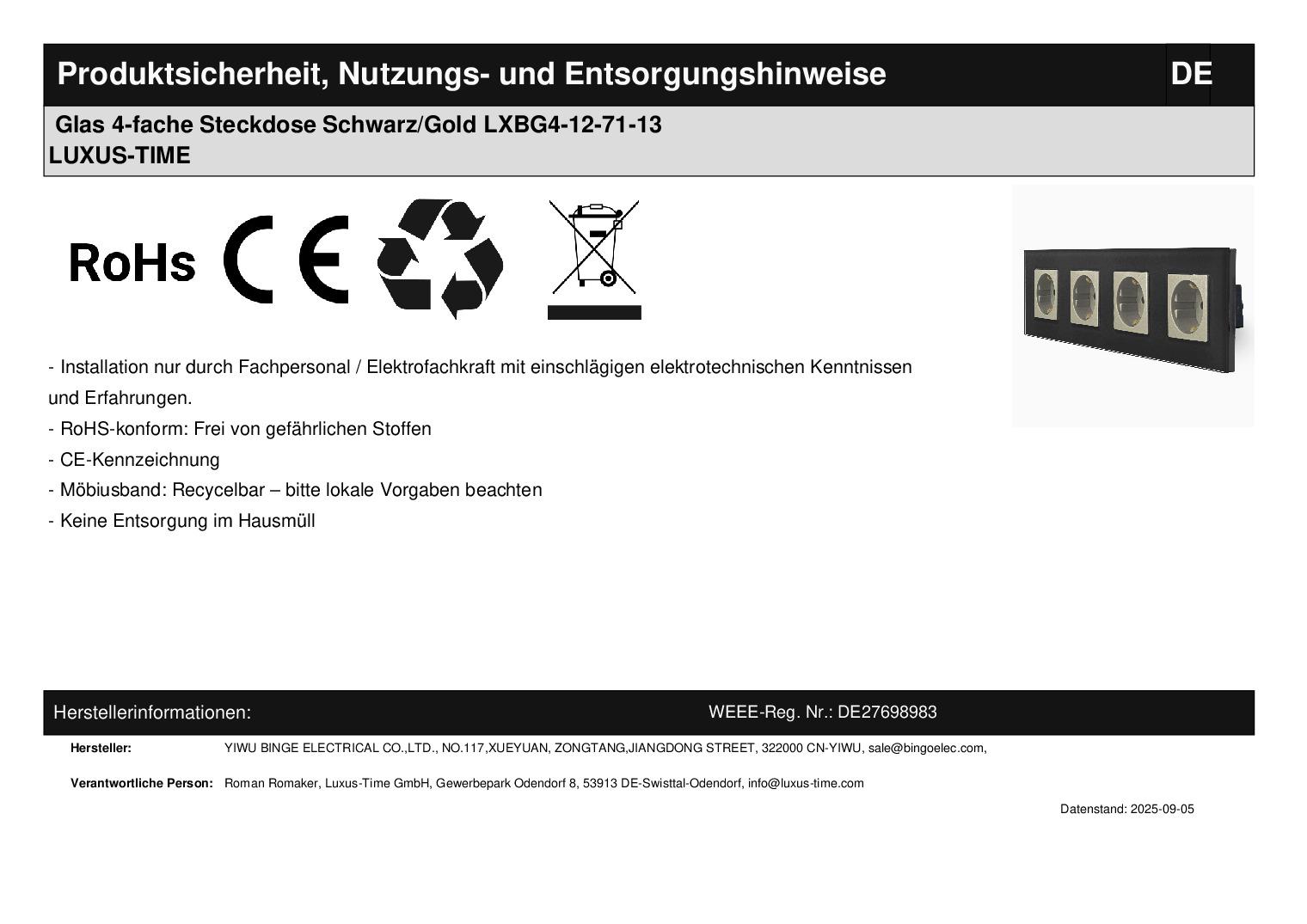 LUXUS TIME vier goldene Steckdosen-Module mit Glasrahmen in Schwarz Dieser Artikel besteht aus einem schwarzen, vierfachen Glasrahmen, sowie vier goldenen Steckdosen-Modulen. Diese Steckdosen-Module haben Schraubkontakte. Einfache und schnelle Montage, sowohl vertikal als auch horizontal . Der Austausch erfolgt wie bei anderen Wipp-Schalter-Herstellern. Ersetzen Sie einfach Ihre alten Wipp-Schalter durch ein neues, langlebiges Design. Die Lichtschalter- und Steckdosen-Module sind für Unterputzdosen mit 60 mm Durchmesser geeignet . Die Module werden mittels der den Glasblenden beiliegenden Metallrahmen durch Schrauben an den Unterputzdosen befestigt. Bei uns erhalten Sie die komplette Luxus-Time Bandbreite; von einem einfachen Wipp-Lichtschalter bis zum smarthome-fähigen Touch-Rollladenschalter. Fragen? Rufen Sie uns an oder senden Sie uns eine E-Mail. Wir beraten Sie gerne! Technische Daten :Betriebsspannung: 16A/250V Abmessungen: 299 x 86 x 37 mm Herstellerangaben:YIWU BINGE ELECTRICAL CO.,LTD.