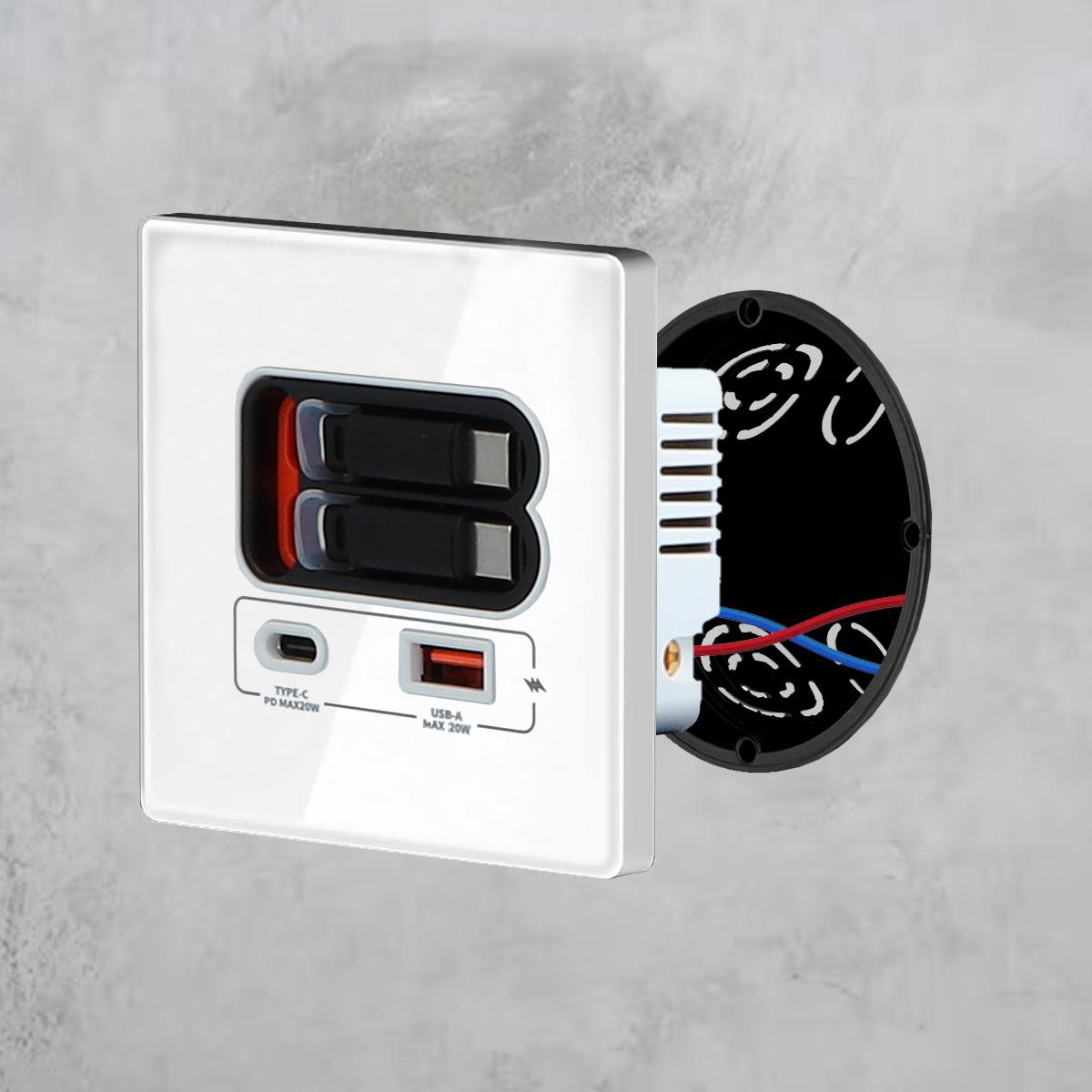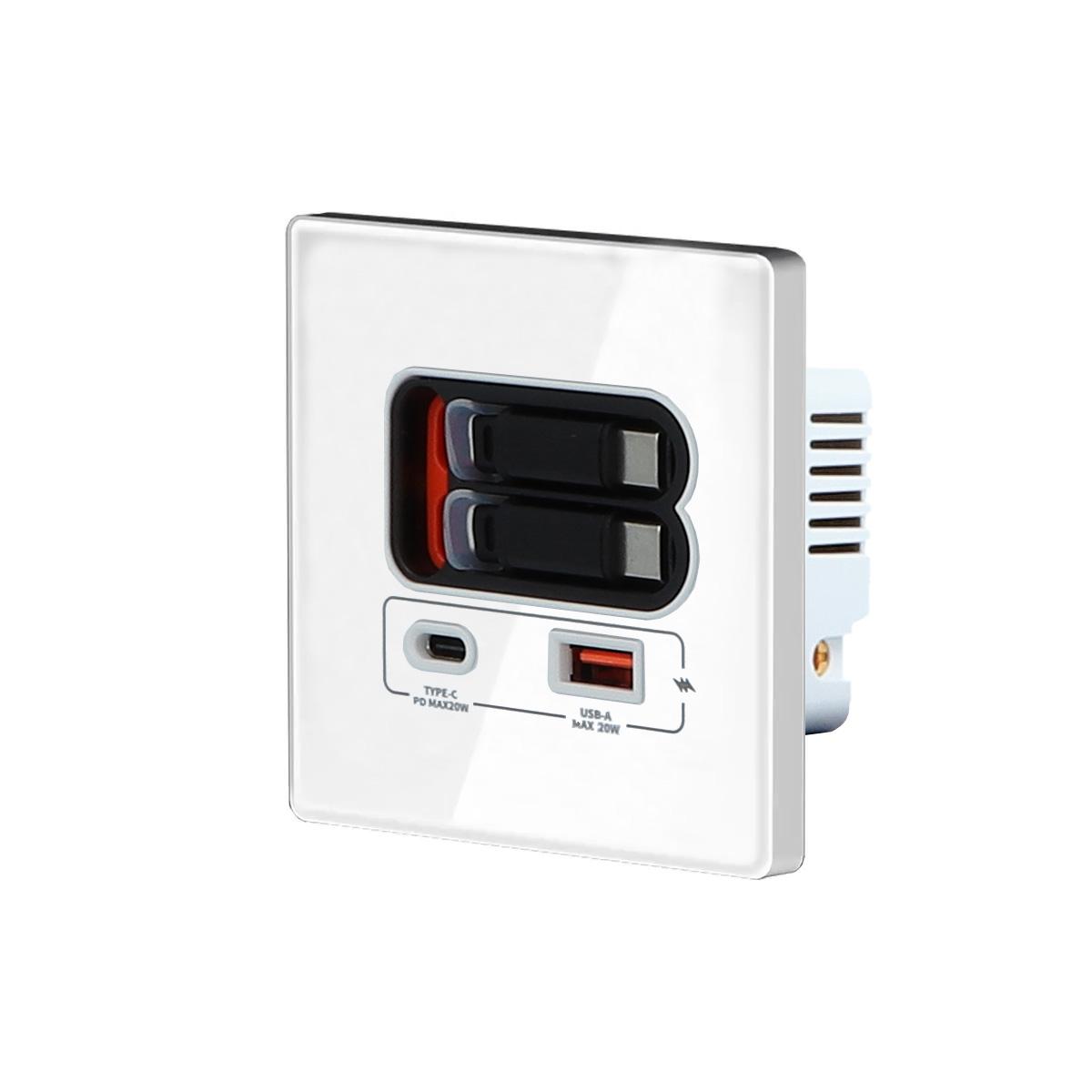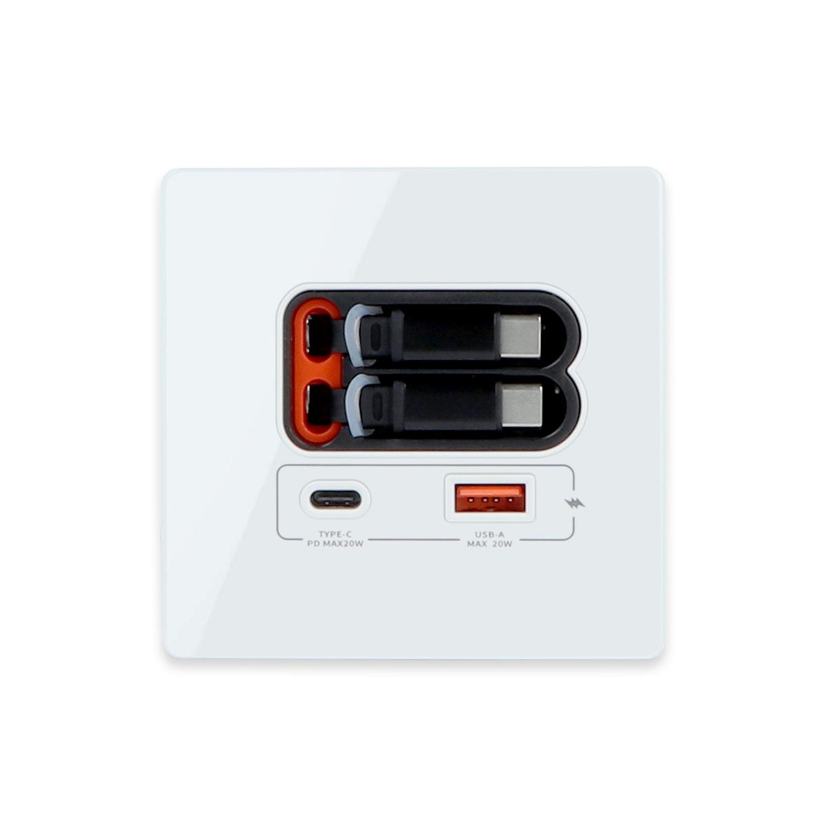 Einbau-Ladestation mit USB-A / USB-C – 20 W – Weiße GlasfrontDiese hochwertige Einbau-Ladestation kombiniert modernes Design mit praktischer Funktionalität. Sie verfügt über zwei integrierte, ausziehbare Ladekabel (je 80 cm) sowie je einen zusätzlichen USB-A- und USB-C-Anschluss. Die elegante Glasfront in Weiß mit stilvollen schwarzen Akzenten fügt sich harmonisch in jedes moderne Ambiente ein. Dank der ausziehbaren Kabel bleibt der Bereich um die Ladestation stets aufgeräumt – nach Gebrauch lassen sich die Kabel einfach und ordentlich wieder einziehen. Ideal geeignet für:
