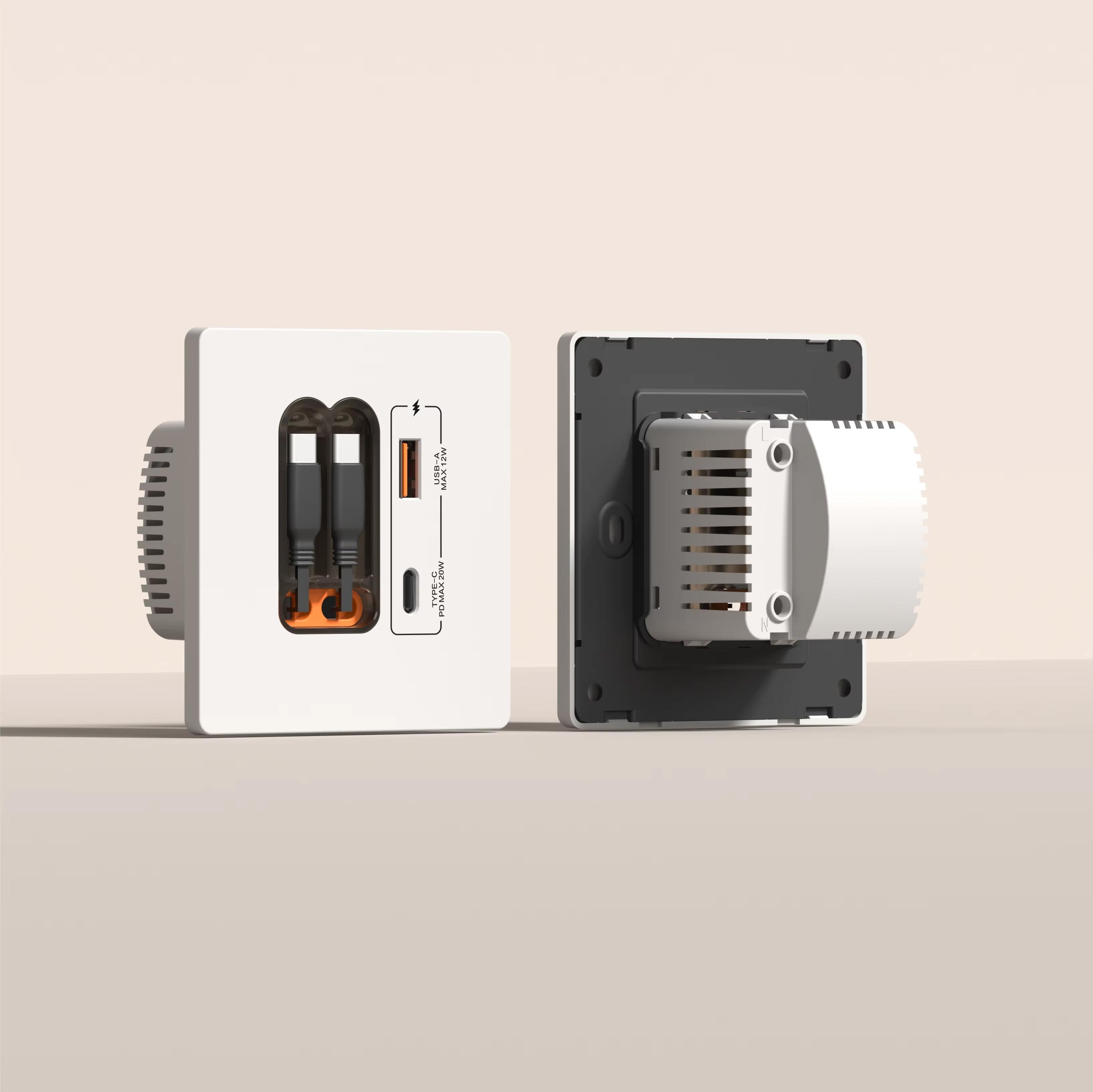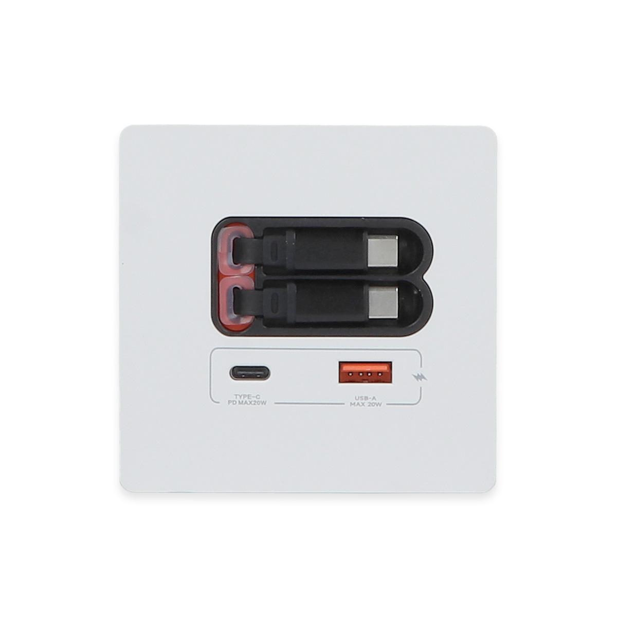 Einbau-Ladestation mit USB-A / USB-C – 20 W – Weiße FrontDiese hochwertige Einbau-Ladestation kombiniert modernes Design mit praktischer Funktionalität. Sie verfügt über zwei integrierte, ausziehbare Ladekabel (je 80 cm) sowie je einen zusätzlichen USB-A- und USB-C-Anschluss. Die weiße Front mit orangen Akzenten wertet jedes moderne Ambiente auf. Dank der ausziehbaren Kabel bleibt der Bereich um die Ladestation stets aufgeräumt – nach Gebrauch lassen sich die Kabel einfach und ordentlich wieder einziehen. Ideal geeignet für: