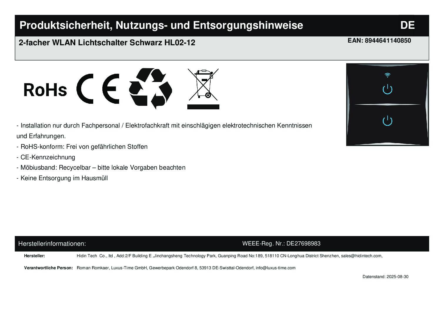 Dies ist ein zweifacher Hidin Tech WLAN Lichtschalter, zum ein- und ausschalten zweier Leuchten bzw. Leuchtengruppen unabhängig voneinander. Zusätzlich kann dieser Schalter in Verbindung auch per App „TuyaSmart“ gesteuert werden. Dies kann ohne zusätzliches Gateway oder HUB erfolgen, nur ein Null-Leiter muss an dieser Stelle vorhanden sein. In der App können auch Routinen hinterlegt werden, sodass z. B. jeden Tag zu einer bestimmten Uhrzeit die Außenbeleuchtung eingeschaltet wird. Auch eine Steuerung über Google Home oder Amazon Alexa ist möglich. Durch die Glasblende wird dieser Schalter mit moderner Sensortechnik zu einem echten Hingucker. Einfache und schnelle Montage, sowohl vertikal als auch horizontal . Durch leichtes Berühren der Kreisfläche wird der Lichtschalter betätigt. Die Kontur der Berührungsfläche ist in blau beleuchtet, so dass eine einfache Bedienung zu jeder Tageszeit möglich ist. Vor allem im Dunkeln ist es einfach den Schalter zu finden. Unsere Touch- Lichtschalter können mit allen Arten von Lampen verwendet werden, einschließlich Glühlampen, Halogenlampen & Energiesparlampen. Ausnahme: LED-Strips. Die Lichtschalter- und Steckdosen-Module sind für Unterputzdosen mit 60-68 mm Durchmesser geeignet. Fragen ? Rufen Sie uns an oder senden Sie uns eine E-Mail. Wir beraten Sie gerne! Technische Daten: Typ: über Nullleiter Touchpad: Gehärtetes qualitäts Glas Touchpad Material: Feuerfestes Polycarbonat Nennstrom: 10A Nennleistung: 2400W Nennspannung: 110V~220V Ruhestromverbrauch: <0.5W kompatibler Temperaturbereich: -20°C - 70°C kompatible Feuchtigkeit: <95% Frequenzen: 2.412~2.484GHz IEEE: 802.11b/g/n Anzeigeleuchte Farbe: Blau Empfindlichkeit: -102dBm Abmessungen : 86 x 86 x 32,5 mm Lieferumfang: Im Lieferumfang enthalten ist: · 1 x Hidin Tech WLAN-Schalter, gemäß Bestellung · Bedienungsanleitung Herstellerangaben:HidinTech