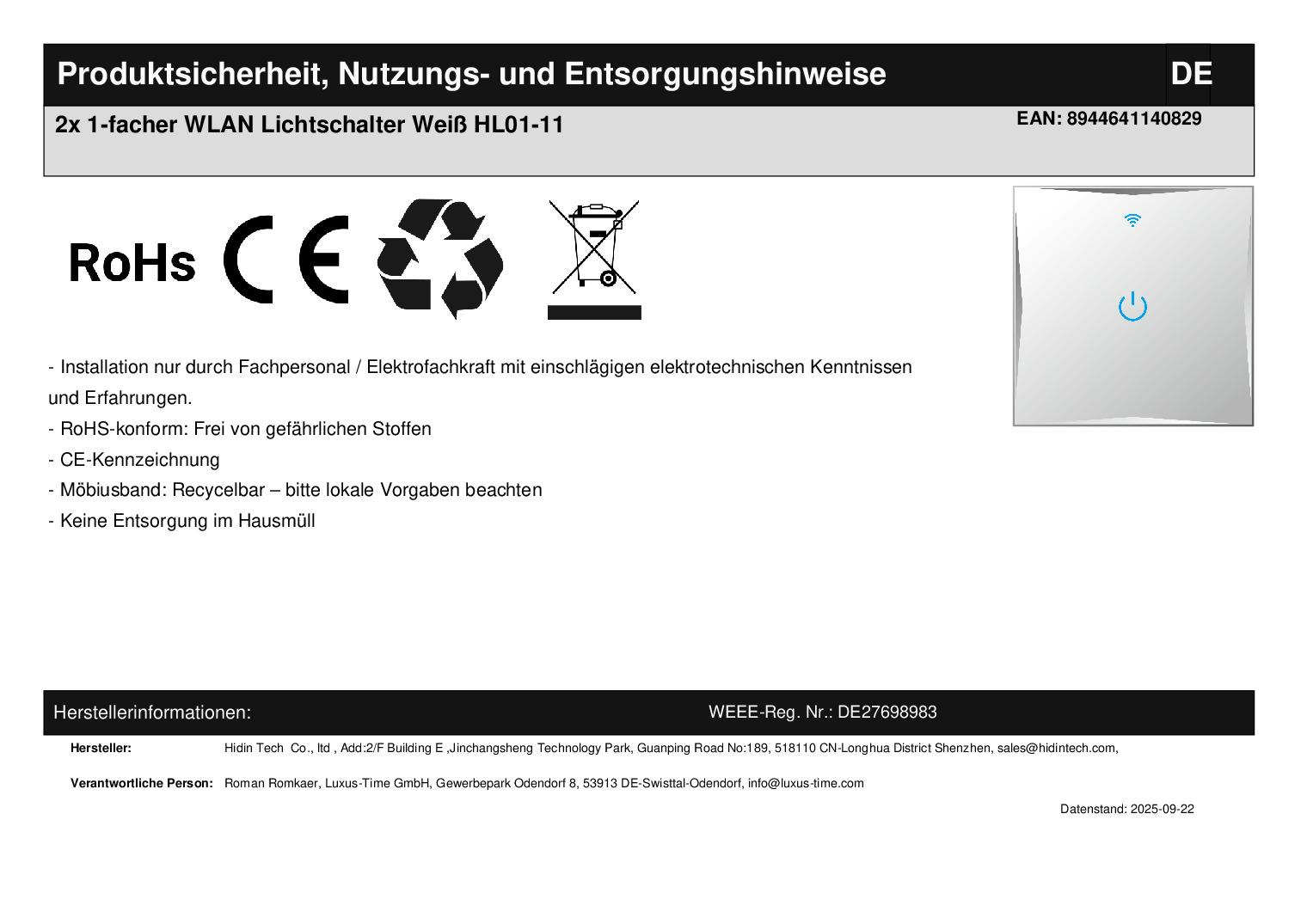 Dies ist ein einfacher Hidin Tech WLAN Lichtschalter, zum ein- und ausschalten einer Leuchte bzw. Leuchtengruppe unabhängig voneinander. Zusätzlich kann dieser Schalter in Verbindung auch per App „TuyaSmart“ gesteuert werden. Dies kann ohne zusätzliches Gateway oder HUB erfolgen, nur ein Null-Leiter muss an dieser Stelle vorhanden sein. In der App können auch Routinen hinterlegt werden, sodass z. B. jeden Tag zu einer bestimmten Uhrzeit die Außenbeleuchtung eingeschaltet wird. Auch eine Steuerung über Google Home oder Amazon Alexa ist möglich. Durch die Glasblende wird dieser Schalter mit moderner Sensortechnik zu einem echten Hingucker. Einfache und schnelle Montage, sowohl vertikal als auch horizontal . Durch leichtes Berühren der Kreisfläche wird der Lichtschalter betätigt. Die Kontur der Berührungsfläche ist in blau beleuchtet, so dass eine einfache Bedienung zu jeder Tageszeit möglich ist. Vor allem im Dunkeln ist es einfach den Schalter zu finden. Unsere Touch- Lichtschalter können mit allen Arten von Lampen verwendet werden, einschließlich Glühlampen, Halogenlampen & Energiesparlampen. Ausnahme: LED-Strips. Die Lichtschalter- und Steckdosen-Module sind für Unterputzdosen mit 60-68 mm Durchmesser geeignet. Fragen? Rufen Sie uns an oder senden Sie uns eine E-Mail. Wir beraten Sie gerne! Technische Daten: Typ: über Nullleiter Touchpad: Gehärtetes qualitäts Glas Touchpad Material: Feuerfestes Polycarbonat Nennstrom: 10A Nennleistung: 2400W Nennspannung: 110V~220V Ruhestromverbrauch: <0.5W kompatibler Temperaturbereich: -20°C - 70°C kompatible Feuchtigkeit: <95% Frequenzen: 2.412~2.484GHz IEEE: 802.11b/g/n Anzeigeleuchte Farbe: Blau Empfindlichkeit: -102dBm Abmessungen: 86 x 86 x 32,5 mm Lieferumfang: Im Lieferumfang enthalten ist: · 2 x Hidin Tech WLAN-Schalter, gemäß Bestellung · Bedienungsanleitung Herstellerangaben:HidinTech