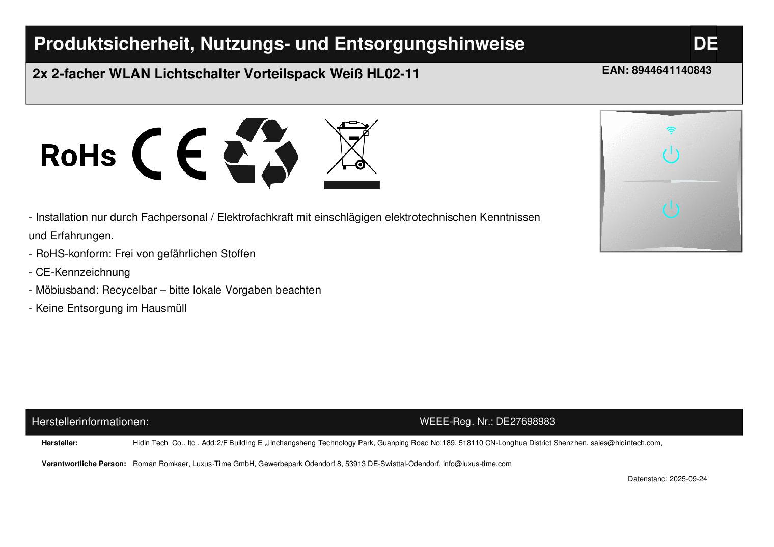 Dies ist ein zweifacher Hidin Tech WLAN Lichtschalter, zum ein- und ausschalten zweier Leuchten bzw. Leuchtengruppen unabhängig voneinander. Zusätzlich kann dieser Schalter in Verbindung auch per App „TuyaSmart“ gesteuert werden. Dies kann ohne zusätzliches Gateway oder HUB erfolgen, nur ein Null-Leiter muss an dieser Stelle vorhanden sein. In der App können auch Routinen hinterlegt werden, sodass z. B. jeden Tag zu einer bestimmten Uhrzeit die Außenbeleuchtung eingeschaltet wird. Auch eine Steuerung über Google Home oder Amazon Alexa ist möglich. Durch die Glasblende wird dieser Schalter mit moderner Sensortechnik zu einem echten Hingucker. Einfache und schnelle Montage, sowohl vertikal als auch horizontal . Durch leichtes Berühren der Kreisfläche wird der Lichtschalter betätigt. Die Kontur der Berührungsfläche ist in blau beleuchtet, so dass eine einfache Bedienung zu jeder Tageszeit möglich ist. Vor allem im Dunkeln ist es einfach den Schalter zu finden. Unsere Touch- Lichtschalter können mit allen Arten von Lampen verwendet werden, einschließlich Glühlampen, Halogenlampen & Energiesparlampen. Ausnahme: LED-Strips. Die Lichtschalter- und Steckdosen-Module sind für Unterputzdosen mit 60-68 mm Durchmesser geeignet. Fragen ? Rufen Sie uns an oder senden Sie uns eine E-Mail. Wir beraten Sie gerne! Technische Daten: Typ: über Nullleiter Touchpad: Gehärtetes qualitäts Glas Touchpad Material: Feuerfestes Polycarbonat Nennstrom: 10A Nennleistung: 2400W Nennspannung: 110V~220V Ruhestromverbrauch: <0.5W kompatibler Temperaturbereich: -20°C - 70°C kompatible Feuchtigkeit: <95% Frequenzen: 2.412~2.484GHz IEEE: 802.11b/g/n Anzeigeleuchte Farbe: Blau Empfindlichkeit: -102dBm Abmessungen : 86 x 86 x 32,5 mm Lieferumfang: Im Lieferumfang enthalten ist: · 2 x Hidin Tech WLAN-Schalter, gemäß Bestellung · Bedienungsanleitung Herstellerangaben:HidinTech