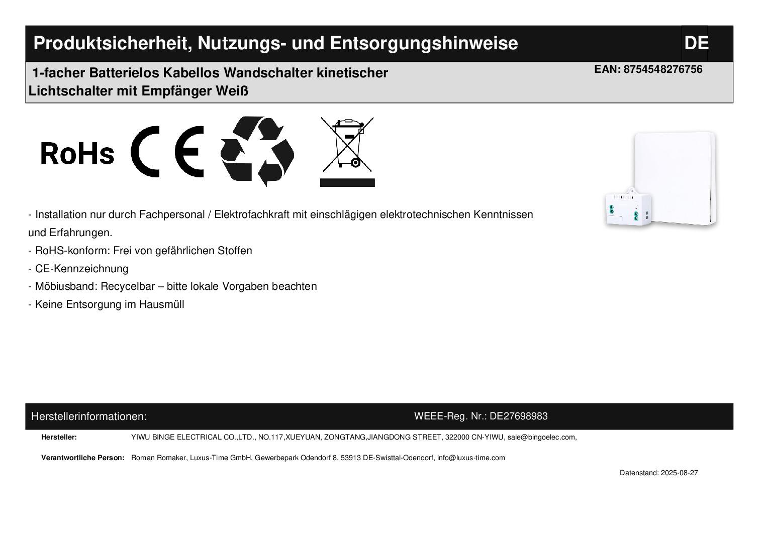 Gewicht: 65 g (Empfänger) / 50 g (Einfacher Schalter) / 70 g (Zweifacher Schalter)