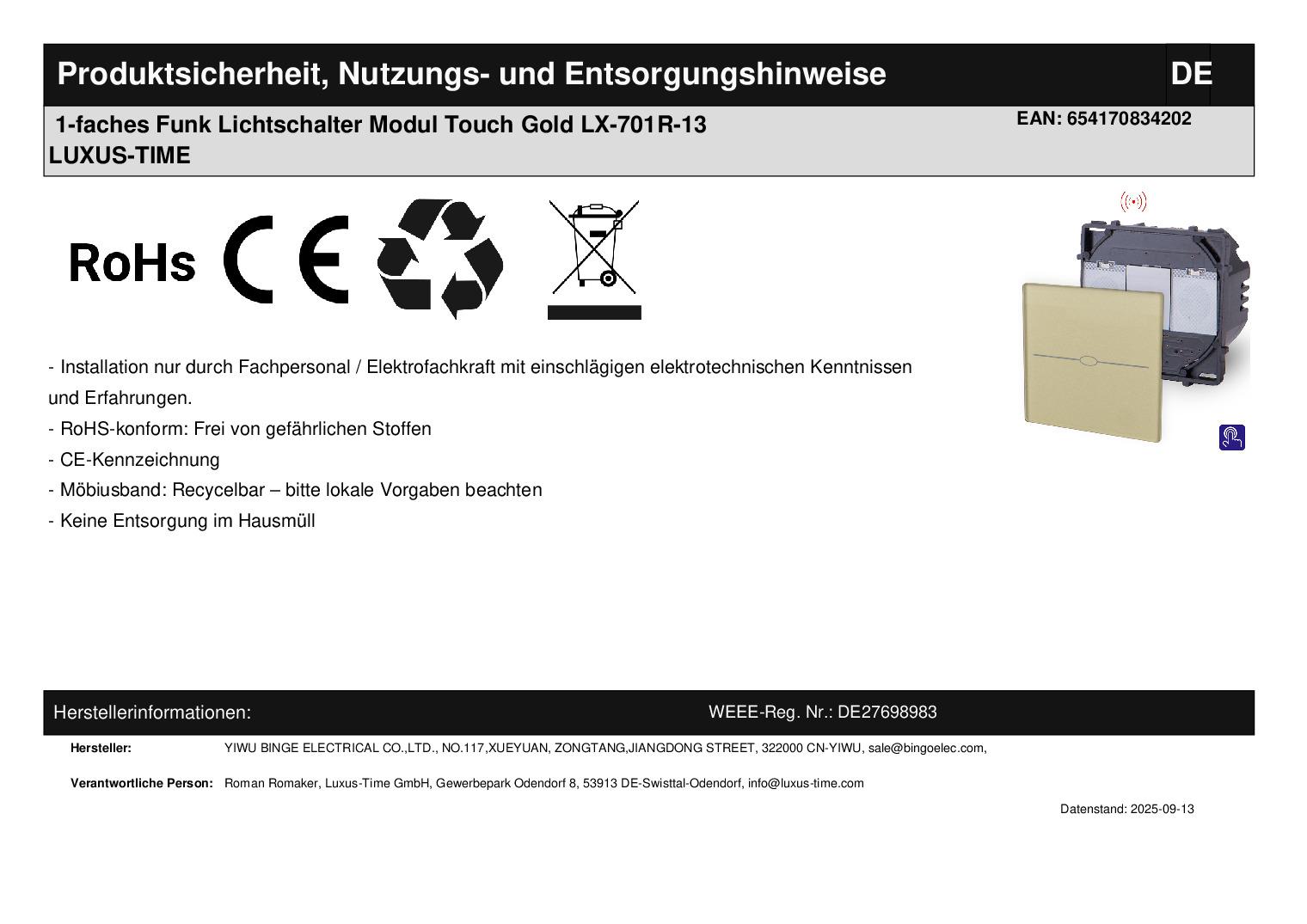 Luxus Time einfaches Funk-Lichtschalter-Modul in Gold Dies ist ein Luxus-Time Touch-Funklichtschalter zum einfachen ein- und auszuschalten, auch über den Gwen Bedienschalter 1-Fach oder 2-Fach. Der Gwen Bedienschalter funktioniert ähnlich wie eine Fernbedienung. Der Gwen Funkschalter lässt sich an der Wand montieren (verschrauben oder kleben). Er ist batteriebetrieben und benötigt zwei CR2025-Knopfzellen (nicht enthalten). Durch Berühren der Kreisfläche wird der Schalter aktiviert und leuchtet rot auf. Einfache und schnelle Montage, sowohl vertikal als auch horizontal . Alle Touch-Schalter sind beleuchtet . Wenn die angeschlossene Leuchte ausgeschaltet ist, leuchtet der Schalter schwach blau, wenn die Leuchte eingeschaltet ist, leuchtet der Schalter in einem stärkeren Blau. Die Touch-Schalter sind mit allen Arten von Leuchten verwendbar (Halogen, LED, Energiesparlampen), außer LED-Strips . Bei LED-Strips ist die Watt-Zahl in den meisten Fällen zu gering und kann dadurch zu Problemen führen. Sollten Sie Probleme wie z. B. Flackern von Leuchten bzw. das die Leuchten nach kurzer Zeit von alleine wieder ausschalten, haben, sollten Sie die Watt-Leistung erhöhen. Der Austausch erfolgt wie bei anderen Wipp-Schalter-Herstellern. Ersetzen Sie einfach Ihre alten Wipp-Schalter durch ein neues, langlebiges Design. Die Lichtschalter- und Steckdosen-Module sind für Unterputzdosen mit 60 mm Durchmesser geeignet . Die Module werden mittels der den Glasblenden beiliegenden Metallrahmen durch Schrauben an den Unterputzdosen befestigt. Bei uns erhalten Sie die komplette Luxus-Time Bandbreite; von einem einfachen Wipp-Lichtschalter bis zum smarthome-fähigen Touch-Rollladenschalter. Hinweis zur Installation: Lichtschalter stromlos anschließen. Glasblende aufsetzen. Wichtig!!! Strom erst einschalten, wenn die Glasblende aufgesetzt wurde. Sollte dieser Hinweis nicht beachtet werden, kann es vorkommen, dass der Lichtschalter nicht reagiert. Fragen? Rufen Sie uns an oder senden Sie uns eine E-Mail. Wir beraten Sie gerne! Technische Daten :Abmessungen: 48 mm x 48 mm x 25 mm Betriebsspannung: AC110 ~ 250V, 50Hz60Hz max. Stromzufuhr für jeden Gang 2.5 A max. Leistung für jeden Gang: 800W Ruhestromverbrauch: weniger als 0,1mW Lebensdauer: 100.000 Benutzungen Montage in Standard UP-Dose mit Durchmesser von 60mm mit Schraubgewinde Herstellerangaben:YIWU BINGE ELECTRICAL CO.,LTD.