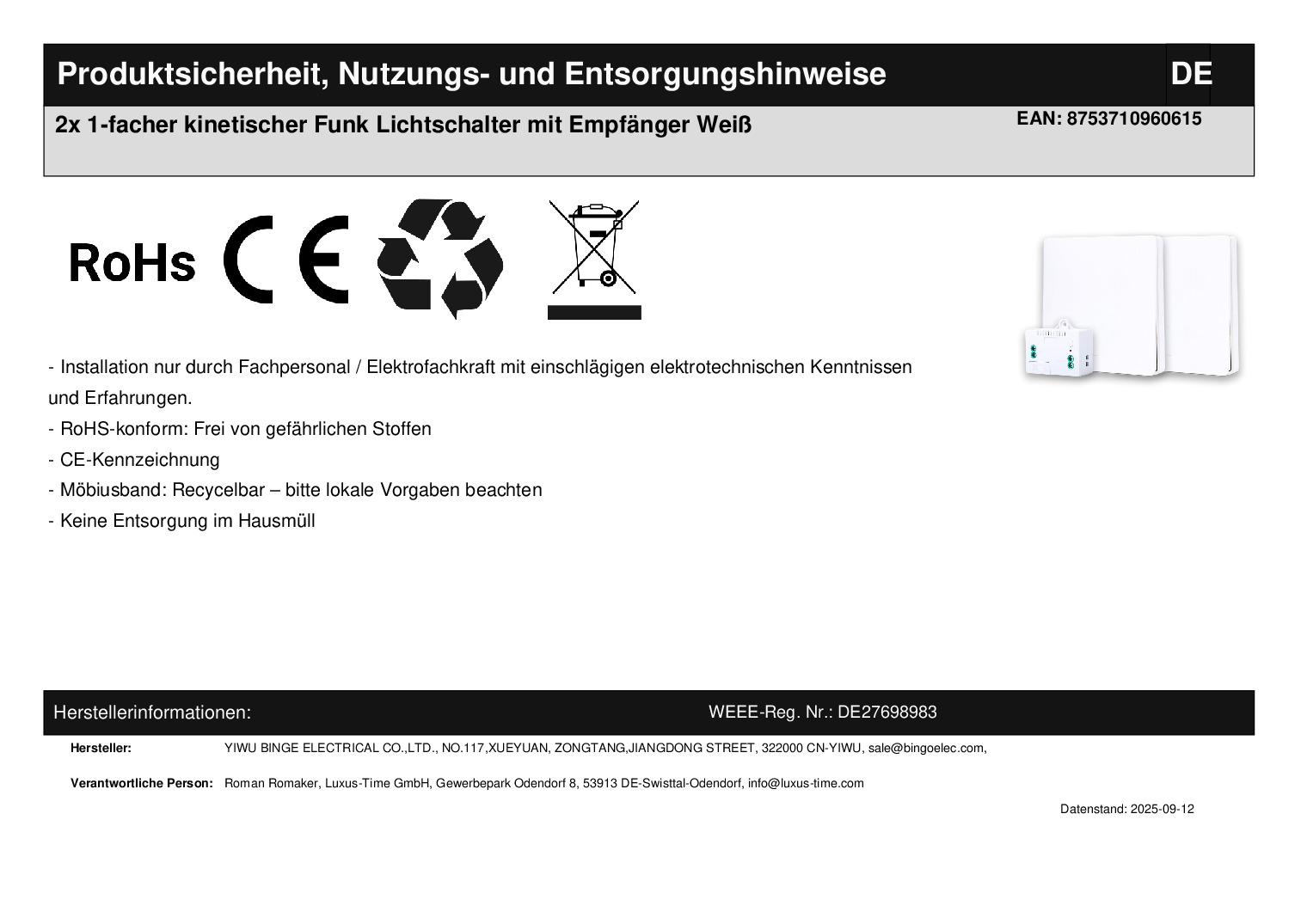 Gewicht: 65 g (Empfänger) / 50 g (Einfacher Schalter) / 70 g (Zweifacher Schalter)