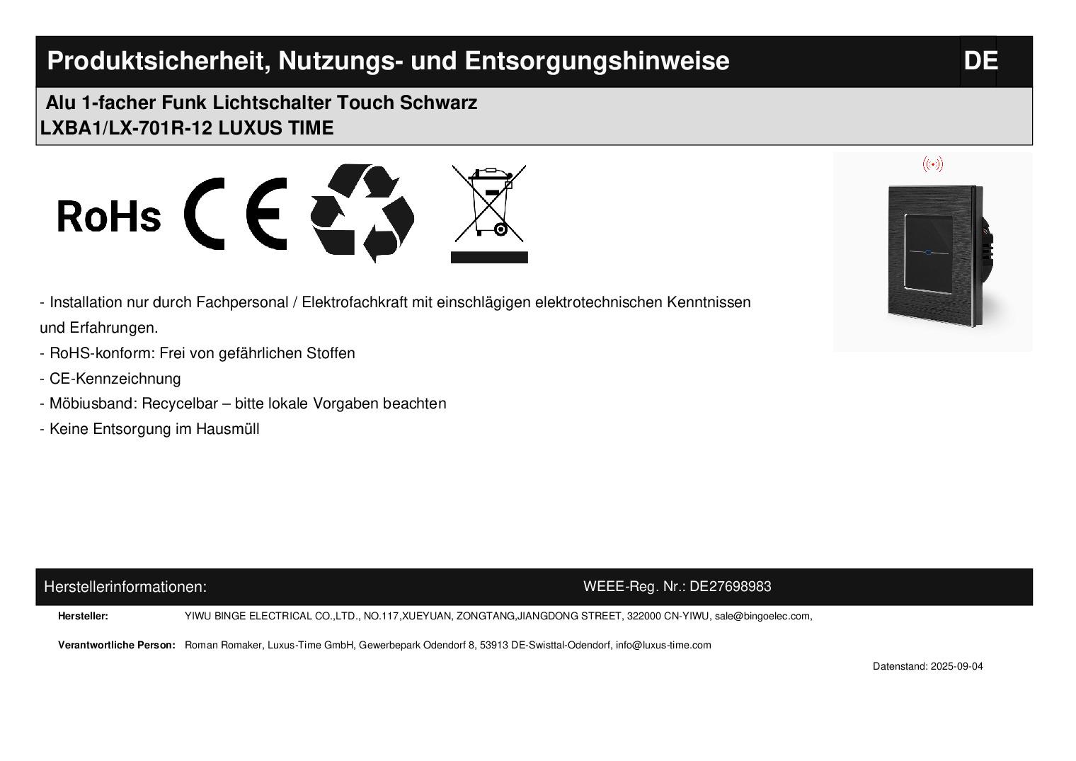 Der einfache Lichtschalter ist zum ein- und ausschalten einer Leuchte bzw. einer Lichtgruppe geeignet. Außerdem kann dieser Schalter auch über den Gwen Bedienschalter 1-Fach oder 2-Fach. Der Gwen Bedienschalter funktioniert ähnlich wie eine Fernbedienung. Der Gwen Funkschalter lässt sich an der Wand montieren (verschrauben oder kleben). Er ist batteriebetrieben und benötigt zwei CR2025-Knopfzellen (nicht enthalten). Durch Berühren der Kreisfläche wird der Schalter aktiviert und leuchtet rot auf. Einfache und schnelle Montage, sowohl vertikal als auch horizontal . Alle Touch-Schalter sind beleuchtet . Wenn die angeschlossene Leuchte ausgeschaltet ist, leuchtet der Schalter schwach blau, wenn die Leuchte eingeschaltet ist, leuchtet der Schalter in einem stärkeren Blau. Die Touch-Schalter sind mit allen Arten von Leuchten verwendbar (Halogen, LED, Energiesparlampen), außer LED-Strips . Bei LED-Strips ist die Watt-Zahl in den meisten Fällen zu gering und kann dadurch zu Problemen führen. Sollten Sie Probleme wie z. B. Flackern von Leuchten bzw. das die Leuchten nach kurzer Zeit von alleine wieder ausschalten, haben, sollten Sie die angeschlossene Watt-Leistung erhöhen. Der Austausch erfolgt wie bei anderen Wipp-Schalter-Herstellern. Ersetzen Sie einfach Ihre alten Wipp-Schalter durch ein neues, langlebiges Design. Die Lichtschalter- und Steckdosen-Module sind für Unterputzdosen mit 60 mm Durchmesser geeignet . Die Module werden mittels der den Aluminiumblenden beiliegenden Metallrahmen durch Schrauben an den Unterputzdosen befestigt. Bei uns erhalten Sie die komplette Luxus-Time Bandbreite; von einem einfachen Wipp-Lichtschalter bis zum smarthome-fähigen Touch-Rollladenschalter. Hinweis zur Installation: Lichtschalter stromlos anschließen. Glasblende aufsetzen. Wichtig!!! Strom erst einschalten, wenn die Glasblende aufgesetzt wurde. Sollte dieser Hinweis nicht beachtet werden, kann es vorkommen, dass der Lichtschalter nicht reagiert. Fragen? Rufen Sie uns an oder senden Sie uns eine E-Mail. Wir beraten Sie gerne! Technische Daten :