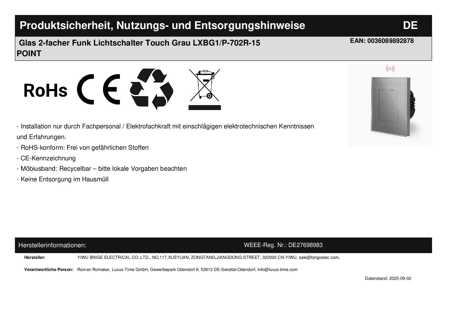 Dieser Artikel besteht aus einem grauen, einfachen Glasrahmen, sowie einem grauen Touch-Funk-Serienschalter-Modul.