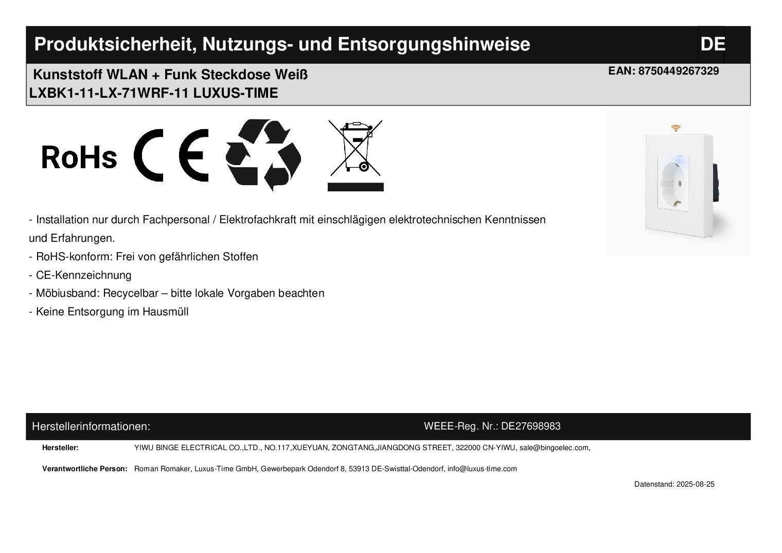 Luxus Time Funk/Wifi-Steckdosen-Modul inkl. einfachem Kunststoffrahmen in weißDie Steckdose verfügt über eine eingebaute Kindersicherung und Schraubanschlüsse.Dieses Steckdosen-Modul kann sowohl per WLAN über die "Tuya Smart" App, als auch über den Gwen Bedienschalter 1-Fach oder 2-Fach. Der Gwen Bedienschalter funktioniert ähnlich wie eine Fernbedienung. Der Gwen Funkschalter lässt sich an der Wand montieren (verschrauben oder kleben). Er ist batteriebetrieben und benötigt zwei CR2025-Knopfzellen (nicht enthalten). Durch Berühren der Kreisfläche wird der Schalter aktiviert und leuchtet rot auf. Einfache und schnelle Montage, sowohl vertikal als auch horizontal . Steuern Sie Ihre Tuya fähigen Produkte wie z. B. Lichtschalter, Kameras, Raumthermostate, etc. über unseren Smarten Touch Monitor. Sie können über den Monitor Szenen hinterlegen, Ihre Schalter steuern, Ihn als Tür Videotürsprechanlage nutzen oder als Schnittstelle für Zigbee und Amazon Alexa verwenden, wodurch die Nutzung eines Amazon Echos entfallen kann. Die Lichtschalter- und Steckdosen-Module sind für Unterputzdosen mit 60 mm Durchmesser geeignet . Die Module werden mittels der den Glasblenden beiliegenden Metallrahmen durch Schrauben an den Unterputzdosen befestigt. Hinweis zur Installation: Lichtschalter stromlos anschließen. Glasblende aufsetzen. Wichtig!!! Strom erst einschalten, wenn die Glasblende aufgesetzt wurde. Sollte dieser Hinweis nicht beachtet werden, kann es vorkommen, dass der Lichtschalter nicht reagiert. Fragen? Rufen Sie uns an oder senden Sie uns eine E-Mail. Wir beraten Sie gerne! Technische Daten:Abmessungen:86 mm x 86 mm x 25 mm Technische Daten: Betriebsspannung: 16A/240V, 50Hz60Hz Herstellerangaben:YIWU BINGE ELECTRICAL CO.,LTD.