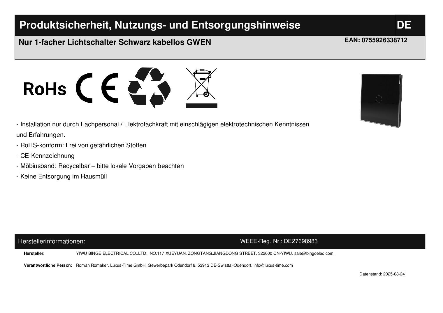 - Montage: Legen Sie die Batterie in den Schalter ein (Batterien nicht im Lieferumfang enthalten) und befestigen Sie den Gwen Bedienschalter entweder mit Schrauben an der Wand oder kleben Sie ihn mit den Klebepads auf eine gewünschte Oberfläche.