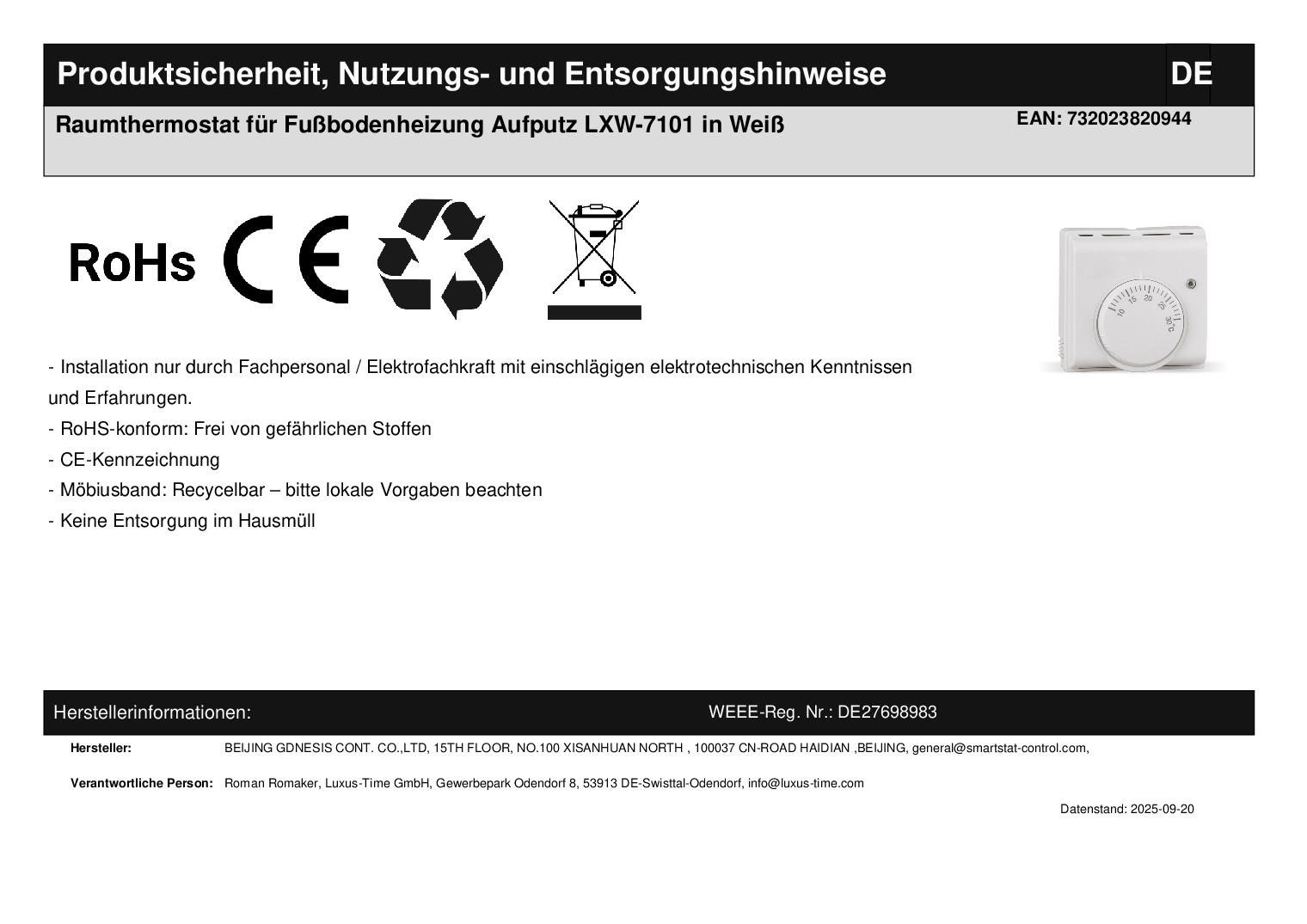 - 1 x Raumthermostat LXW-7101 - Bedienungsanleitung Herstellerangaben:SINO Tiger International Tradign Limited
