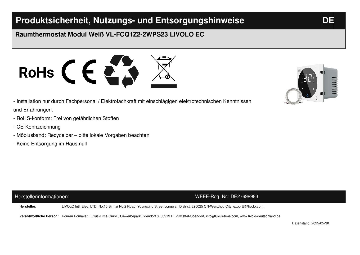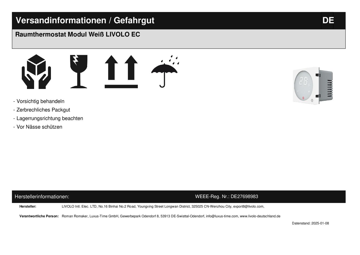 - 1 x Livolo Raumthermostat, gemäß Bestellung - Bedienungsanleitung