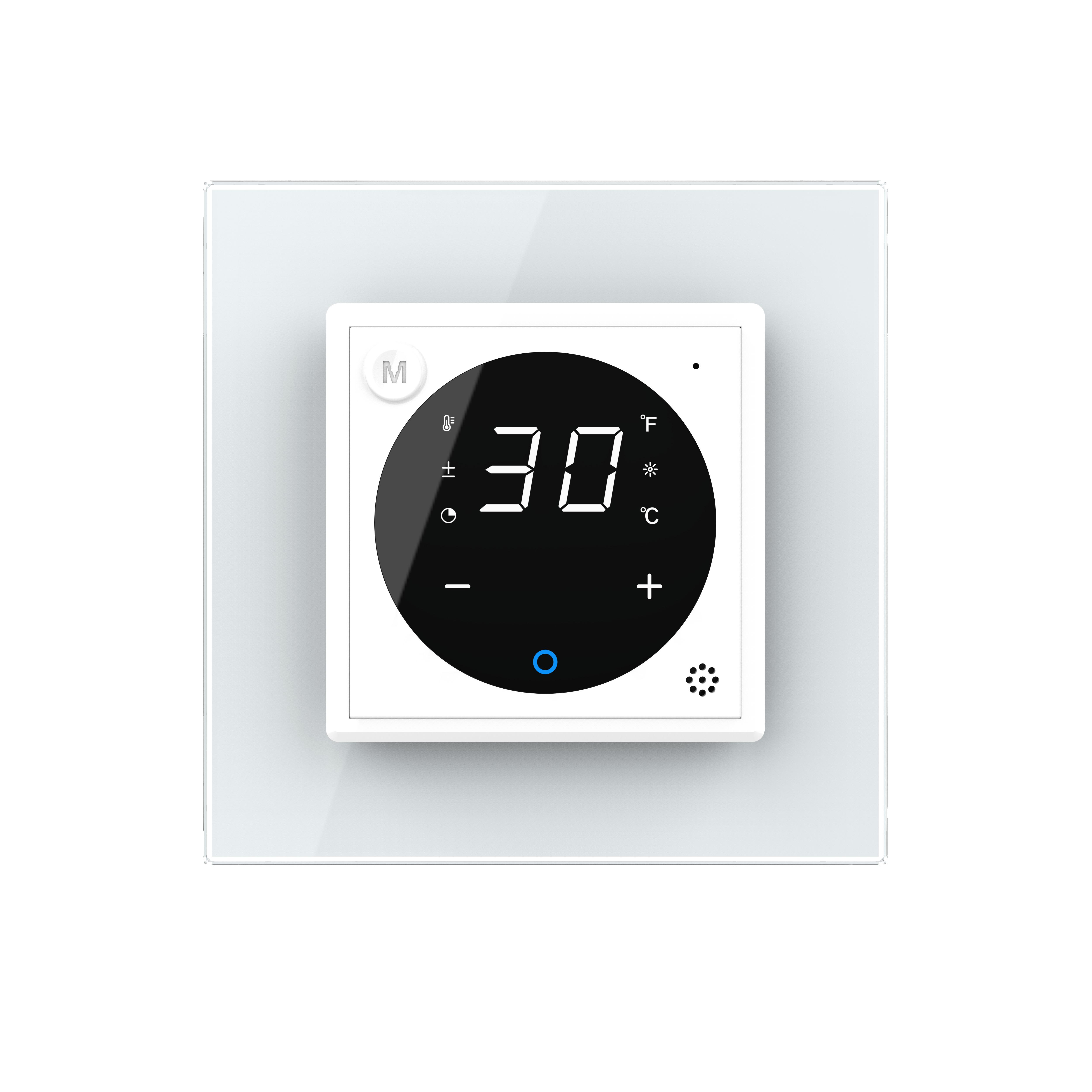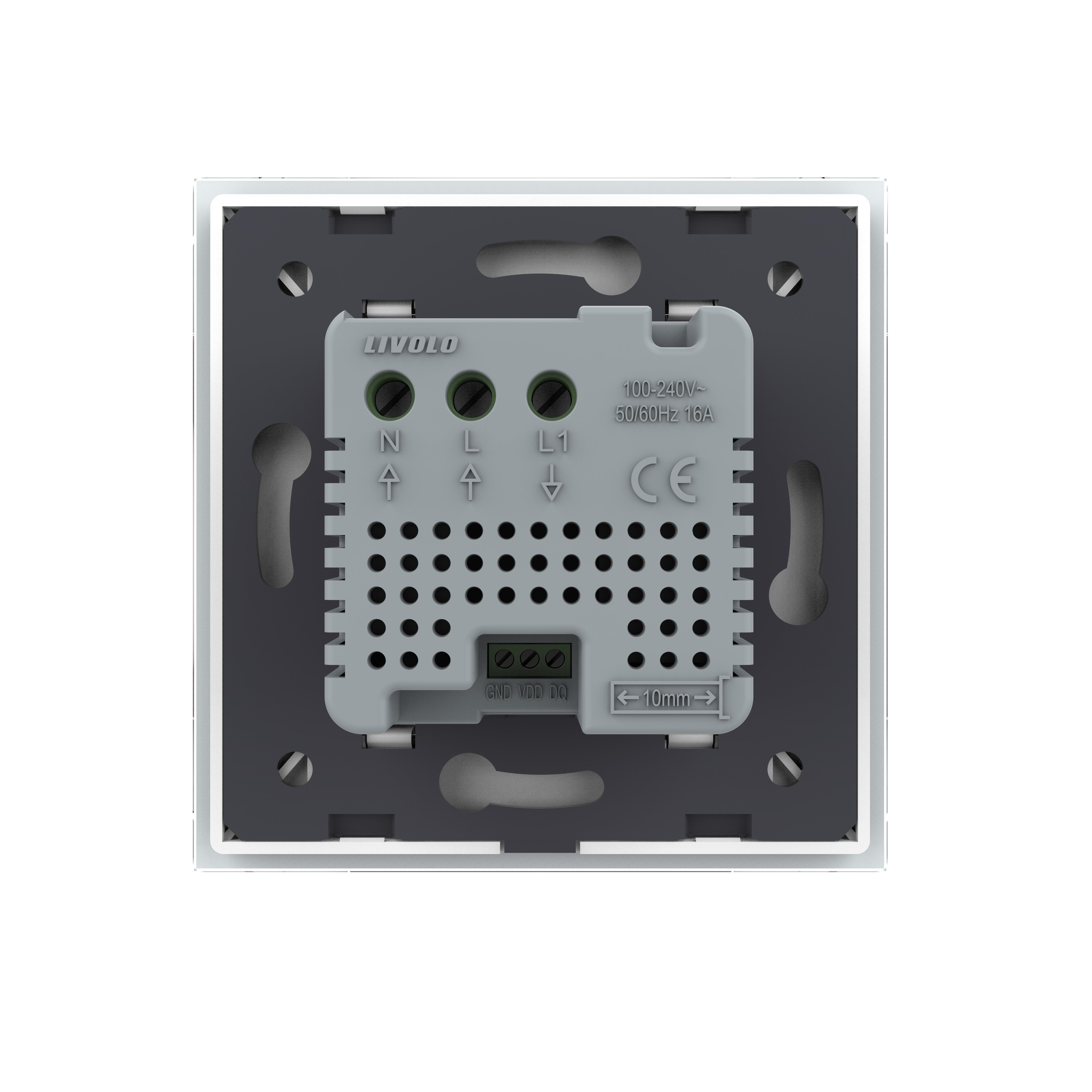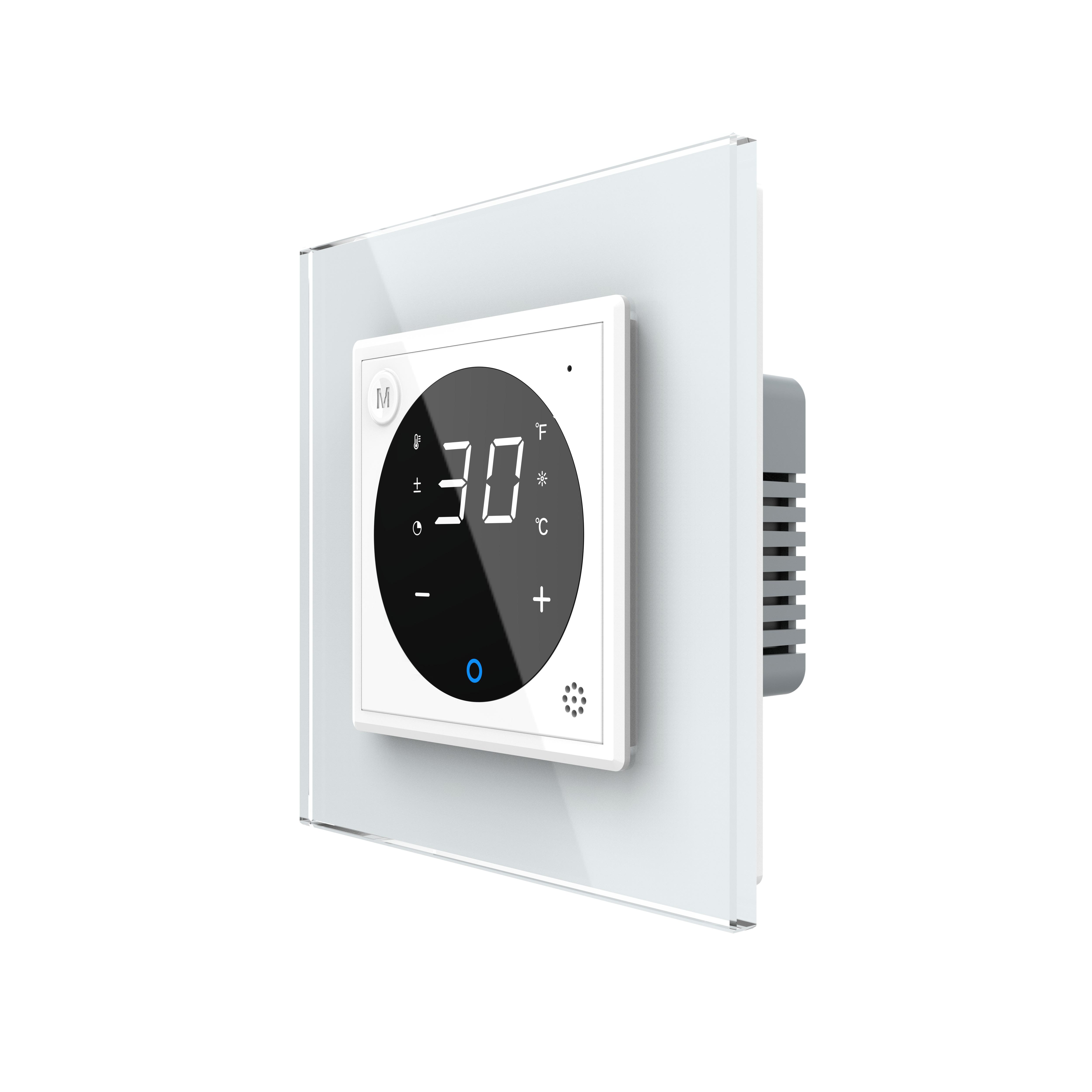 LIVOLO digitales EC Raumthermostat für Fußboden/Elektroheizung in Weiß optional mit Bodenfühler und Glasrahmen in WeißDies ist ein digitales EC Raumthermostat von Livolo in weiß mit externem Sensor. Mit diesem Thermostat können Sie die meisten Fußbodenheizungen mit Stellmotoren bedienen ( wasserführend oder elektrisch ), solange die Maximal-Leistung nicht überschritten wird. Durch den externen Bodensensor liefert das Thermostat besonders genaue Erlebnisse. Sie können das Thermostat auch wahlweise ohne externen Sensor verwenden. Dies kann allerdings dazu führen, dass die Messergebnisse ungenauer ausfallen. Einstellbar ist das Thermostat über die Berührungspunkte auf der Vorderseite oder die Livolo App. Das Display ist während des Betriebes beleuchtet , die Helligkeit ist einstellbar. Über die Livolo App (Android und iOS) können Sie das Thermostat auch von unterwegs steuern oder Routinen bzw. Zeitpläne hinterlegen, sodass auch Energie eingespart werden kann , wenn niemand Zuhause ist. Sprachsteuerung ist sowohl mit Amazon Alexa als auch Google Home möglich. Für die Steuerung per App, Alexa oder Google Home ist das Livolo EC Gateway zwingend nötig. Durch die Kombination mit der passenden Glasblende wird dieses Modul zu einem echten Hingucker. Einfache und schnelle Montage, sowohl vertikal als auch horizontal . In unserem Shop finden Sie auch Spreizkrallen (LG-01) im 2er Pack, für Unterputzdosen ohne Verschraubungsmöglichkeit. Geeignet für Hohlwände und ältere Häuser (Baujahr vor 1970). Bei Verwendung von Spreizkrallen sind 68 mm große Unterputzdosen besser geeignet. Die Module werden mittels der Metallrahmen durch Schrauben an den Unterputzdosen befestigt. Der Austausch erfolgt wie bei anderen Wipp-Schalter-Herstellern. Ersetzen Sie einfach Ihre alten Wipp-Schalter durch ein neues, langlebiges Design. Die Verkabelung bleibt die gleiche. Die Lichtschalter- und Steckdosen-Module sind für Unterputzdosen mit 60-68 mm Durchmesser geeignet . Der Lochabstand für Mehrfach-Blenden beträgt 71 mm. Bei uns erhalten Sie die komplette Livolo Bandbreite; von einem einfachen Wipp-Lichtschalter bis zum smarthome-fähigen Touch-Rollladenschalter. Fragen? Rufen Sie uns an oder senden Sie uns eine E-Mail. Wir beraten Sie gerne! Technische Daten: Temperaturgenauigkeit: < 1°C Stromverbrauch: < 0,8W Lebensdauer: > 30.000 Betätigungen Anschlussspannung: 100 ~ 240V 50/60HZ Schaltleistung: 16A 1 Gang Abmessungen:80 x 80 x 28 mm Lieferumfang: Im Lieferumfang enthalten ist: - 1 x Livolo Raumthermostat, gemäß Bestellung - 1 x Livolo Glasrahmen, gemäß Bestellung - Bedienungsanleitung Herstellerangaben:LIVOLO INTERNATIONAL ELECTRIC LTD