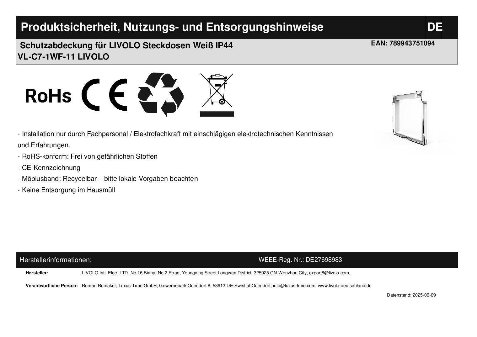 - 1 x Livolo Schutzabdeckung, gemäß Bestellung Herstellerangaben:LIVOLO INTERNATIONAL ELECTRIC LTD