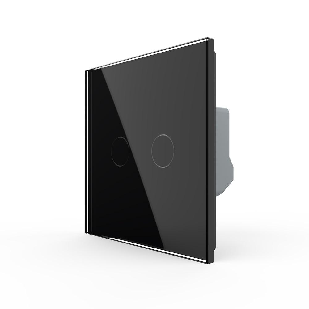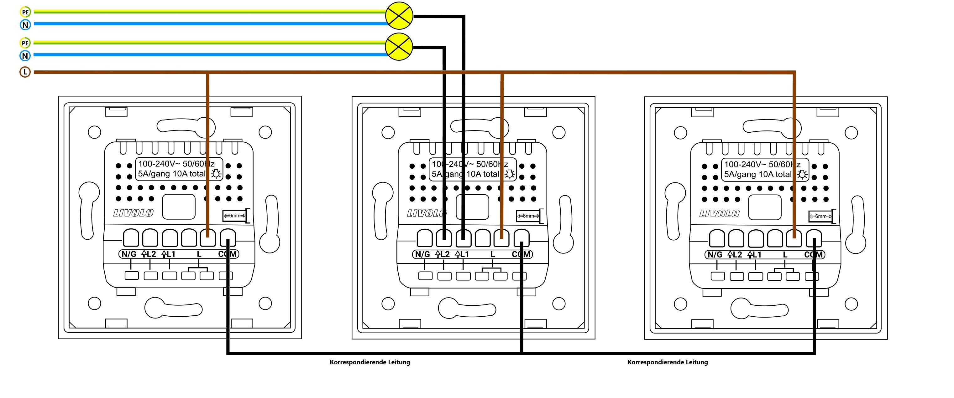 Livolo Serienwechselschalter EC Wechselschalter / Kreuzschalter mit einer Glasblende in SchwarzDies ist ein zweifacher Livolo EC-Wechselschalter, zum ein- und ausschalten zweier Leuchten bzw. Leuchtengruppen. Zusätzlich verfügt es über eine Wechselschalt-Funktion, sodass beide Leuchten unabhängig voneinander von bis zu vier Schaltern pro Wechselschaltung aus ein- und ausgeschaltet werden kann. Die Livolo Touch-Wechselschalter können gleichzeitig auch als Kreuzschalter verwendet werden. Der Anschluss aller korrespondierender Kabel der weiteren Touch-Wechselschalter erfolgt zusammen im COM-Anschluss des Schalters, der als Kreuzschalter verwendet wird. Da im Anschluss eine Synchronisation ( YouTube-Video ) erfolgen muss, können innerhalb einer Wechselschaltung nur Livolo Touch-Wechselschalter verwendet werden. Die Synchronisationsanleitung finden Sie in der Bedienungsanleitung. Zusätzlich kann dieser Schalter in Verbindung mit dem Livolo EC Gateway auch per App gesteuert werden. Durch die Kombination mit der passenden Glasblende wird dieser Schalter mit moderner Sensortechnik zu einem echten Hingucker. Einfache und schnelle Montage, sowohl vertikal als auch horizontal . Durch leichtes Berühren der Kreisfläche wird der Lichtschalter betätigt. Die Kontur der Berührungsfläche ist dezent beleuchtet , so dass eine einfache Bedienung zu jeder Tageszeit möglich ist. Vor allem im Dunkeln ist es einfach den Schalter zu finden. Im An-Modus leuchtet die Umrandung des Touchfeldes Rot, im Aus-Modus Blau. Unsere Touch- Lichtschalter können mit allen Arten von Lampen verwendet werden , einschließlich Glühlampen, Halogenlampen & Energiesparlampen. Ausnahme : LED-Strips. Achtung: Bei Leuchten unter 20 Watt (besonders LED-Leuchten) kann es zu Störungen kommen. In diesem Fall hilft in fast allen Fällen ein Widerstandsadapter . Bei unseren LED Deckenspots benötigen Sie keinen Widerstandsadapter! Die LED Deckenspots sind kompatibel mit allen unseren Livolo Schaltern. In unserem Shop finden Sie auch Spreizkrallen (LG-01) im 2er Pack, für Unterputzdosen ohne Verschraubungsmöglichkeit. Geeignet für Hohlwände und ältere Häuser (Baujahr vor 1970). Bei Verwendung von Spreizkrallen sind 68 mm große Unterputzdosen besser geeignet. Die Module werden mittels der beiliegenden Metallrahmen durch Schrauben an den Unterputzdosen befestigt. Der Austausch erfolgt wie bei anderen Wipp-Schalter-Herstellern. Ersetzen Sie einfach Ihre alten Wipp-Schalter durch ein neues, langlebiges Design. Die Verkabelung bleibt die gleiche. Die Lichtschalter- und Steckdosen-Module sind für Unterputzdosen mit 60-68 mm Durchmesser geeignet . Der Lochabstand für Mehrfach-Blenden beträgt 71 mm. Bei uns erhalten Sie die komplette Livolo Bandbreite; von einem einfachen Wipp-Lichtschalter bis zum smarthome-fähigen Touch-Rollladenschalter. Fragen? Rufen Sie uns an oder senden Sie uns eine E-Mail. Wir beraten Sie gerne! Technische Daten: Betriebsspannung: AC110~250V, 50Hz60Hz max. Strom für jeden Gang: 2.5A Stromlast: 2000W max. Leistung für jeden Gang: 500W/220V oder 250W/120V Ruhestromverbrauch: weniger als 0,1mW Lebensdauer über 100.000 Male Abmessungen:80 x 80 x 34 mm Lieferumfang: Im Lieferumfang enthalten ist: - 1 x Livolo Innenleben Touch-Schalter, gemäß Bestellung - 1 x Livolo Glasrahmen, gemäß Bestellung - Bedienungsanleitung Info zur Installation: der Anschluss erfolgt OHNE Strom und Glasblende, nach der Montage können Sie die Glasblende aufsetzten und den Strom wieder einschalten. Lassen Sie dem Touch Schalter, vor dem betätigen 3 Minuten ruhen. Nach Ablauf der Zeit kann der Lichtschalter betätigt werden. Sollten Sie diese Hinweise nicht befolgen, kann es vorkommen dass der Lichtschalter nicht reagiert.
