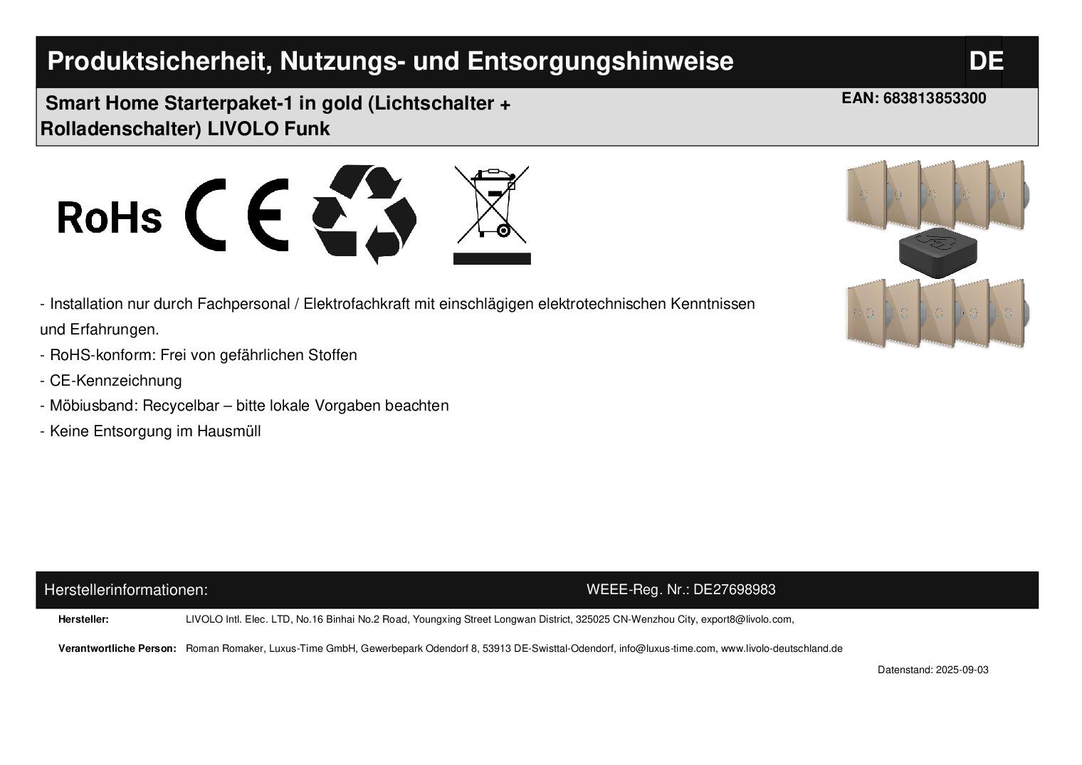 Vorteilspaket Livolo Funk-Schalter in gold und Smart Home Steuerung everHome CloudBox 4.0 / Starterpaket 1Die CloudBox ermöglicht es Ihnen, unsere Livolo Funk-Schalter über Ihr Smartphone oder Tablet zu steuern oder Routinen bzw. Zeitpläne anzulegen. Die CloudBox kann die Livolo Schalter steuern und auch die Anbindung an Amazon Alexa / Google Home ist inklusive. Natürlich können auch Produkte weiterer kompatibler Hersteller mit der CloudBox gesteuert werden (z. B. Shelly, Sonoff, Brennenstuhl, LEDVANCE etc.). Wenn Sie die CloudBox verwenden, ersparen Sie sich aufwändiges Programmieren . Mit ein paar Klicks können Sie z. B. festlegen, dass die Rollladen jeden Abend bei Sonnenuntergang automatisch herunterfahren. Sie können auch Gruppen erstellen, falls bestimmte Ereignisse zusammen stattfinden sollen. In diesem Starterpaket erhalten Sie ebenfalls 5 einfache Funk-Lichtschalter, sowie 5 Funk-Rollladenschalter, jeweils inkl. Glasblenden. Somit sind Sie gut gerüstet, um an den wichtigsten Punkten in Ihrem Zuhause die Rollladen zu bestimmten Zeiten hoch- und runterfahren zu lassen oder z. B. die Außenbeleuchtung bei Sonnenuntergang einzuschalten. Über die everHome App kann außerdem eine Funk-Wetterstation angebunden werden, die bei Erreichen von einstellbaren Messwerten die Rollladen automatisch hoch- oder runterfahren lassen kann (z. B. erhöhte Windstärken oder hohe Sonneneinstrahlung). Technische Daten: CloudBox: Geräte-Bezeichnung: CloudBox 4.0 Versorgungsspannung Steckernetzteil Eingang: 230V / 50 Hz Leistungsaufnahme Steckernetzteil: 3 W max. Versorgungsspannung: 5 V DC Stromaufnahme: 2000 mA max. Leistungsaufnahme Ruhebetrieb: 1,1 W Umgebungstemperatur: 5 bis 35 °C Abmessungen: 100 x 35 x 100 mm Gewicht: 134 g Funkfrequenz: 433 MHz, 868 MHz Funk-Schalter: Betriebsspannung: AC110~250V, 50Hz60Hz Max. Strom für jeden Gang: 2.5 A Max. Leistung für jeden Gang: 500W/220V oder 250W/120V Ruhestromverbrauch: weniger als 0,1 mW Lebensdauer: über 100.000 Zyklen Abmessungen: 80 x 80 x 34 mm Lieferumfang: Im Lieferumfang enthalten ist: