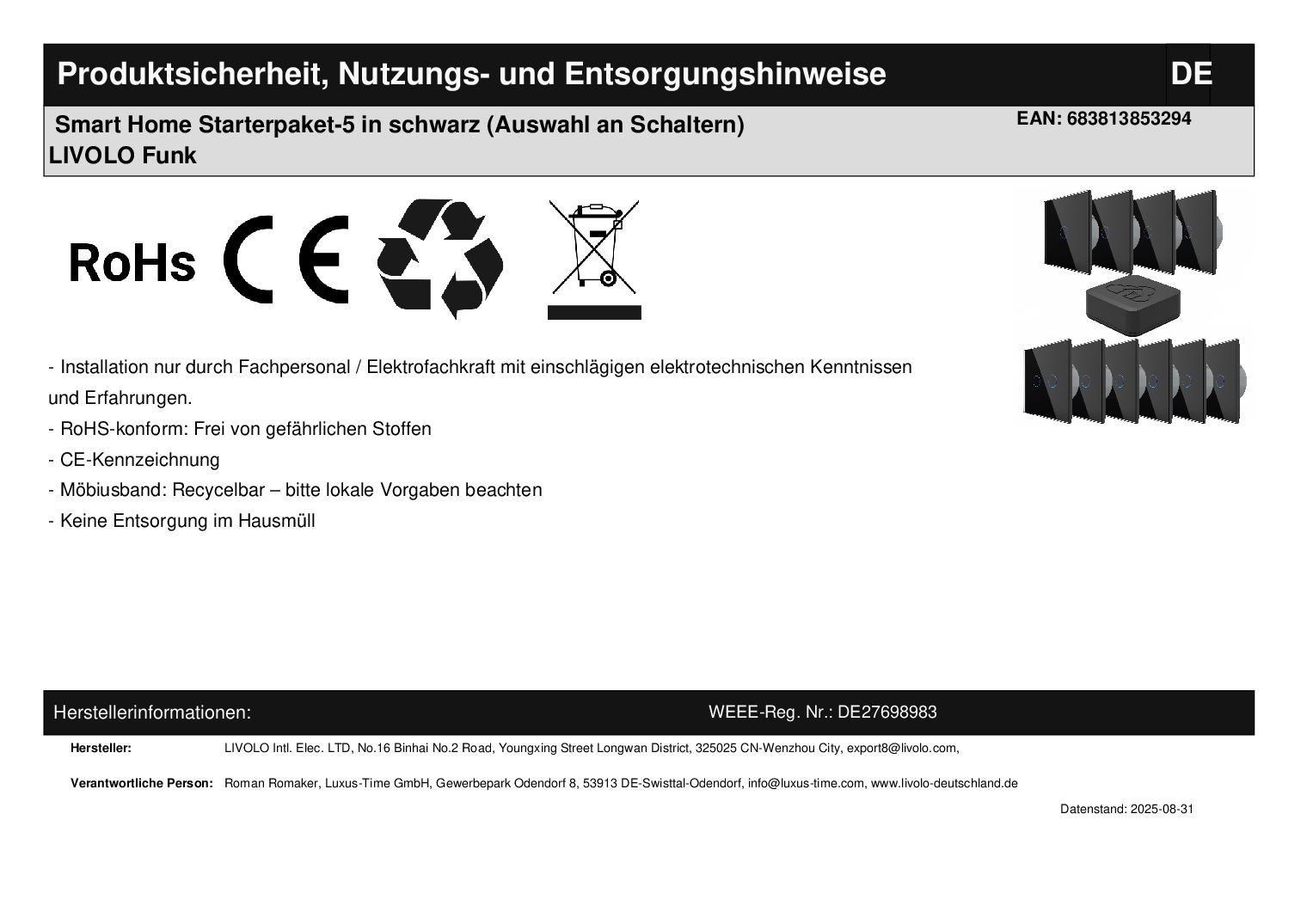 Vorteilspaket Livolo Funk-Schalter in schwarz und Smart Home Steuerung everHome CloudBox 4.0 / Starterpaket 5Die CloudBox ermöglicht es Ihnen, unsere Livolo Funk-Schalter über Ihr Smartphone oder Tablet zu steuern oder Routinen bzw. Zeitpläne anzulegen. Die CloudBox kann die Livolo Schalter steuern und auch die Anbindung an Amazon Alexa / Google Home ist inklusive. Natürlich können auch Produkte weiterer kompatibler Hersteller mit der CloudBox gesteuert werden (z. B. Shelly, Sonoff, Brennenstuhl, LEDVANCE etc.). Wenn Sie die CloudBox verwenden, ersparen Sie sich aufwändiges Programmieren . Mit ein paar Klicks können Sie z. B. festlegen, dass die Rollladen jeden Abend bei Sonnenuntergang automatisch herunterfahren. Sie können auch Gruppen erstellen, falls bestimmte Ereignisse zusammen stattfinden sollen. In diesem Starterpaket erhalten Sie ebenfalls 2 Funk-Lichtschalter, 1 Funk-Wechsel-/Kreuzschalter, 1 Funk-Dimmerschalter, 2 Funk-Rollladenschalter und 2 Funk-Serienwechsel-/Kreuzschalter, jeweils inkl. Glasblenden. Somit sind Sie gut gerüstet, um an den wichtigsten Punkten in Ihrem Zuhause das Licht nach Bedarf über Ihr Smartphone ein- oder ausgeschaltet wird oder die Außenbeleuchtung zum Sonnenuntergang eingeschaltet wird. Da Sie pro Wechselschaltung nur einen Funk-Wechselschalter benötigen , können Sie so fast das komplette Licht in Ihrem ganzen Haus über Ihr Smartphone steuern. Über die everHome App kann außerdem eine Funk-Wetterstation angebunden werden, die bei Erreichen von einstellbaren Messwerten die Rollladen automatisch hoch- oder runterfahren lassen kann (z. B. erhöhte Windstärken oder hohe Sonneneinstrahlung). Technische Daten: CloudBox: Geräte-Bezeichnung: CloudBox 4.0 Versorgungsspannung Steckernetzteil Eingang: 230V / 50 Hz Leistungsaufnahme Steckernetzteil: 3 W max. Versorgungsspannung: 5 V DC Stromaufnahme: 2000 mA max. Leistungsaufnahme Ruhebetrieb: 1,1 W Umgebungstemperatur: 5 bis 35 °C Abmessungen: 100 x 35 x 100 mm Gewicht: 134 g Funkfrequenz: 433 MHz, 868 MHz Funk-Schalter: Betriebsspannung: AC110~250V, 50Hz60Hz Max. Strom für jeden Gang: 2.5 A Max. Leistung für jeden Gang: 500W/220V oder 250W/120V Ruhestromverbrauch: weniger als 0,1 mW Lebensdauer: über 100.000 Zyklen Abmessungen: 80 x 80 x 34 mm Lieferumfang: Im Lieferumfang enthalten ist: