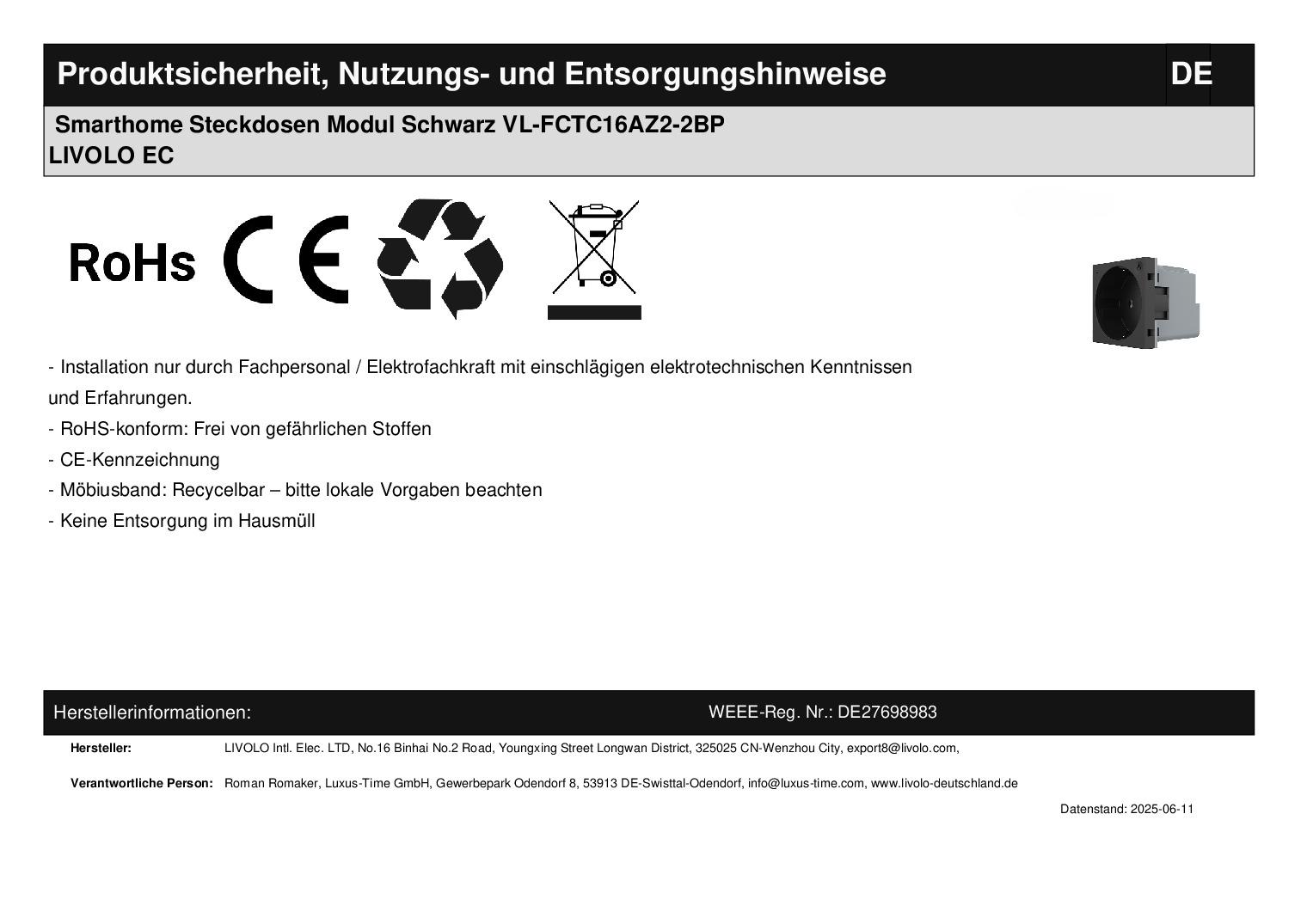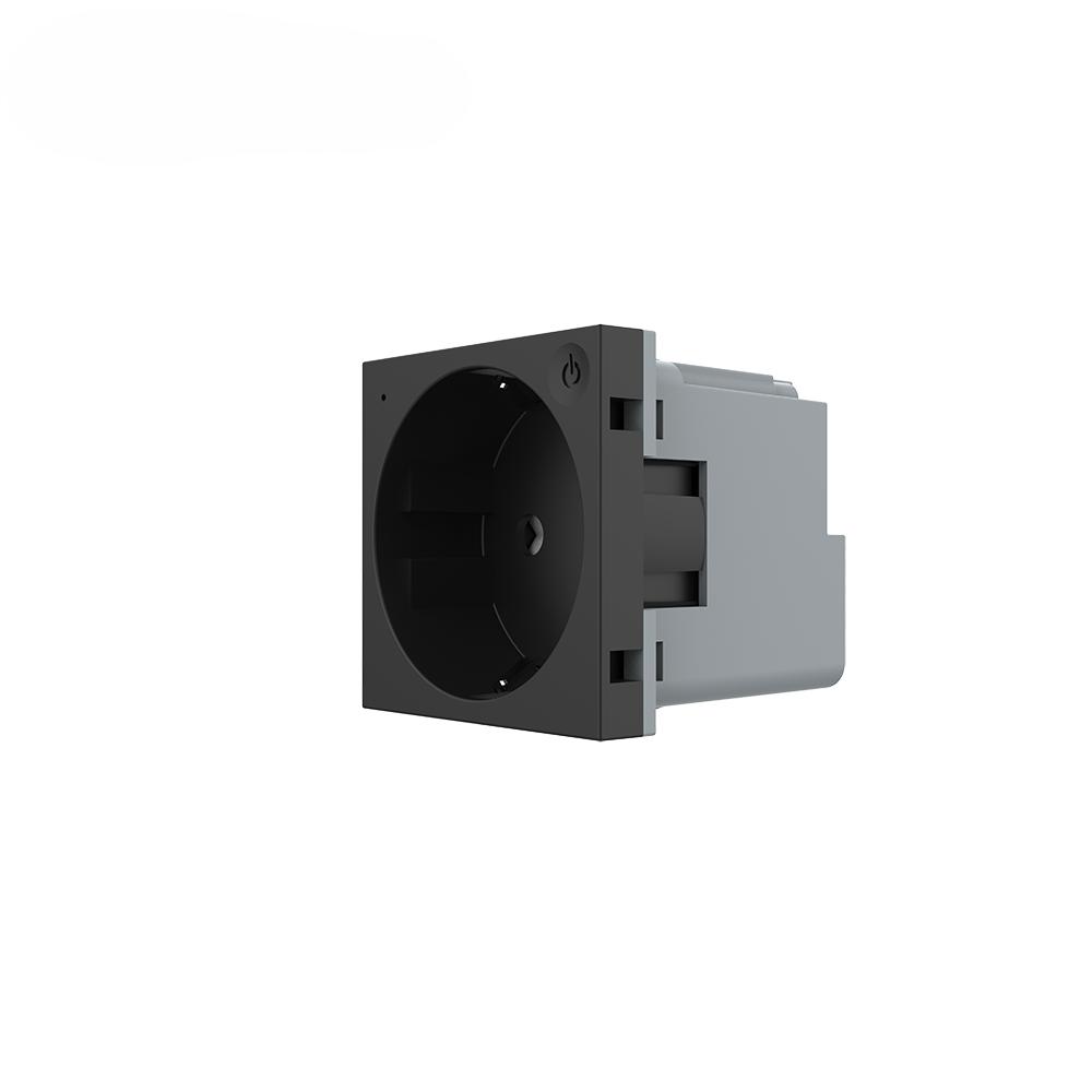 Livolo EC Steckdosen-Modul in SchwarzBitte beachten Sie, dass es sich hierbei nur um ein Modul ohne Glasblende handelt. Die Livolo EC Steckdose ermöglicht es Ihnen zusammen mit dem Livolo EC Gateway , die Geräte, die an die Steckdose angeschlossen werden, per App zu steuern oder eine Routine zu hinterlegen. Durch die Livolo Home App kann die Steckdose von überall gesteuert werden. Auch die Sprachsteuerung über Google Home oder Amazon Alexa ist möglich. Bitte beachten Sie, dass die Livolo EC Produkte nur mit dem Livolo EC Gateway genutzt werden können. Mit ein paar Klicks in der App können Sie z. B. festlegen, dass die Kaffeemaschine jeden Morgen zu einer bestimmten Uhrzeit angeschaltet wird. In Kombination mit der passenden Glasblende wird diese Steckdose zu einem echten Hingucker. Einfache und schnelle Montage, sowohl vertikal als auch horizontal . In unserem Shop finden Sie auch Spreizkrallen (LG-01) im 2er Pack, für Unterputzdosen ohne Verschraubungsmöglichkeit. Geeignet für Hohlwände und ältere Häuser (Baujahr vor 1970). Bei Verwendung von Spreizkrallen sind 68 mm große Unterputzdosen besser geeignet. Die Module werden mittels der beiliegenden Metallrahmen durch Schrauben an den Unterputzdosen befestigt. Der Austausch erfolgt wie bei anderen Wipp-Schalter-Herstellern. Ersetzen Sie einfach Ihre alten Wipp-Schalter durch ein neues, langlebiges Design. Die Verkabelung bleibt die gleiche. Die Lichtschalter- und Steckdosen-Module sind für Unterputzdosen mit 60-68 mm Durchmesser geeignet . Der Lochabstand für Mehrfach-Blenden beträgt 71 mm. Bei uns erhalten Sie die komplette Livolo Bandbreite; von einem einfachen Wipp-Lichtschalter bis zum smarthome-fähigen Touch-Rollladenschalter. Technische Daten: Betriebsspannung: 100-250V Stromspannung: 50/60Hz 16A Entfernung: max. innen 10m, freie Fläche 20m Schutzart: IP 20 Lebensdauer: über 50000 Male Abmessungen: 71 mm x 71 mm x 45 mm Lieferumfang: Im Lieferumfang enthalten ist: