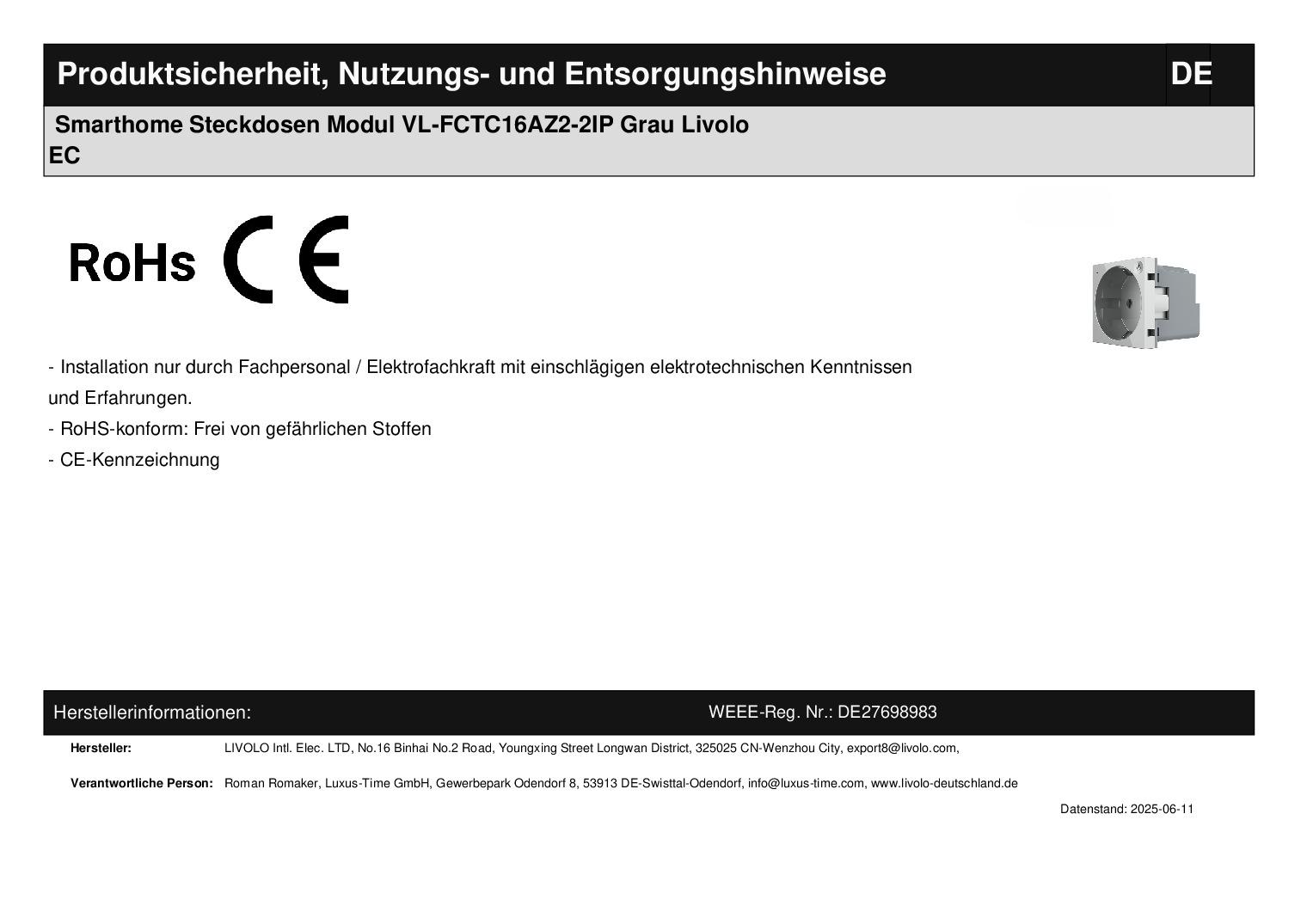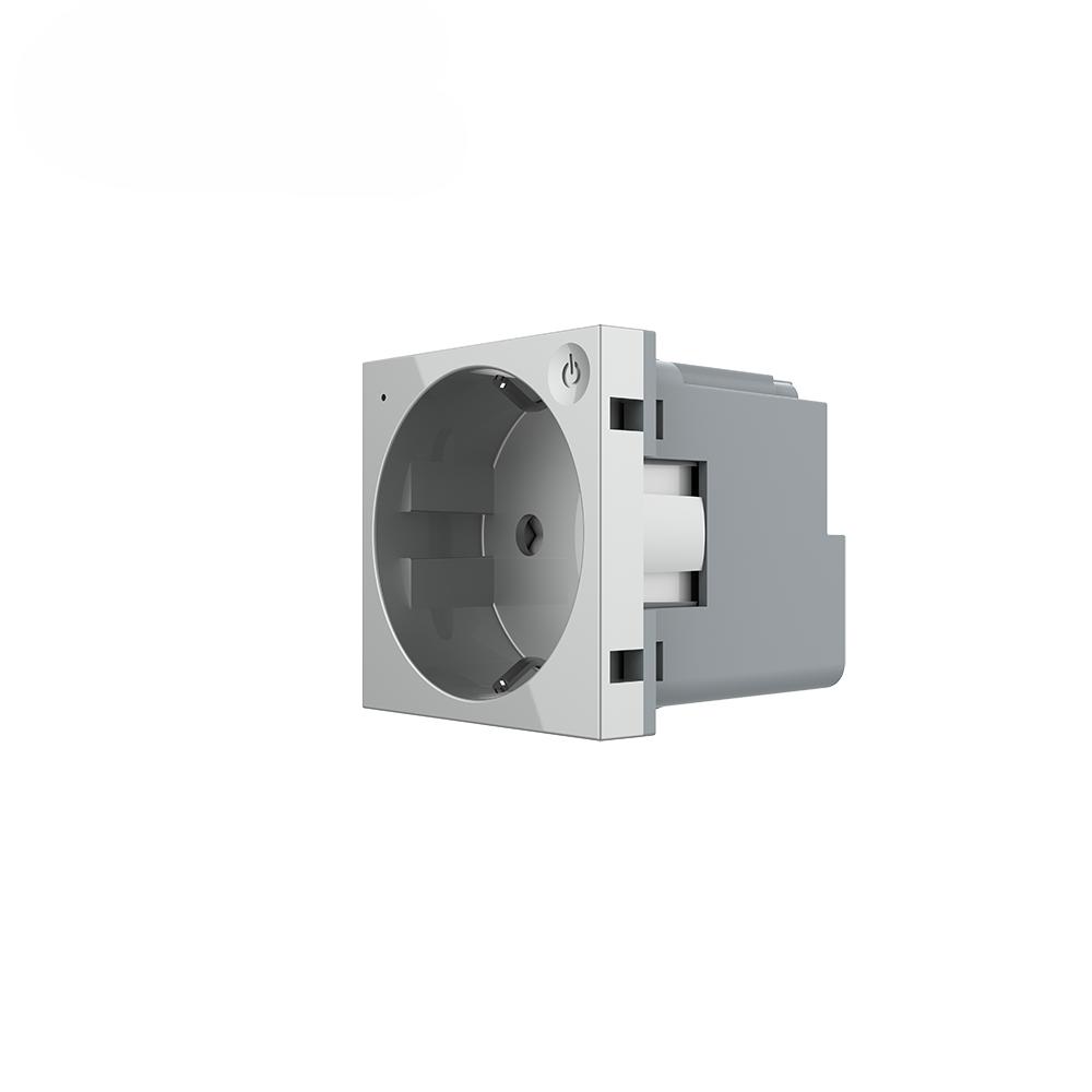 Livolo EC Steckdosen-Modul in GrauBitte beachten Sie, dass es sich hierbei nur um ein Modul ohne Glasblende handelt. Die Livolo EC Steckdose ermöglicht es Ihnen zusammen mit dem Livolo EC Gateway, die Geräte, die an die Steckdose angeschlossen werden, per App zu steuern oder eine Routine zu hinterlegen. Durch die Livolo Home App kann die Steckdose von überall gesteuert werden. Auch die Sprachsteuerung über Google Home oder Amazon Alexa ist möglich. Bitte beachten Sie, dass die Livolo EC Produkte nur mit dem Livolo EC Gateway genutzt werden können. Mit ein paar Klicks in der App können Sie z. B. festlegen, dass die Kaffeemaschine jeden Morgen zu einer bestimmten Uhrzeit angeschaltet wird. In Kombination mit der passenden Glasblende wird diese Steckdose zu einem echten Hingucker. Einfache und schnelle Montage, sowohl vertikal als auch horizontal . In unserem Shop finden Sie auch Spreizkrallen (LG-01) im 2er Pack, für Unterputzdosen ohne Verschraubungsmöglichkeit. Geeignet für Hohlwände und ältere Häuser (Baujahr vor 1970). Bei Verwendung von Spreizkrallen sind 68 mm große Unterputzdosen besser geeignet. Die Module werden mittels der beiliegenden Metallrahmen durch Schrauben an den Unterputzdosen befestigt. Der Austausch erfolgt wie bei anderen Wipp-Schalter-Herstellern. Ersetzen Sie einfach Ihre alten Wipp-Schalter durch ein neues, langlebiges Design. Die Verkabelung bleibt die gleiche. Die Lichtschalter- und Steckdosen-Module sind für Unterputzdosen mit 60-68 mm Durchmesser geeignet . Der Lochabstand für Mehrfach-Blenden beträgt 71 mm. Bei uns erhalten Sie die komplette Livolo Bandbreite; von einem einfachen Wipp-Lichtschalter bis zum smarthome-fähigen Touch-Rollladenschalter. Technische Daten: Betriebsspannung: 100-250V Stromspannung: 50/60Hz 16A Entfernung: max. innen 10m, freie Fläche 20m Schutzart: IP 20 Lebensdauer: über 50000 Male Abmessungen: 71 mm x 71 mm x 45 mm Lieferumfang: Im Lieferumfang enthalten ist: