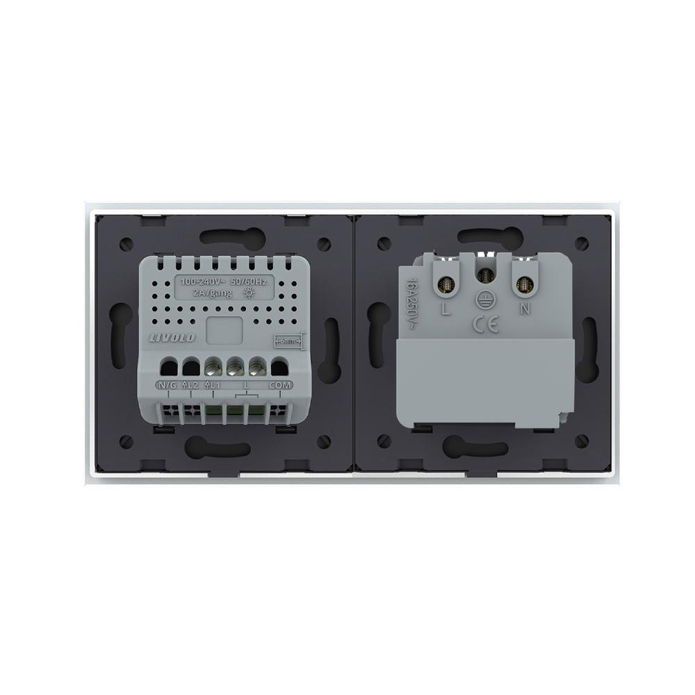 Livolo EC Wechselschalter- und Steckdosen-Modul mit zweifachem Glasrahmen in Weiß Dies ist ein einfacher Livolo EC Wechselschalter, zum ein- und ausschalten einer Leuchte bzw. Leuchtengruppe. Zusätzlich verfügt es über eine Wechselschalt-Funktion, sodass die Leuchte von bis zu vier Schaltern aus ein- und ausgeschaltet werden kann. Die Livolo Touch-Wechselschalter können gleichzeitig auch als Kreuzschalter verwendet werden. Der Anschluss aller korrespondierender Kabel der weiteren Touch-Wechselschalter erfolgt zusammen im COM-Anschluss des Schalters, der als Kreuzschalter verwendet wird. Da im Anschluss eine Synchronisation ( YouTube-Video ) erfolgen muss, können innerhalb einer Wechselschaltung nur Livolo Touch-Wechselschalter verwendet werden. Der Schalter ist außerdem per App steuerbar. Pro Wechselschaltung ist nur ein EC Wechselschalter nötig. Die Livolo EC Steckdose ermöglicht es Ihnen, die Geräte, die an die Steckdose angeschlossen werden, per App zu steuern oder eine Routine zu hinterlegen. Bitte beachten Sie, dass die Livolo EC Produkte nur mit dem Livolo EC Gateway genutzt werden können. Durch die Livolo Home App können sowohl der Lichtschalter als auch die Steckdose von überall gesteuert werden. Auch die Sprachsteuerung über Google Home oder Amazon Alexa ist möglich. Mit ein paar Klicks in der App können Sie z. B. festlegen, dass die Kaffeemaschine jeden Morgen zu einer bestimmten Uhrzeit angeschaltet wird. Oder die Außenbeleuchtung im Winter früher eingeschaltet wird. Durch die Kombination mit der passenden Glasblende wird diese Kombination zu einem echten Hingucker. Einfache und schnelle Montage, sowohl vertikal als auch horizontal . In unserem Shop finden Sie auch Spreizkrallen (LG-01) im 2er Pack, für Unterputzdosen ohne Verschraubungsmöglichkeit. Geeignet für Hohlwände und ältere Häuser (Baujahr vor 1970). Bei Verwendung von Spreizkrallen sind 68 mm große Unterputzdosen besser geeignet. Die Module werden mittels der beiliegenden Metallrahmen durch Schrauben an den Unterputzdosen befestigt. Der Austausch erfolgt wie bei anderen Wipp-Schalter-Herstellern. Ersetzen Sie einfach Ihre alten Wipp-Schalter durch ein neues, langlebiges Design. Die Verkabelung bleibt die gleiche. Die Lichtschalter- und Steckdosen-Module sind für Unterputzdosen mit 60-68 mm Durchmesser geeignet . Der Lochabstand für Mehrfach-Blenden beträgt 71 mm. Bei uns erhalten Sie die komplette Livolo Bandbreite; von einem einfachen Wipp-Lichtschalter bis zum smarthome-fähigen Touch-Rollladenschalter. Technische Daten: Betriebsspannung: 100-250V Stromspannung Steckdose: 50/60Hz 16A Max. Leistung Schalter: 500W/Gang Entfernung: max. innen 10m, freie Fläche 20m Schutzart: IP 20 Lebensdauer: über 50000 Male Abmessungen: 157 mm x 80 mm x 45 mm Lieferumfang: Im Lieferumfang enthalten ist: