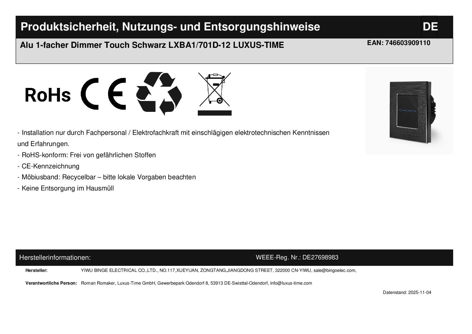 Dieser Artikel besteht aus einem schwarzen, einfachen Aluminiumrahmen, sowie einem schwarzen Dimmer-Modul.Der einfache Lichtschalter ist zum ein- und ausschalten einer Leuchte bzw. einer Lichtgruppe, sowie dem dimmen geeignet. Einfache und schnelle Montage, sowohl vertikal als auch horizontal . Alle Touch-Schalter sind beleuchtet . Wenn die angeschlossene Leuchte ausgeschaltet ist, leuchtet der Schalter schwach blau, wenn die Leuchte eingeschaltet ist, leuchtet der Schalter in einem stärkeren Blau. Die Touch-Schalter sind mit allen Arten von Leuchten verwendbar (Halogen, LED, Energiesparlampen), außer LED-Strips . Bei LED-Strips ist die Watt-Zahl in den meisten Fällen zu gering und kann dadurch zu Problemen führen. Sollten Sie Probleme wie z. B. Flackern von Leuchten bzw. das die Leuchten nach kurzer Zeit von alleine wieder ausschalten, haben, sollten Sie die angeschlossene Watt-Leistung erhöhen. Der Austausch erfolgt wie bei anderen Wipp-Schalter-Herstellern. Ersetzen Sie einfach Ihre alten Wipp-Schalter durch ein neues, langlebiges Design. Die Lichtschalter- und Steckdosen-Module sind für Unterputzdosen mit 60 mm Durchmesser geeignet . Die Module werden mittels der den Aluminiumblenden beiliegenden Metallrahmen durch Schrauben an den Unterputzdosen befestigt. Bei uns erhalten Sie die komplette Luxus-Time Bandbreite; von einem einfachen Wipp-Lichtschalter bis zum smarthome-fähigen Touch-Rollladenschalter. Hinweis zur Installation: Lichtschalter stromlos anschließen. Glasblende aufsetzen. Wichtig!!! Strom erst einschalten, wenn die Glasblende aufgesetzt wurde. Sollte dieser Hinweis nicht beachtet werden, kann es vorkommen, dass der Lichtschalter nicht reagiert. Fragen? Rufen Sie uns an oder senden Sie uns eine E-Mail. Wir beraten Sie gerne! Technische Daten :Abmessungen: 86 x 86 x 35 mm Betriebsspannung: AC110 ~ 250V, 50Hz60Hz max. Stromzufuhr für jeden Gang 2.5 A max. Leistung für jeden Gang: 700W Ruhestromverbrauch: weniger als 0,1mW Lebensdauer: 100.000 Benutzungen Montage in Standard UP-Dose mit Durchmesser von 60mm mit Schraubgewinde Herstellerangaben:YIWU BINGE ELECTRICAL CO.,LTD.