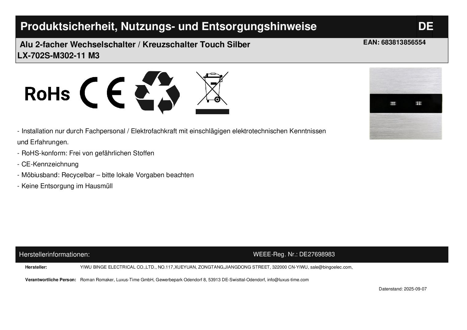 M3 zweifacher Wechselschalter mit Alublende in Silber Dieser Artikel besteht aus einem silbernen Aluminiumrahmen, sowie einem Serienwechselschalter-Modul. Der Serienwechselschalter ist zum ein- und ausschalten zweier Leuchten bzw. Lichtgruppen geeignet unabhängig voneinander. Zusätzlich verfügt der Schalter noch über eine Wechselschaltfunktion, wodurch beide Lichtkreise von bis zu vier weiteren Stellen aus geschaltet werden können. Alle Touch-Schalter sind beleuchtet . Wenn die angeschlossene Leuchte ausgeschaltet ist, leuchtet der Schalter schwach blau, wenn die Leuchte eingeschaltet ist, leuchtet der Schalter in einem stärkeren Blau. Die Touch-Schalter sind mit allen Arten von Leuchten verwendbar (Halogen, LED, Energiesparlampen), außer LED-Strips . Bei LED-Strips ist die Watt-Zahl in den meisten Fällen zu gering und kann dadurch zu Problemen führen. Sollten Sie Probleme wie z. B. Flackern von Leuchten bzw. das die Leuchten nach kurzer Zeit von alleine wieder ausschalten, haben, sollten Sie die Watt-Leistung erhöhen. Der Austausch erfolgt wie bei anderen Wipp-Schalter-Herstellern. Ersetzen Sie einfach Ihre alten Wipp-Schalter durch ein neues, langlebiges Design. Die Lichtschalter- und Steckdosen-Module sind für Unterputzdosen mit 60 mm Durchmesser geeignet . Die Module werden mittels der den Aluminiumblenden beiliegenden Metallrahmen durch Schrauben an den Unterputzdosen befestigt. Hinweis zur Installation: Lichtschalter stromlos anschließen. Glasblende aufsetzen. Wichtig!!! Strom erst einschalten, wenn die Glasblende aufgesetzt wurde. Sollte dieser Hinweis nicht beachtet werden, kann es vorkommen, dass der Lichtschalter nicht reagiert. Fragen? Rufen Sie uns an oder senden Sie uns eine E-Mail. Wir beraten Sie gerne! Technische Daten :Abmessungen: 86 x 86 x 35 mm Betriebsspannung: AC110 ~ 250V, 50Hz60Hz max. Stromzufuhr für jeden Gang 2.5 A max. Leistung für jeden Gang: 800W Ruhestromverbrauch: weniger als 0,1mW Lebensdauer: 100.000 Benutzungen Montage in Standard UP-Dose mit Durchmesser von 60mm mit Schraubgewinde Herstellerangaben:YIWU BINGE ELECTRICAL CO.,LTD.
