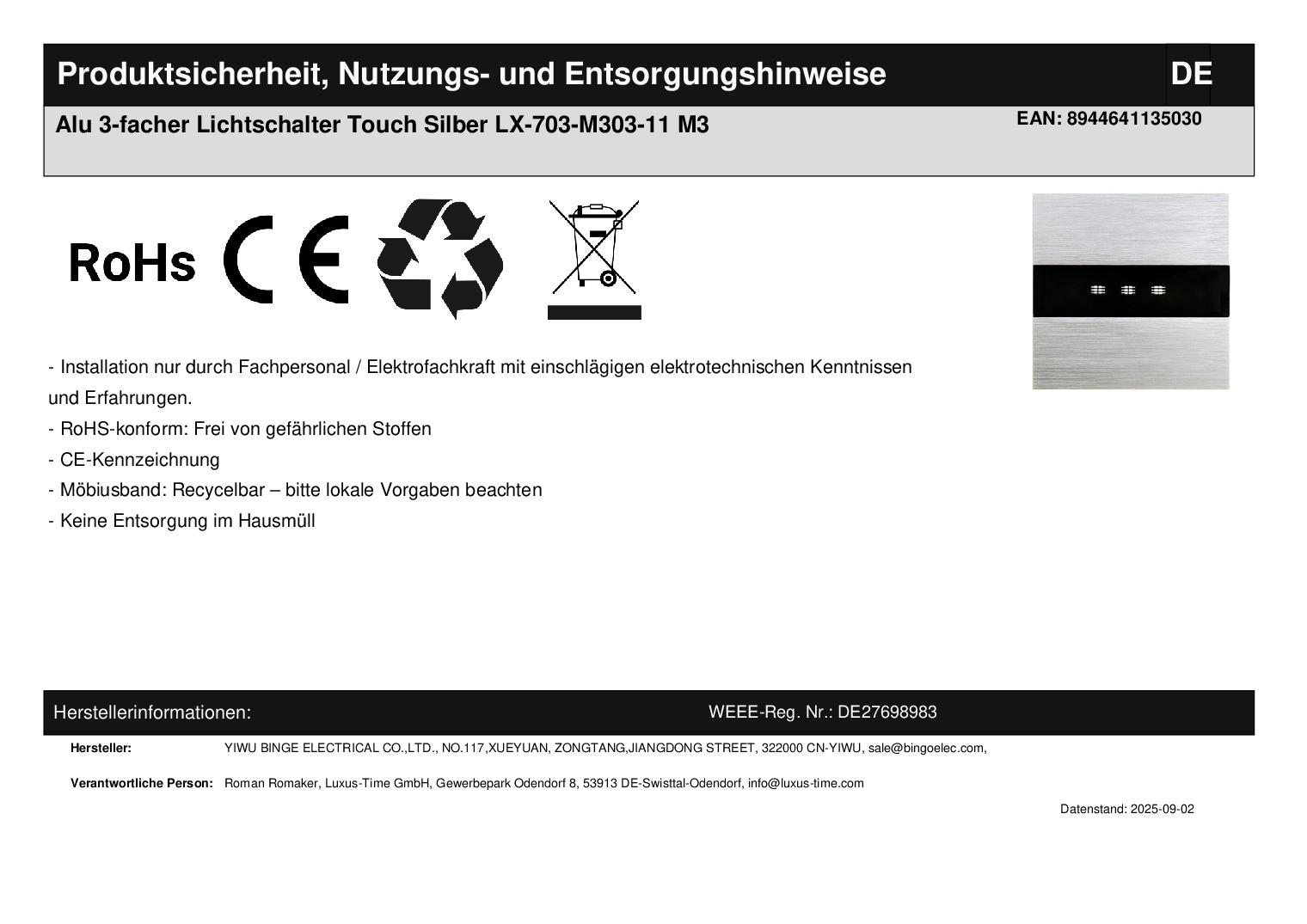 Dieser Artikel besteht aus einem silbernen Aluminiumrahmen, sowie einem 3-fach Lichtschalter-Modul.Der dreifache Lichtschalter ist zum ein- und ausschalten dreier Leuchten bzw. einer Lichtgruppen geeignet. Alle Touch-Schalter sind beleuchtet . Wenn die angeschlossene Leuchte ausgeschaltet ist, leuchtet der Schalter schwach blau, wenn die Leuchte eingeschaltet ist, leuchtet der Schalter in einem stärkeren Blau. Die Touch-Schalter sind mit allen Arten von Leuchten verwendbar (Halogen, LED, Energiesparlampen), außer LED-Strips . Bei LED-Strips ist die Watt-Zahl in den meisten Fällen zu gering und kann dadurch zu Problemen führen. Sollten Sie Probleme wie z. B. Flackern von Leuchten bzw. das die Leuchten nach kurzer Zeit von alleine wieder ausschalten, haben, können Sie einen Widerstand-Adapter verwenden. Der Austausch erfolgt wie bei anderen Wipp-Schalter-Herstellern. Ersetzen Sie einfach Ihre alten Wipp-Schalter durch ein neues, langlebiges Design. Die Lichtschalter- und Steckdosen-Module sind für Unterputzdosen mit 60 mm Durchmesser geeignet . Die Module werden mittels der den Aluminiumblenden beiliegenden Metallrahmen durch Schrauben an den Unterputzdosen befestigt. Hinweis zur Installation: Lichtschalter stromlos anschließen. Glasblende aufsetzen. Wichtig!!! Strom erst einschalten, wenn die Glasblende aufgesetzt wurde. Sollte dieser Hinweis nicht beachtet werden, kann es vorkommen, dass der Lichtschalter nicht reagiert. Fragen? Rufen Sie uns an oder senden Sie uns eine E-Mail. Wir beraten Sie gerne! Technische Daten :Abmessungen: 86 x 86 x 35 mm Betriebsspannung: AC110 ~ 250V, 50Hz60Hz max. Stromzufuhr für jeden Gang 2.5 A max. Leistung für jeden Gang: 800W Ruhestromverbrauch: weniger als 0,1mW Lebensdauer: 100.000 Benutzungen Montage in Standard UP-Dose mit Durchmesser von 60mm mit Schraubgewinde Herstellerangaben:YIWU BINGE ELECTRICAL CO.,LTD.