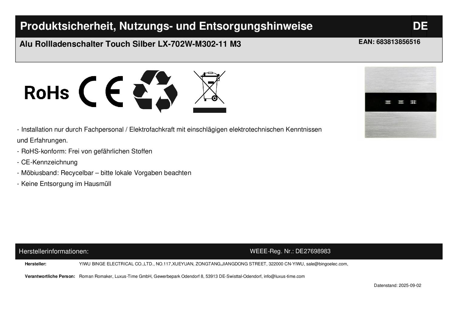 M3 Rollladenschalter-Modul mit Alublende in Silber Dieser Artikel besteht aus einem silbernen Aluminiumrahmen, sowie einem Rollladenschalter-Modul. Der Rollladenschalter ist für das hoch- und herunterfahren einer Rolllade, Jalousie, Raffstore etc. geeignet. Durch erneutes Drücken der Taste ist ein pausieren bzw. anhalten des Rollos möglich. Alle Touch-Schalter sind beleuchtet . Wenn die angeschlossene Leuchte ausgeschaltet ist, leuchtet der Schalter schwach blau, wenn die Leuchte eingeschaltet ist, leuchtet der Schalter in einem stärkeren Blau. Die Lichtschalter- und Steckdosen-Module sind für Unterputzdosen mit 60 mm Durchmesser geeignet . Die Module werden mittels der den Aluminiumblenden beiliegenden Metallrahmen durch Schrauben an den Unterputzdosen befestigt. Hinweis zur Installation: Lichtschalter stromlos anschließen. Glasblende aufsetzen. Wichtig!!! Strom erst einschalten, wenn die Glasblende aufgesetzt wurde. Sollte dieser Hinweis nicht beachtet werden, kann es vorkommen, dass der Lichtschalter nicht reagiert. Fragen? Rufen Sie uns an oder senden Sie uns eine E-Mail. Wir beraten Sie gerne! Technische Daten : Abmessungen: 86 x 86 x 35 mm Betriebsspannung: AC110 ~ 250V, 50Hz60Hz max. Stromzufuhr für jeden Gang 2.5 A max. Leistung für jeden Gang: 800W Ruhestromverbrauch: weniger als 0,1mW Lebensdauer: 100.000 Benutzungen Montage in Standard UP-Dose mit Durchmesser von 60mm mit Schraubgewinde Herstellerangaben:YIWU BINGE ELECTRICAL CO.,LTD.
