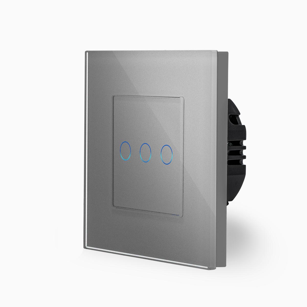 Dieser Artikel besteht aus einem grauen, einfachen Glasrahmen, sowie einem grauen Dimmer-Modul.