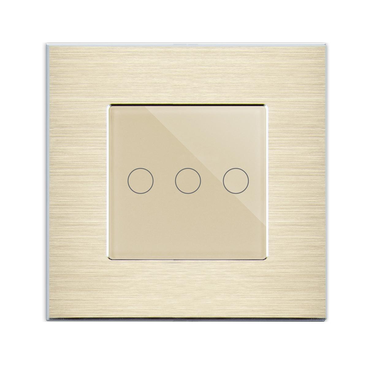 POINT einfaches Touch-Dimmer-Modul mit einfachem Aluminiumrahmen in GoldDer einfache Lichtschalter ist zum ein- und ausschalten einer Leuchte bzw. einer Lichtgruppe, sowie dem dimmen geeignet.Einfache und schnelle Montage, sowohl vertikal als auch horizontal . Alle Touch-Schalter sind beleuchtet . Wenn die angeschlossene Leuchte ausgeschaltet ist, leuchtet der Schalter schwach blau, wenn die Leuchte eingeschaltet ist, leuchtet der Schalter in einem stärkeren Blau. Die Touch-Schalter sind mit allen Arten von Leuchten verwendbar (Halogen, LED, Energiesparlampen), außer LED-Strips . Bei LED-Strips ist die Watt-Zahl in den meisten Fällen zu gering und kann dadurch zu Problemen führen. Sollten Sie Probleme wie z. B. Flackern von Leuchten bzw. das die Leuchten nach kurzer Zeit von alleine wieder ausschalten, haben, sollten Sie die Watt-Leistung erhöhen. Der Austausch erfolgt wie bei anderen Wipp-Schalter-Herstellern. Ersetzen Sie einfach Ihre alten Wipp-Schalter durch ein neues, langlebiges Design. Die Lichtschalter- und Steckdosen-Module sind für Unterputzdosen mit 60 mm Durchmesser geeignet . Die Module werden mittels der den Aluminiumblenden beiliegenden Metallrahmen durch Schrauben an den Unterputzdosen befestigt. Bei uns erhalten Sie die komplette Point Bandbreite; von einem einfachen Wipp-Lichtschalter bis zum smarthome-fähigen Touch-Rollladenschalter. Hinweis zur Installation: Lichtschalter stromlos anschließen. Glasblende aufsetzen. Wichtig!!! Strom erst einschalten, wenn die Glasblende aufgesetzt wurde. Sollte dieser Hinweis nicht beachtet werden, kann es vorkommen, dass der Lichtschalter nicht reagiert. Fragen? Rufen Sie uns an oder senden Sie uns eine E-Mail. Wir beraten Sie gerne! Technische Daten:Abmessungen: 86 x 86 x 35 mm Betriebsspannung: AC110 ~ 250V, 50Hz60Hz max. Stromzufuhr für jeden Gang 2.5 A max. Leistung für jeden Gang: 700W Ruhestromverbrauch: weniger als 0,1mW Lebensdauer: 100.000 Benutzungen Montage in Standard UP-Dose mit Durchmesser von 60mm mit Schraubgewinde Herstellerangaben:YIWU BINGE ELECTRICAL CO.,LTD.