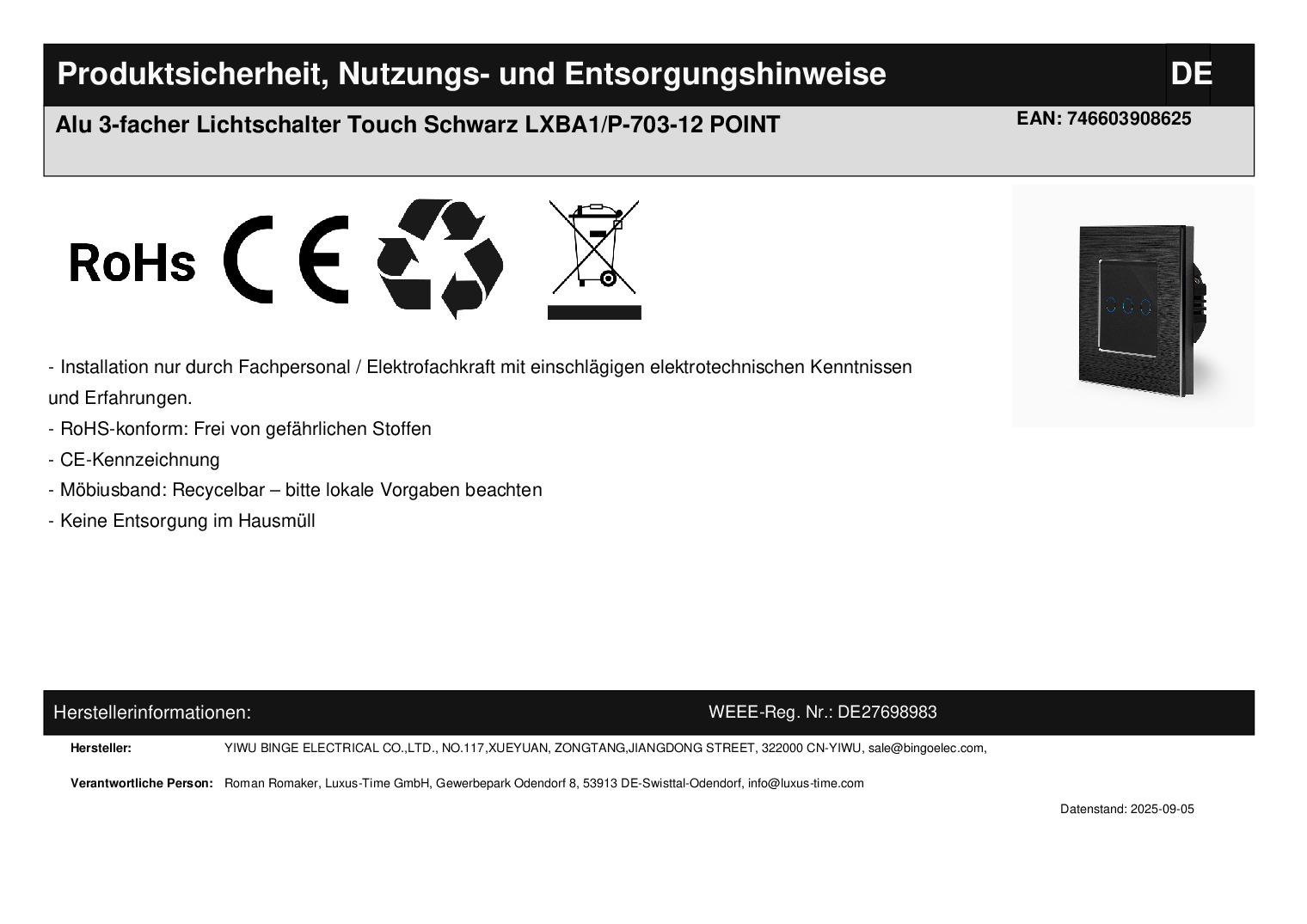 POINT dreifaches Touch-Lichtschalter-Modul mit einfachem Aluminiumrahmen in SchwarzDer dreifache Lichtschalter ist zum ein- und ausschalten dreier Leuchten bzw. Lichtgruppen unabhängig voneinander geeignet.Einfache und schnelle Montage, sowohl vertikal als auch horizontal . Alle Touch-Schalter sind beleuchtet . Wenn die angeschlossene Leuchte ausgeschaltet ist, leuchtet der Schalter schwach blau, wenn die Leuchte eingeschaltet ist, leuchtet der Schalter in einem stärkeren Blau. Die Touch-Schalter sind mit allen Arten von Leuchten verwendbar (Halogen, LED, Energiesparlampen), außer LED-Strips . Bei LED-Strips ist die Watt-Zahl in den meisten Fällen zu gering und kann dadurch zu Problemen führen. Sollten Sie Probleme wie z. B. Flackern von Leuchten bzw. das die Leuchten nach kurzer Zeit von alleine wieder ausschalten, haben, sollten Sie die angeschlossene Watt-Leistung erhöhen. Der Austausch erfolgt wie bei anderen Wipp-Schalter-Herstellern. Ersetzen Sie einfach Ihre alten Wipp-Schalter durch ein neues, langlebiges Design. Die Lichtschalter- und Steckdosen-Module sind für Unterputzdosen mit 60 mm Durchmesser geeignet . Die Module werden mittels der den Aluminiumblenden beiliegenden Metallrahmen durch Schrauben an den Unterputzdosen befestigt. Bei uns erhalten Sie die komplette Point Bandbreite; von einem einfachen Wipp-Lichtschalter bis zum smarthome-fähigen Touch-Rollladenschalter. Hinweis zur Installation: Lichtschalter stromlos anschließen. Glasblende aufsetzen. Wichtig!!! Strom erst einschalten, wenn die Glasblende aufgesetzt wurde. Sollte dieser Hinweis nicht beachtet werden, kann es vorkommen, dass der Lichtschalter nicht reagiert. Fragen? Rufen Sie uns an oder senden Sie uns eine E-Mail. Wir beraten Sie gerne! Technische Daten:Abmessungen: 86 x 86 x 35 mm Betriebsspannung: AC110 ~ 250V, 50Hz60Hz max. Stromzufuhr für jeden Gang 2.5 A max. Leistung für jeden Gang: 800W Ruhestromverbrauch: weniger als 0,1mW Lebensdauer: 100.000 Benutzungen Montage in Standard UP-Dose mit Durchmesser von 60mm mit Schraubgewinde Herstellerangaben:YIWU BINGE ELECTRICAL CO.,LTD.