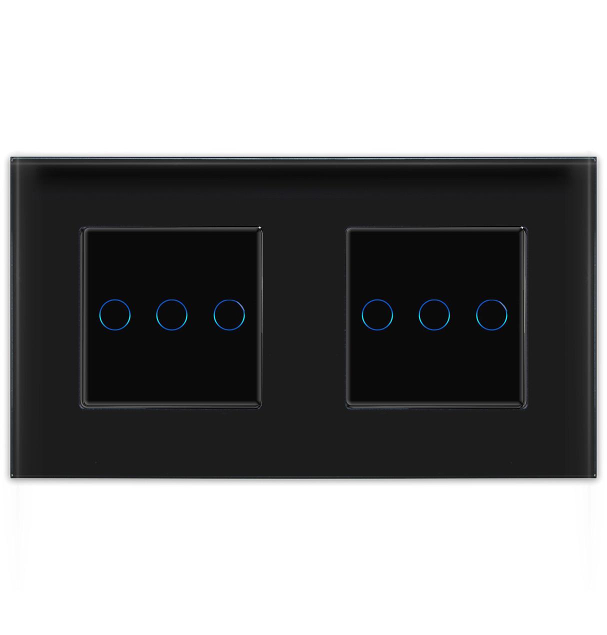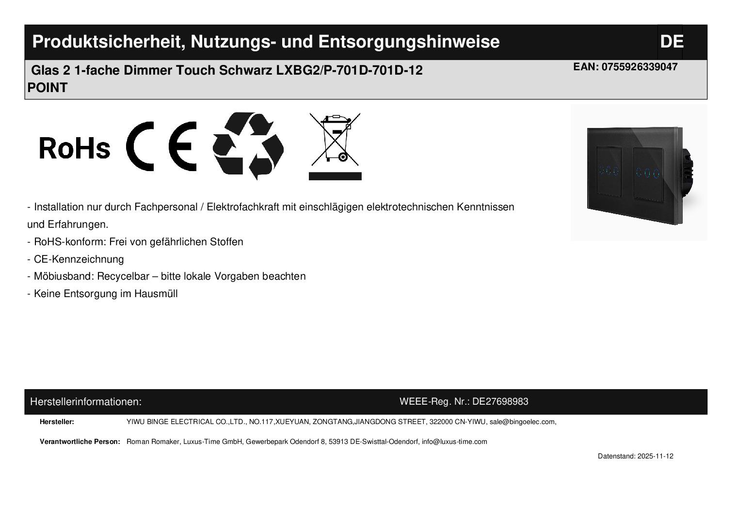 Dieser Artikel besteht aus einem schwarzen, zweifachen Glasrahmen, sowie zwei schwarzen Dimmer-Modulen.Der einfache Lichtschalter ist zum ein- und ausschalten einer Leuchte bzw. einer Lichtgruppe, sowie dem dimmen geeignet. Einfache und schnelle Montage, sowohl vertikal als auch horizontal . Alle Touch-Schalter sind beleuchtet . Wenn die angeschlossene Leuchte ausgeschaltet ist, leuchtet der Schalter schwach blau, wenn die Leuchte eingeschaltet ist, leuchtet der Schalter in einem stärkeren Blau. Die Touch-Schalter sind mit allen Arten von Leuchten verwendbar (Halogen, LED, Energiesparlampen), außer LED-Strips . Bei LED-Strips ist die Watt-Zahl in den meisten Fällen zu gering und kann dadurch zu Problemen führen. Sollten Sie Probleme wie z. B. Flackern von Leuchten bzw. das die Leuchten nach kurzer Zeit von alleine wieder ausschalten, haben, sollten Sie die angeschlossene Watt-Leistung erhöhen. Der Austausch erfolgt wie bei anderen Wipp-Schalter-Herstellern. Ersetzen Sie einfach Ihre alten Wipp-Schalter durch ein neues, langlebiges Design. Die Lichtschalter- und Steckdosen-Module sind für Unterputzdosen mit 60 mm Durchmesser geeignet . Die Module werden mittels der den Glasblenden beiliegenden Metallrahmen durch Schrauben an den Unterputzdosen befestigt. Bei uns erhalten Sie die komplette Point Bandbreite; von einem einfachen Wipp-Lichtschalter bis zum smarthome-fähigen Touch-Rollladenschalter. Hinweis zur Installation: Lichtschalter stromlos anschließen. Glasblende aufsetzen. Wichtig!!! Strom erst einschalten, wenn die Glasblende aufgesetzt wurde. Sollte dieser Hinweis nicht beachtet werden, kann es vorkommen, dass der Lichtschalter nicht reagiert. Fragen? Rufen Sie uns an oder senden Sie uns eine E-Mail. Wir beraten Sie gerne! Technische Daten:Abmessungen: 157 x 86 x 35 mm Betriebsspannung: AC110 ~ 250V, 50Hz60Hz max. Stromzufuhr für jeden Gang 2.5 A max. Leistung für jeden Gang: 700W Ruhestromverbrauch: weniger als 0,1mW Lebensdauer: 100.000 Benutzungen Montage in Standard UP-Dose mit Durchmesser von 60mm mit Schraubgewinde Herstellerangaben:YIWU BINGE ELECTRICAL CO.,LTD.