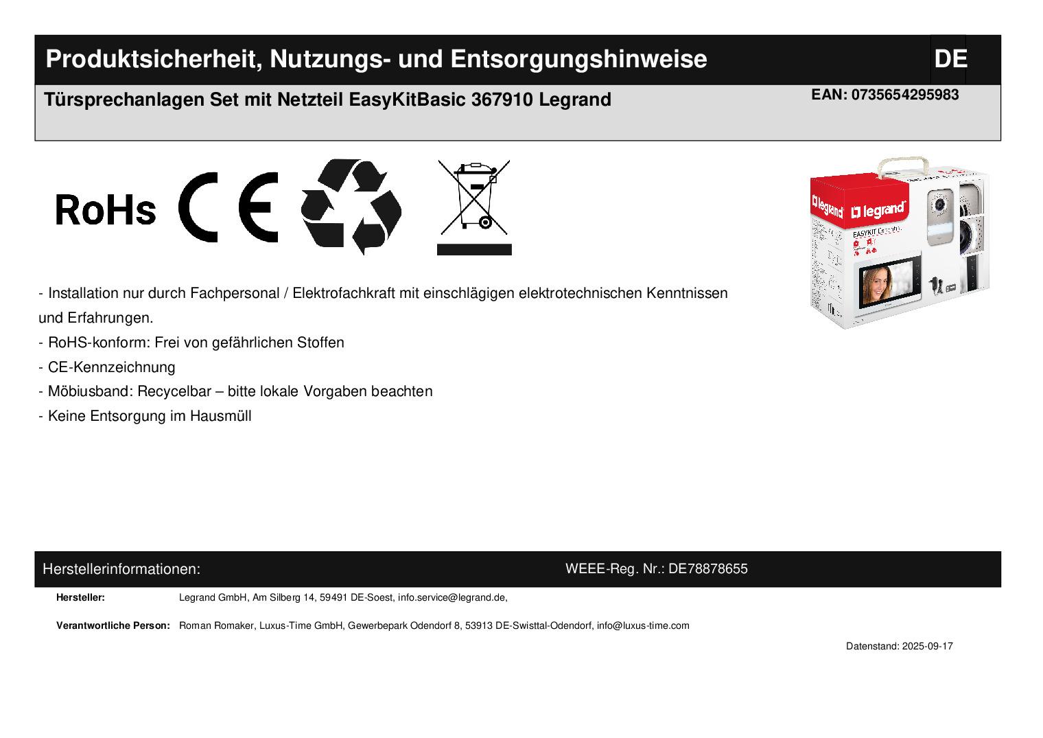 Legrand EasyKit Basic 2-Draht-Türöffnungsstation für 1-/2- FamilienhäuserDiese Türöffnungsstation von Legrand besteht aus einer Außenstation mit Regenschutz und einem 7 Zoll Touchbildschirm für den Innenbereich. Das angebotene Set ist für Einfamilienhäuser geeignet (nach Erweiterung des Sets auch für Zweifamilienhäuser).