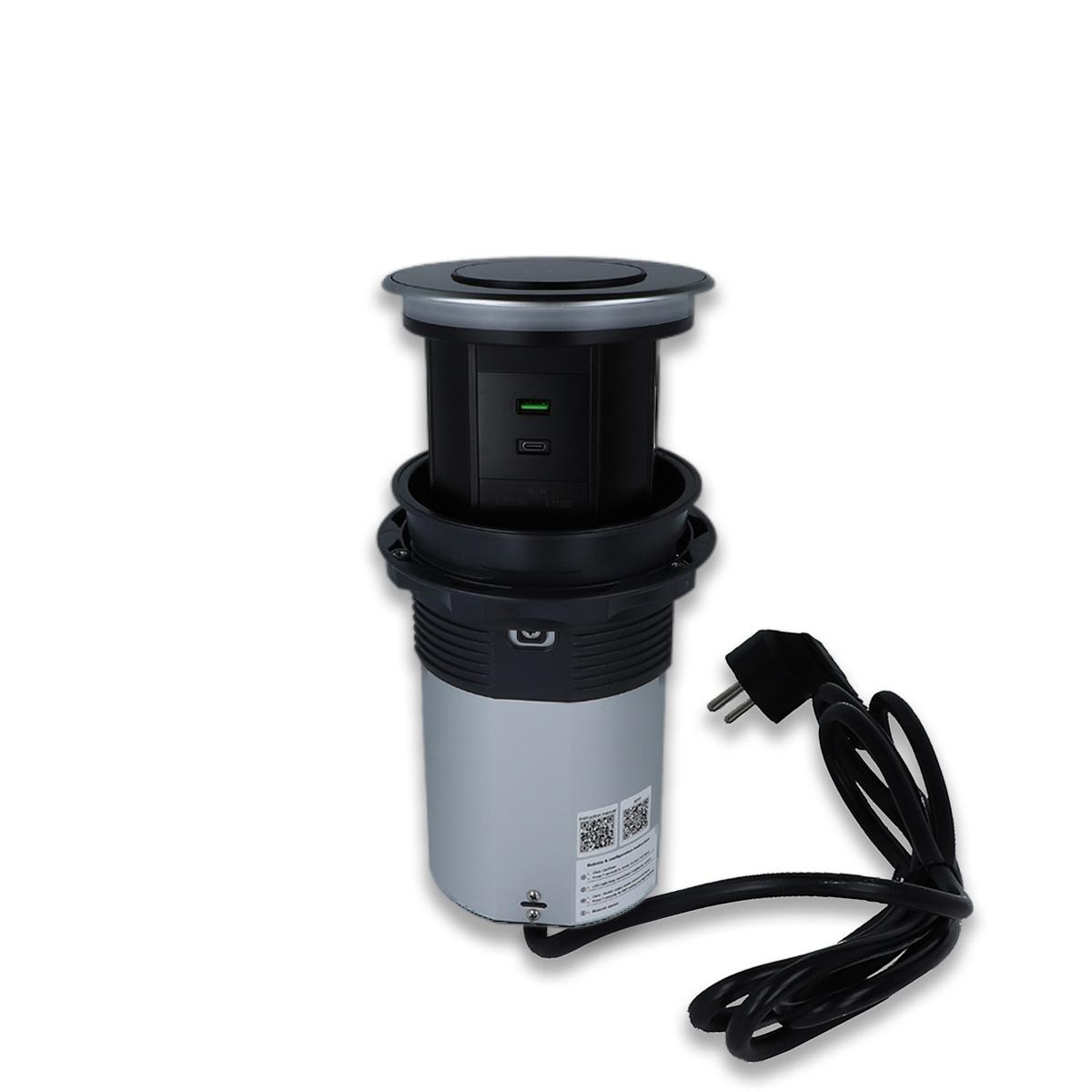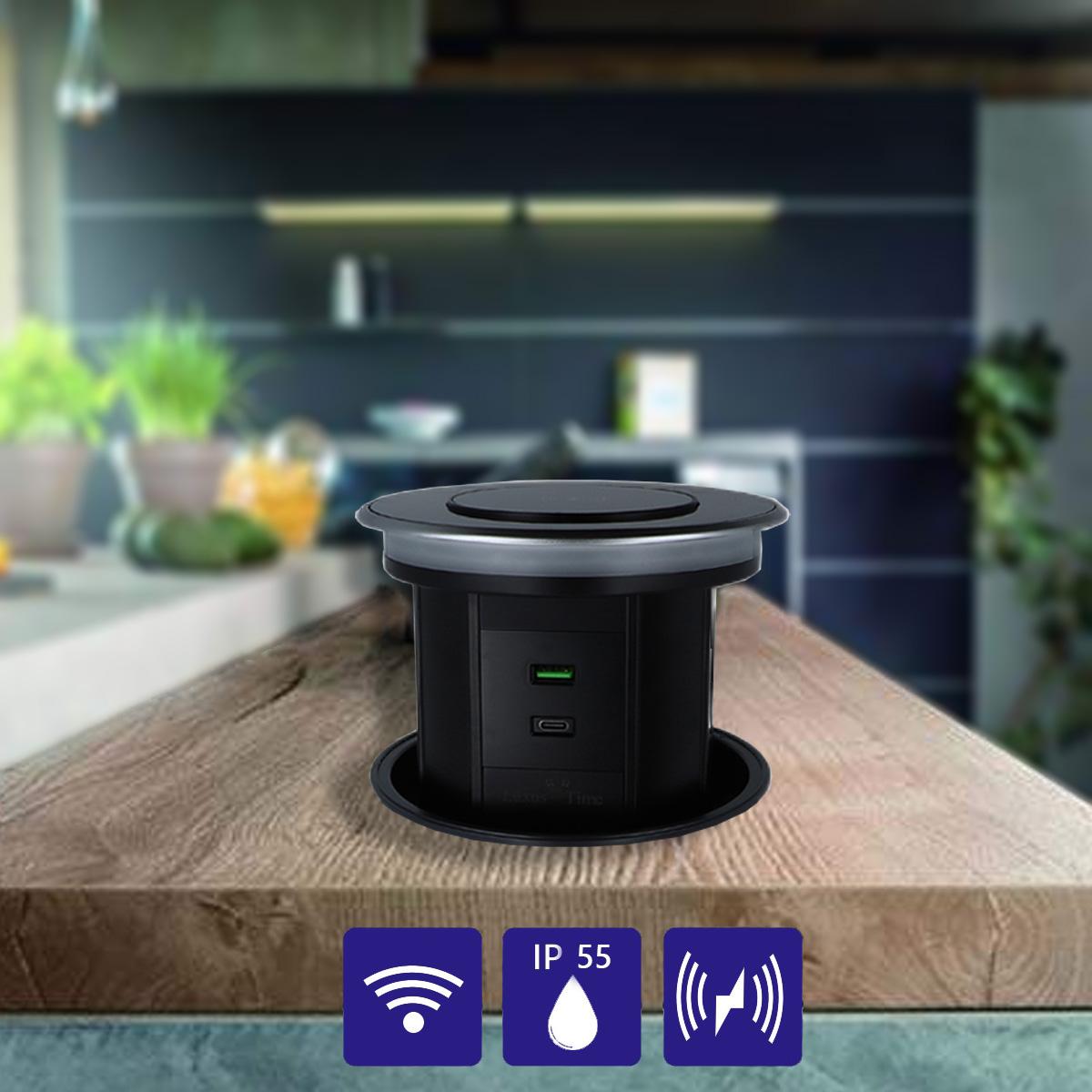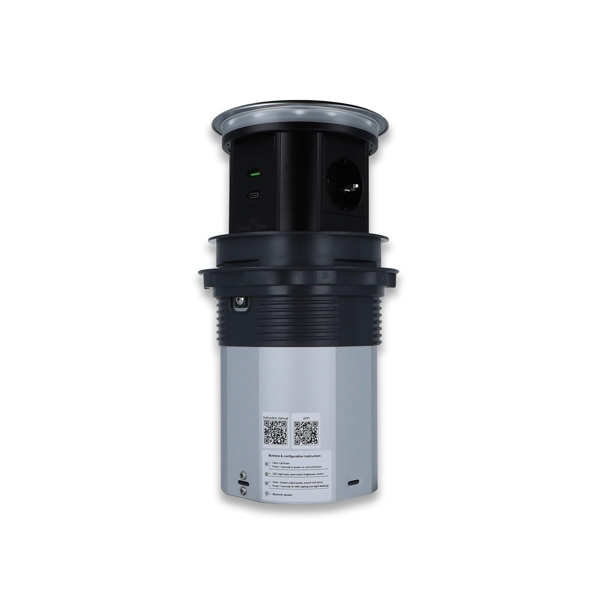 WLAN-Tischsteckdose in Glas-Optik mit 3 Steckdosen und USB-A&C-AnschlussDiese Tischsteckdose mit integrierter Induktions-Ladestation kann z. B. in Tischplatten verbaut werden, um die Küchenarbeitsfläche oder den Schreibtisch ordentlicher aussehen zu lassen. Über die WLAN-Funktion (SmartLife App) lässt die Tischsteckdose sich ein- oder ausfahren und die Steckdosen schalten. Zusätzlich verfügt die Tischsteckdose über ein dimmbares Nachtlicht, dass über die App oder an der Tischsteckdose selbst bedient werden kann. Mit den drei eingebauten Steckdosen, sowie je einem USB-A und USB-C Anschluss bietet die Tischsteckdose genügend Anschlussmöglichkeiten. Durch die Induktions-Ladefläche auf der Oberseite ist sowohl im ein- als auch ausgefahrenem Zustand das Laden eines Smartphones o. ä. problemlos möglich. Er bietet auch im Alltag ein hohes Maß an Flexibilität, da bei Nichtgebrauch der Deckel komplett versenkt werden kann und somit sehr unauffällig ist. Die Tischsteckdose wird mit dem angeschlossenen Kabel + Schuko-Stecker einfach in der nächsten Steckdose eingesteckt. Es ist keine Elektroinstallation von Nöten. Technische Daten: